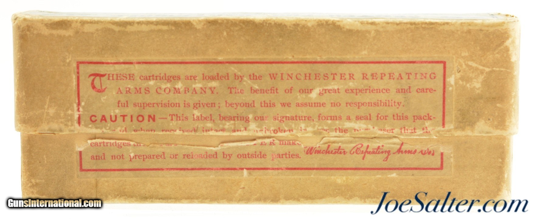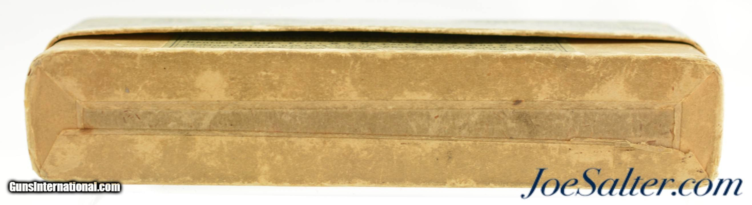 Description: This is a full box, 20 rounds, of .45-75 W.C.F. Black Powder "Centennial" 1876 ammunition manufactured by By Winchester for the Centennial Model 1876 rifle. The Green and black round corner box has the top label with "TRADE MARK REGISTERED IN U.S.A." making this a circa 1903-1905 box and was the last of the very desirable ones to carry the "MODEL "CENTENNIAL" 1876" labeling below the Cartridge Cut. This example is in near excellent condition with crisp graphics, having only minor flaking and rub wear on the edges with a solid box. The cartridges are in excellent condition. An important caliber for the Winchester collector and the last of "Centennial" marked box series. Price: $395.00 Contact Seller |