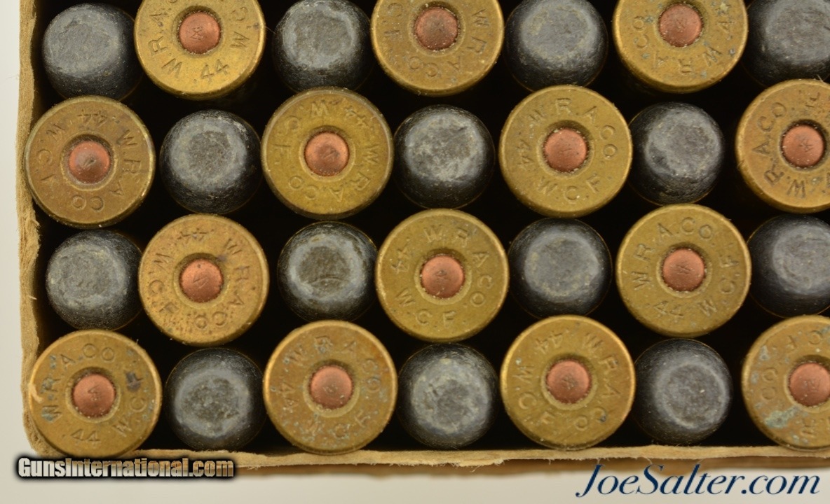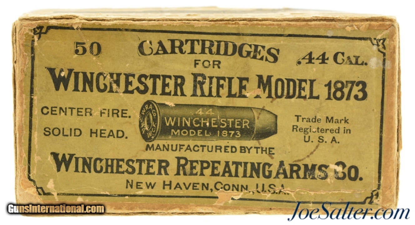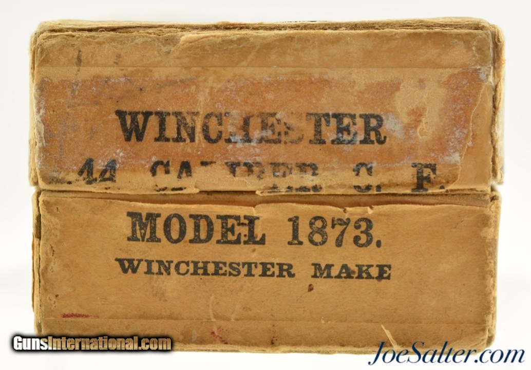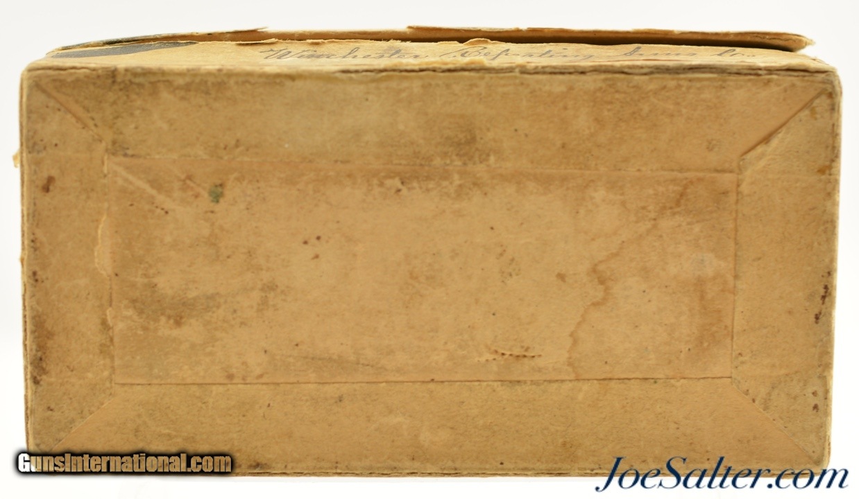 Description: This is a full box, 50 rounds, of .44 WCF (.44-40) ammunition manufactured by Winchester. The early 1900's (circa 1902-05) two piece, black powder box has a very nice primary label with "Center Fire" call out and a nice cartridge cut showing some small staining and a tiny flaking. The side seal label has the desirable cut of a model 1873 rifle with the later graphic which no longer showed a forward band and has a carbine sight. The box has professional repairs to the inside seams with overall light soiling and flaking. The cartridges appear correct for the box but perhaps not native and are in excellent condition. A very good-fine box that is much sought after by Model 1873 owners. SOLD |