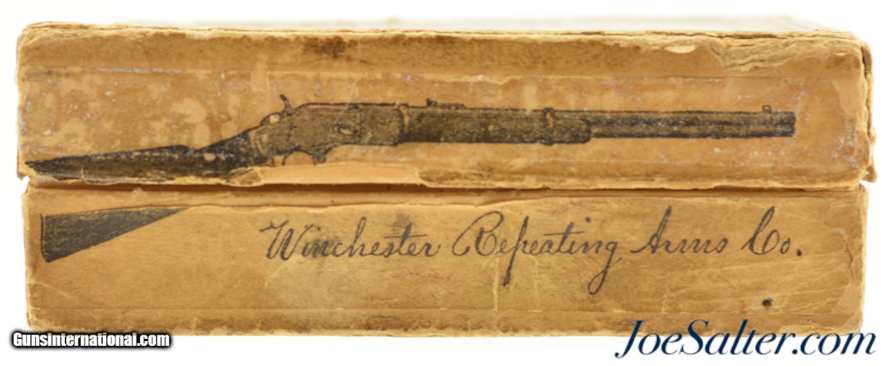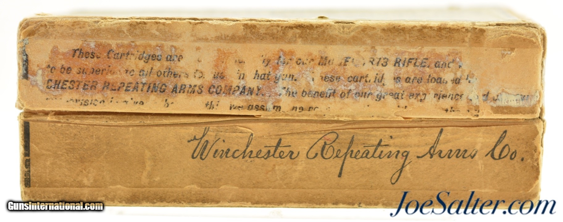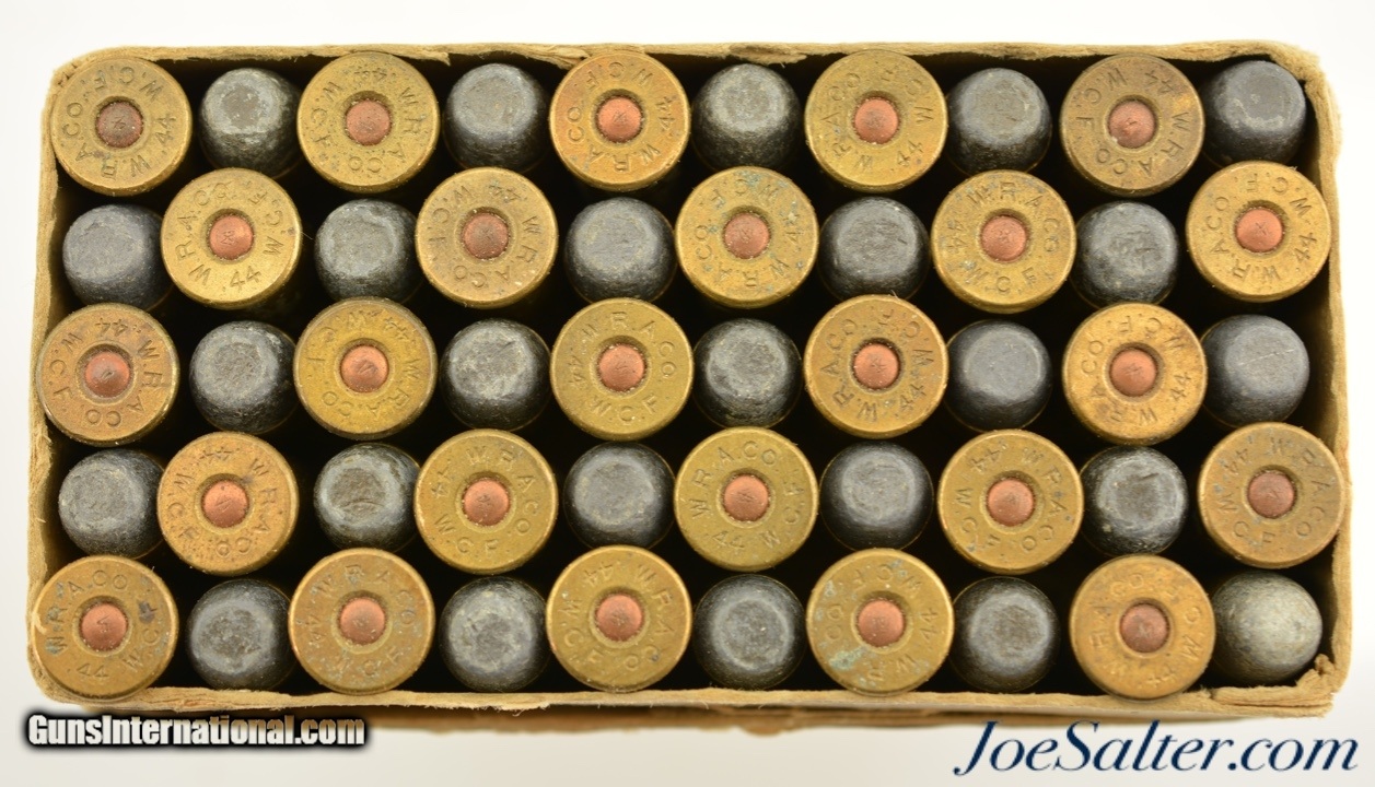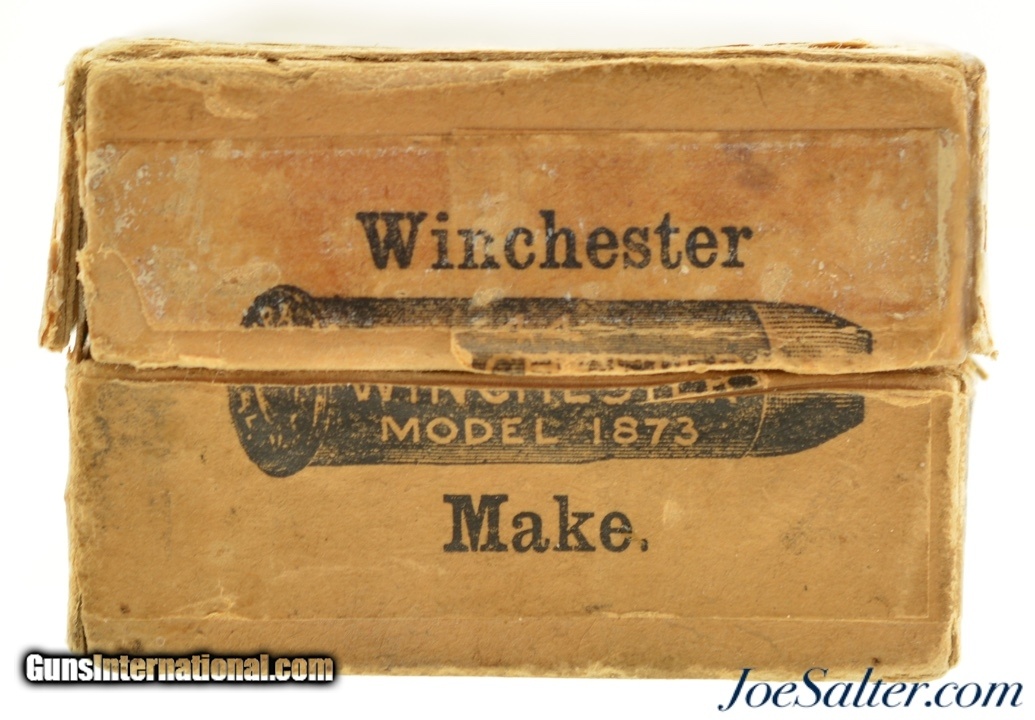 Description: This is a full box, 50 rounds, of .44 WCF (.44-40) ammunition manufactured by Winchester. The early 1900's (circa 1902-05) two piece, black powder box has a very nice primary label with "Center Fire" call out and a nice cartridge cut showing some small staining and a tiny flaking. The side seal label has the desirable cut of a model 1873 rifle with the later graphic which no longer showed a forward band and has a carbine sight. The box has professional repairs to the inside seams with overall light soiling and flaking. The cartridges appear correct for the box but perhaps not native and are in excellent condition. A very good-fine box that is much sought after by Model 1873 owners. SOLD |