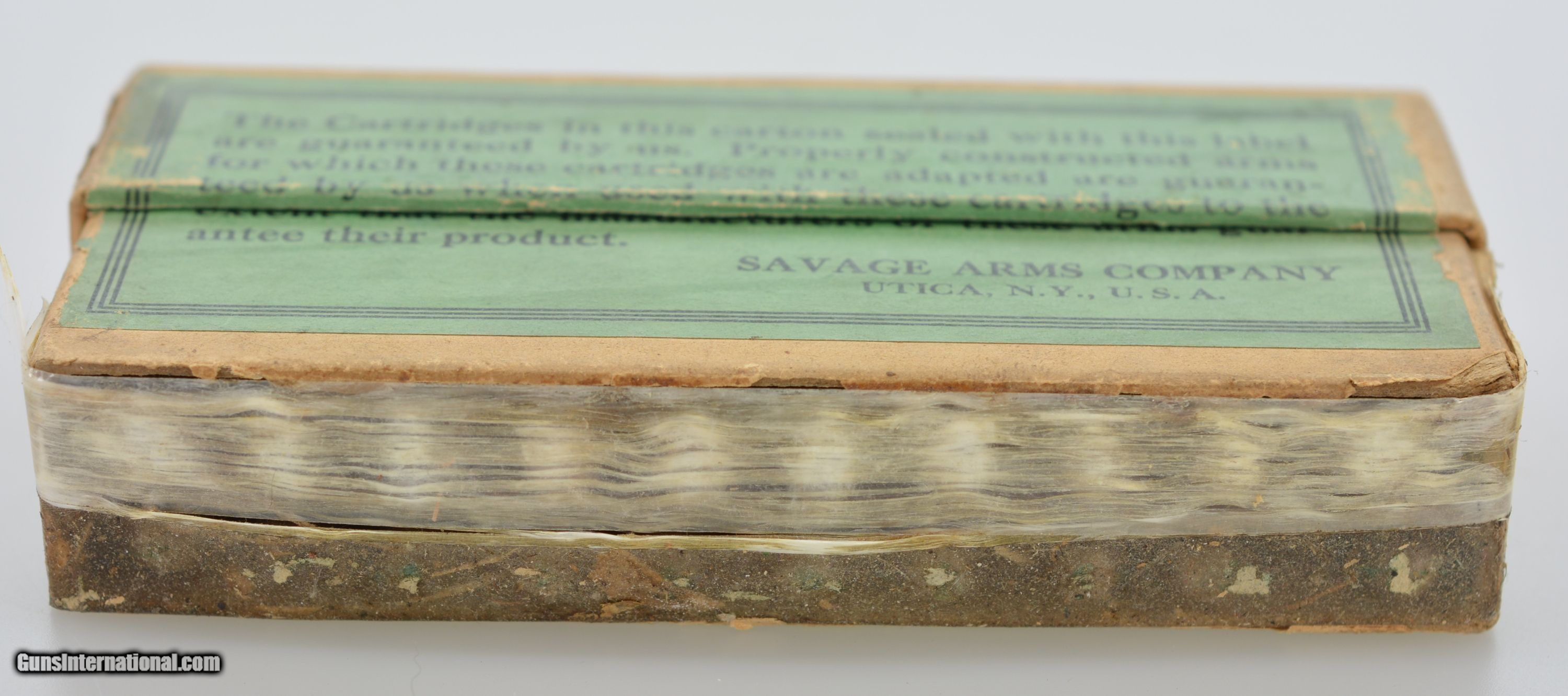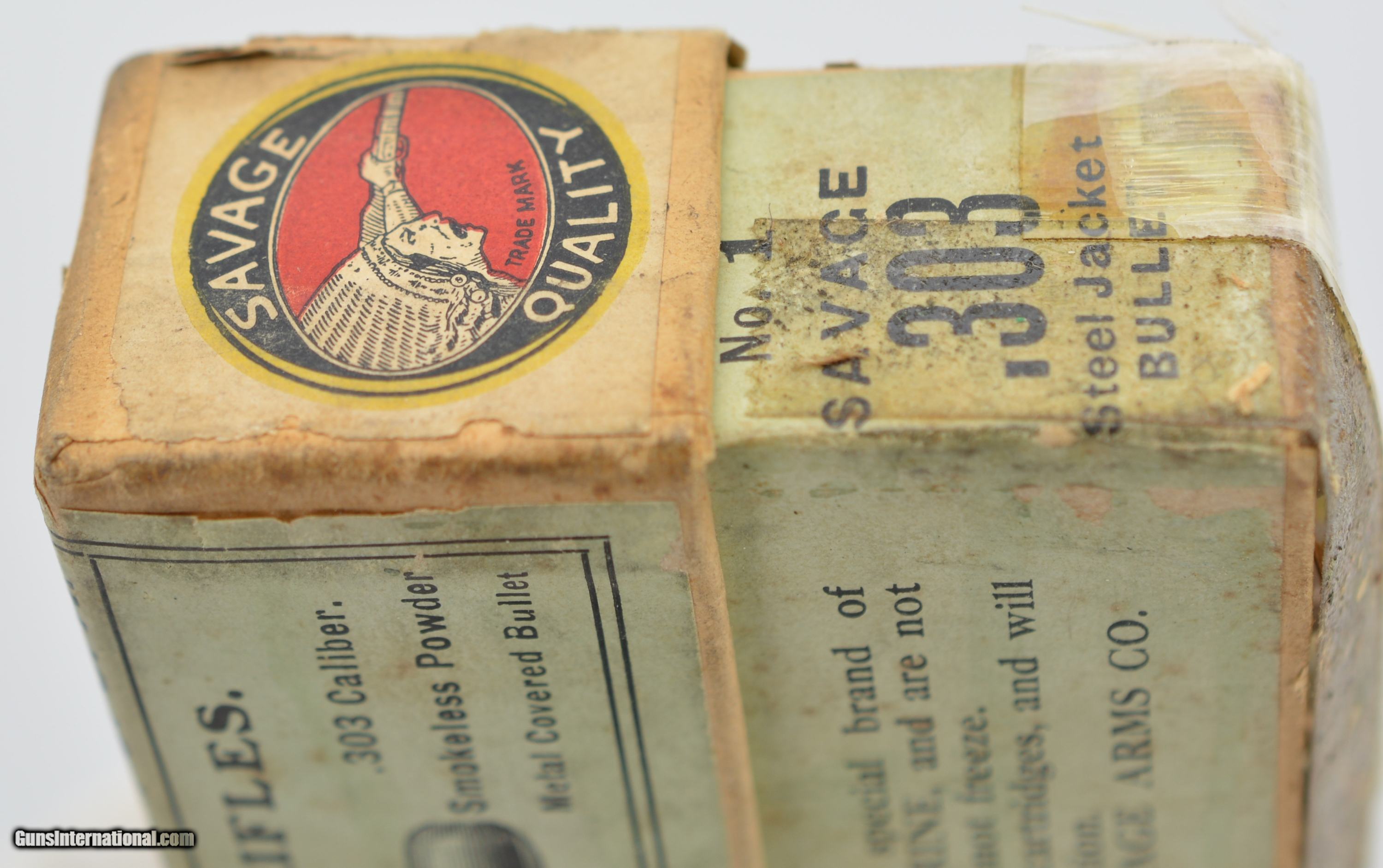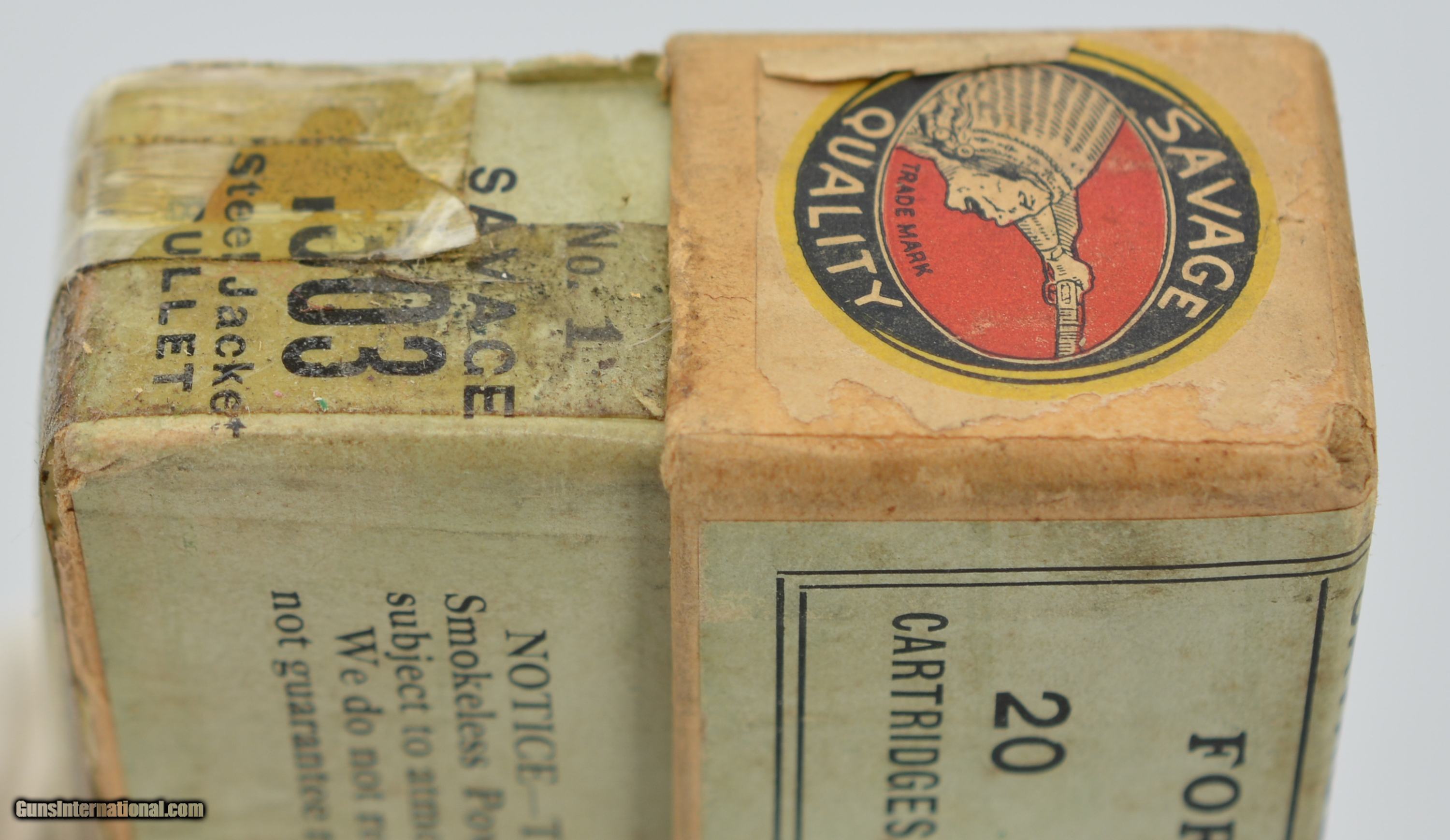 Description: This is an early, full, two piece, small Indian, .303 Savage box. The primary top and side labels are near excellent showing a great cartridge cut and red and black Savage logo with only a small piece missing on the top. The top portion of the box and side portion of the bottom are near excellent with sound corners, and very light soiling in some places, however, the bottom of the box is missing and the shells are held in place with tape. The original “S.A. Co." headstamped cartridges are present, some having a dark patina and light oxidation on the primers. When repaired this will be a fantastic addition to your Savage collection. SOLD Manufacturer: Savage Model: Ammo |
