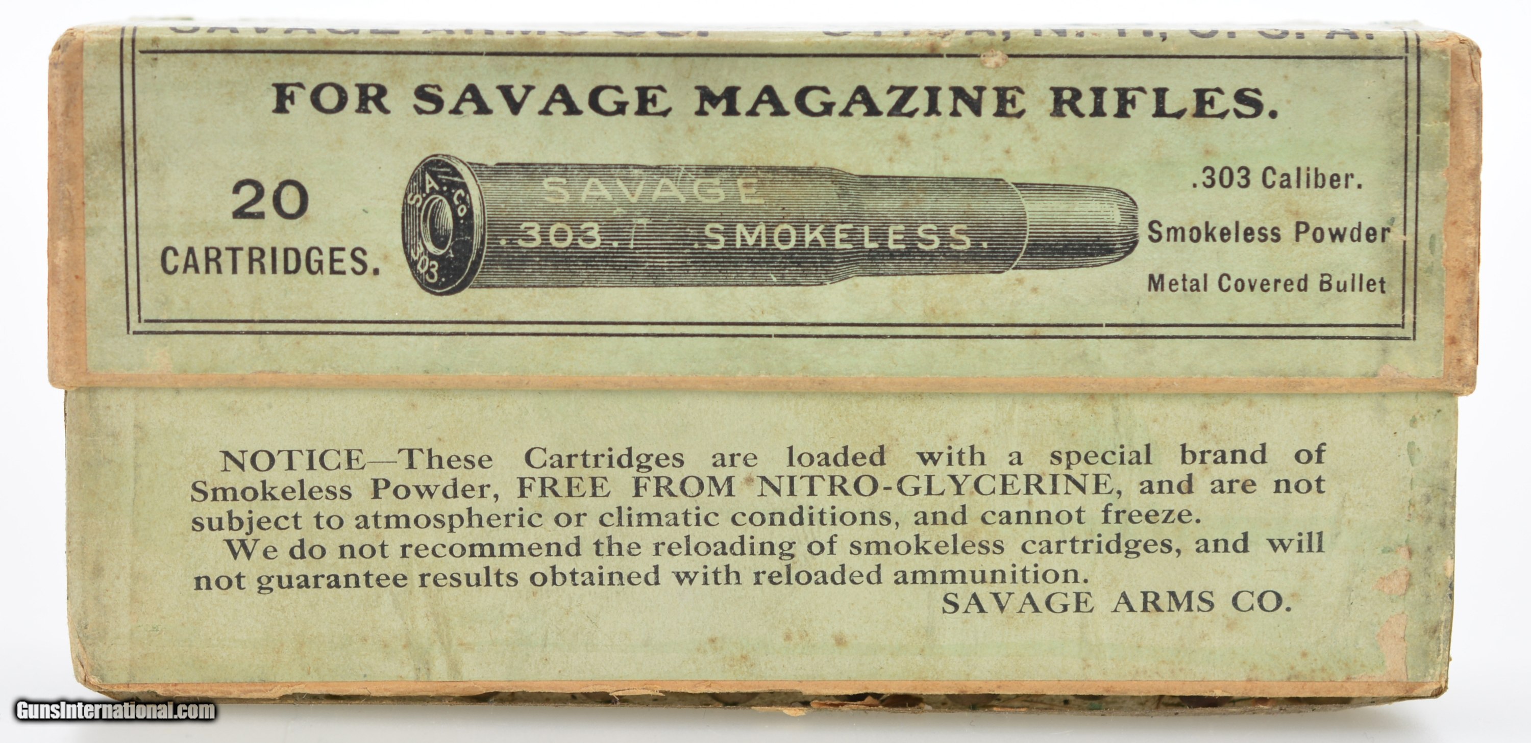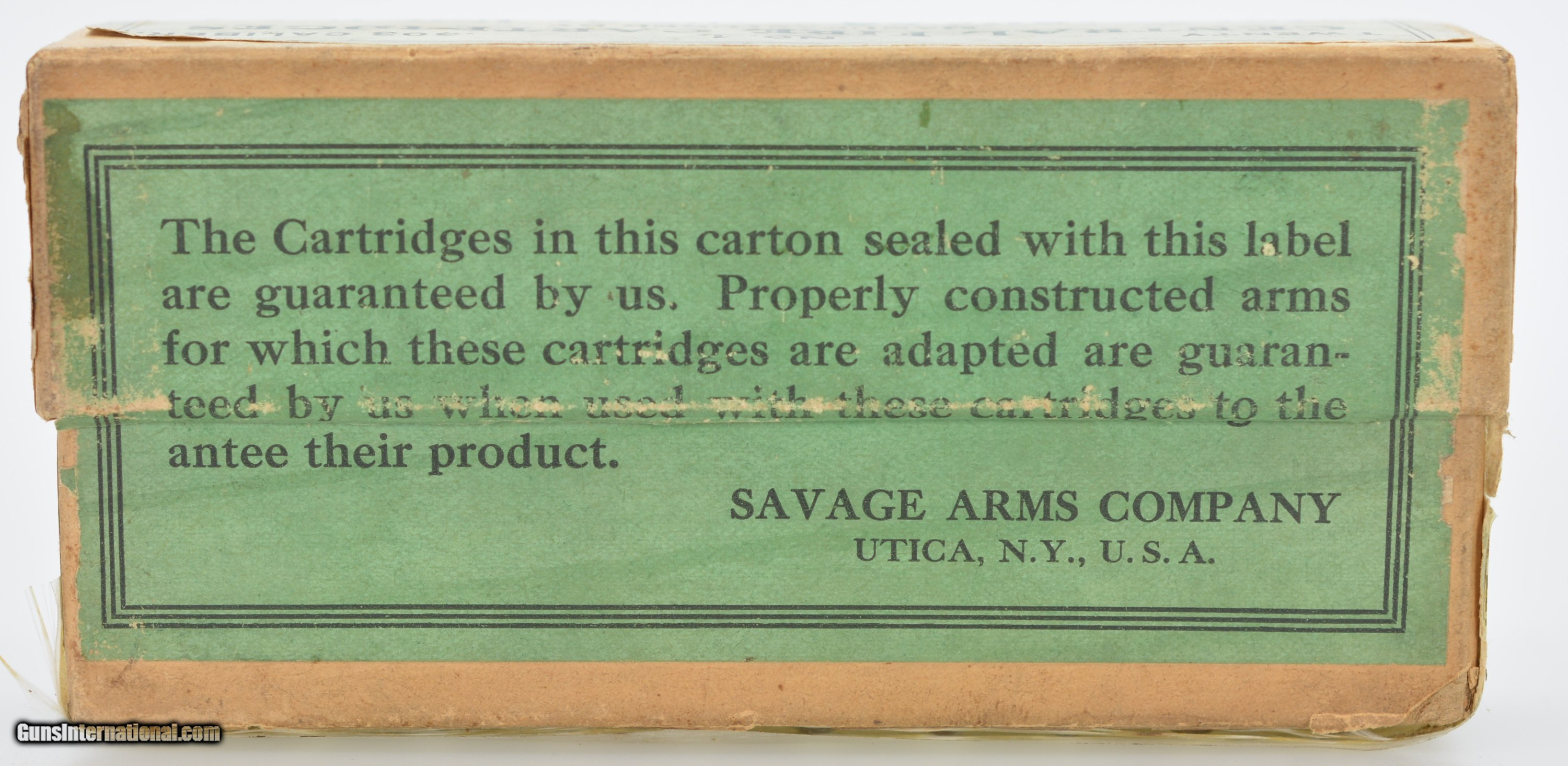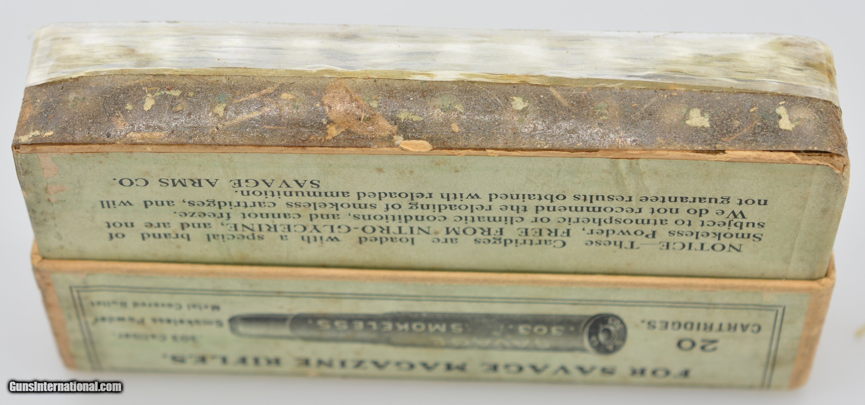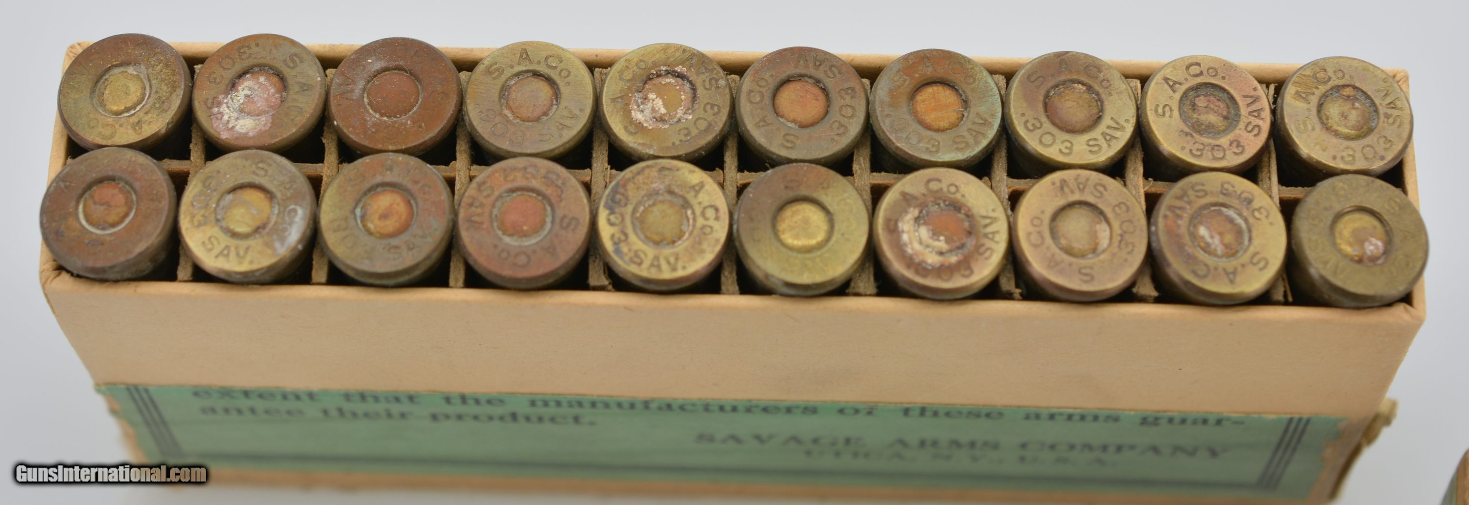 Description: This is an early, full, two piece, small Indian, .303 Savage box. The primary top and side labels are near excellent showing a great cartridge cut and red and black Savage logo with only a small piece missing on the top. The top portion of the box and side portion of the bottom are near excellent with sound corners, and very light soiling in some places, however, the bottom of the box is missing and the shells are held in place with tape. The original “S.A. Co." headstamped cartridges are present, some having a dark patina and light oxidation on the primers. When repaired this will be a fantastic addition to your Savage collection. SOLD Manufacturer: Savage Model: Ammo |