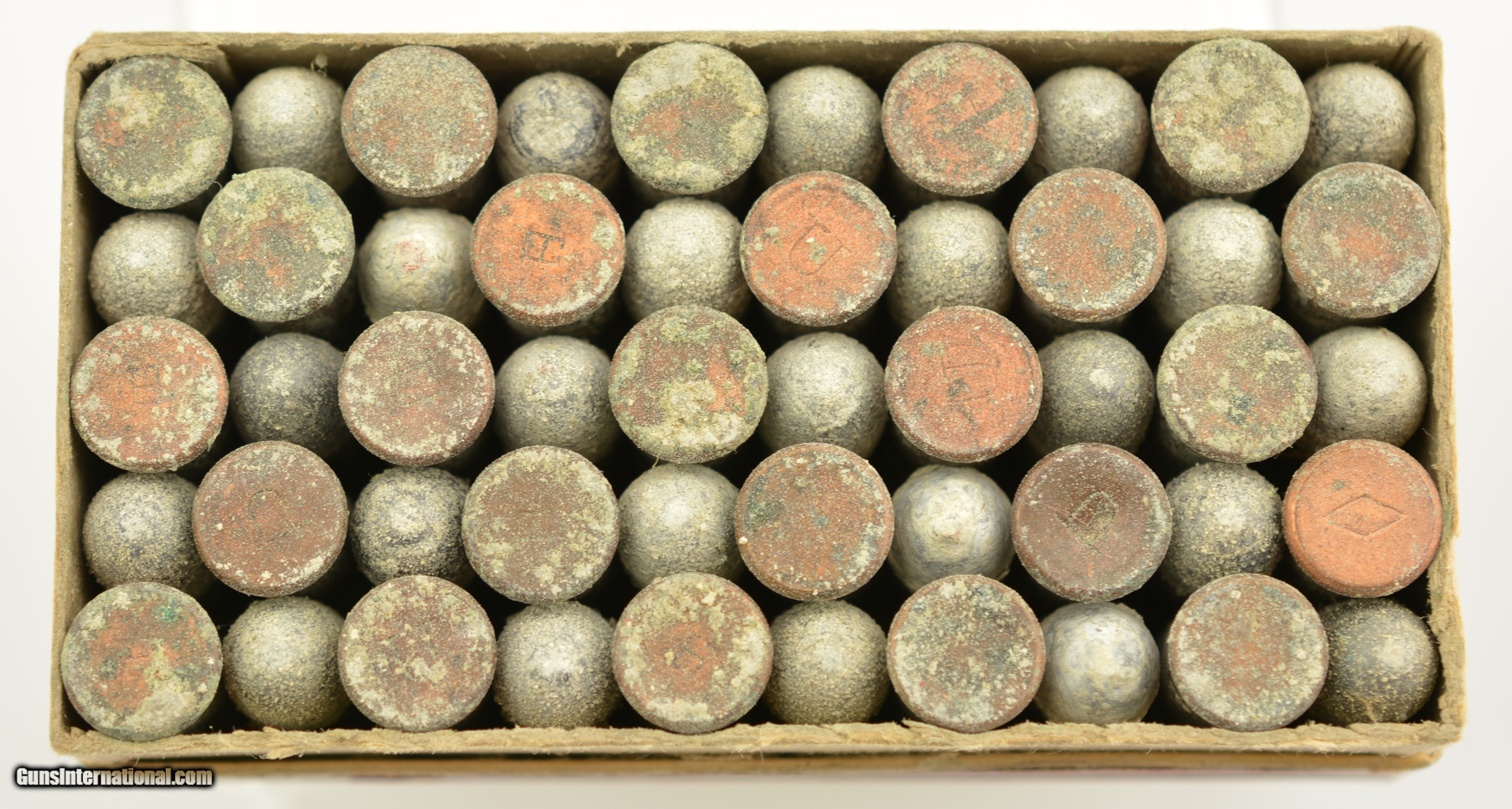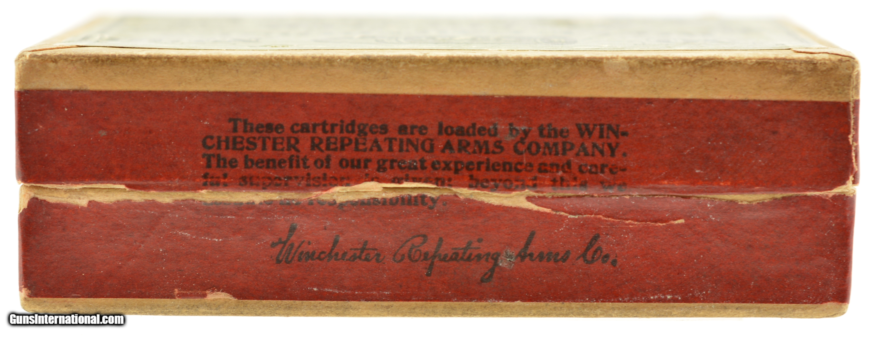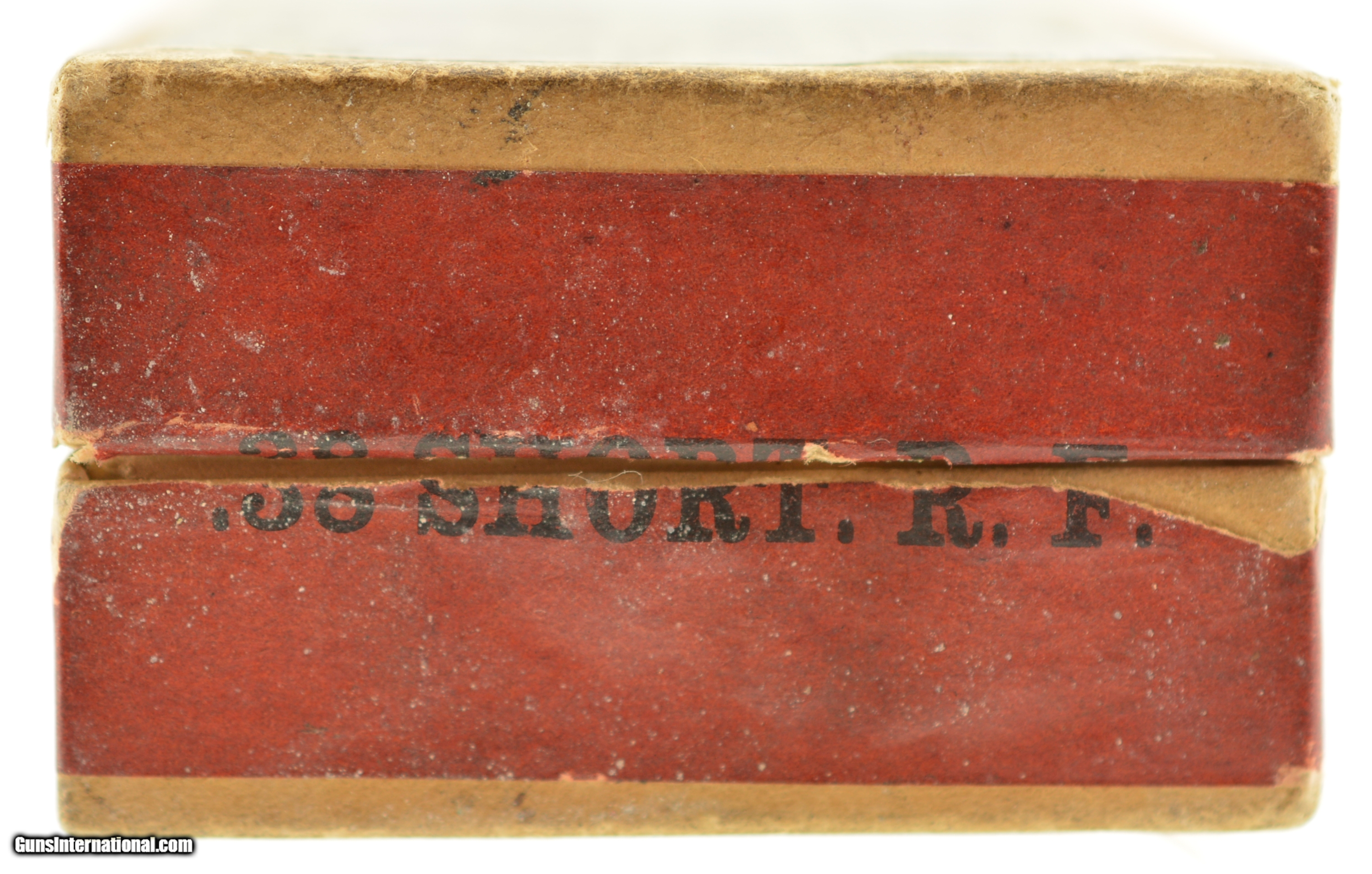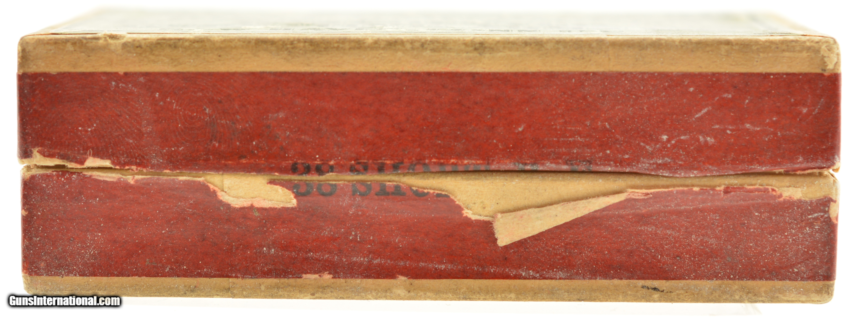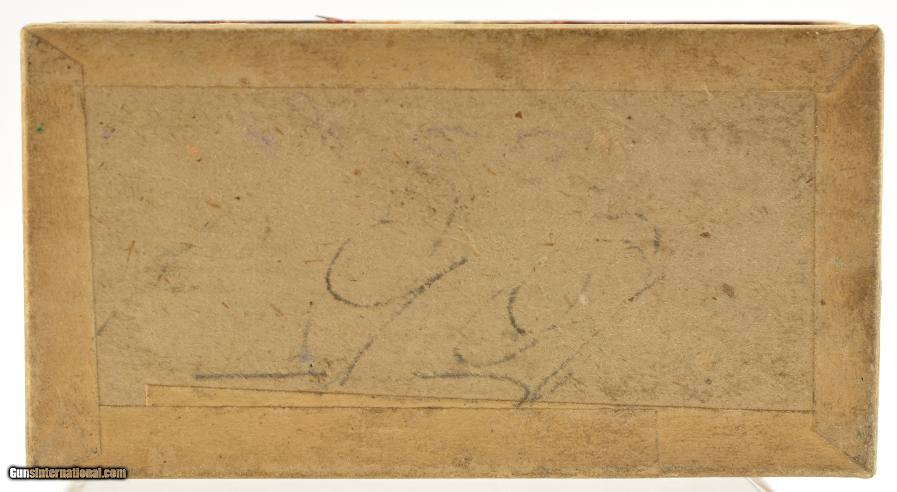 Description: This is a full, 50 mixed headstamp rounds, box of .38 Short rim fire, black powder ammunition manufactured by Winchester. The circa pre-1900's box has the incorrect Stetsons Patent date of Oct. 24 1871 and is in near excellent condition with clear graphics and good colors, solid with light staining and age soiling, some minor rub wear and spot flaking. The cartridges are a mixture of correct “H" head stamps with some “U", plain and diamond stamps as well with one having an indented bottom. SOLD Manufacturer: Winchester Model: Ammo |