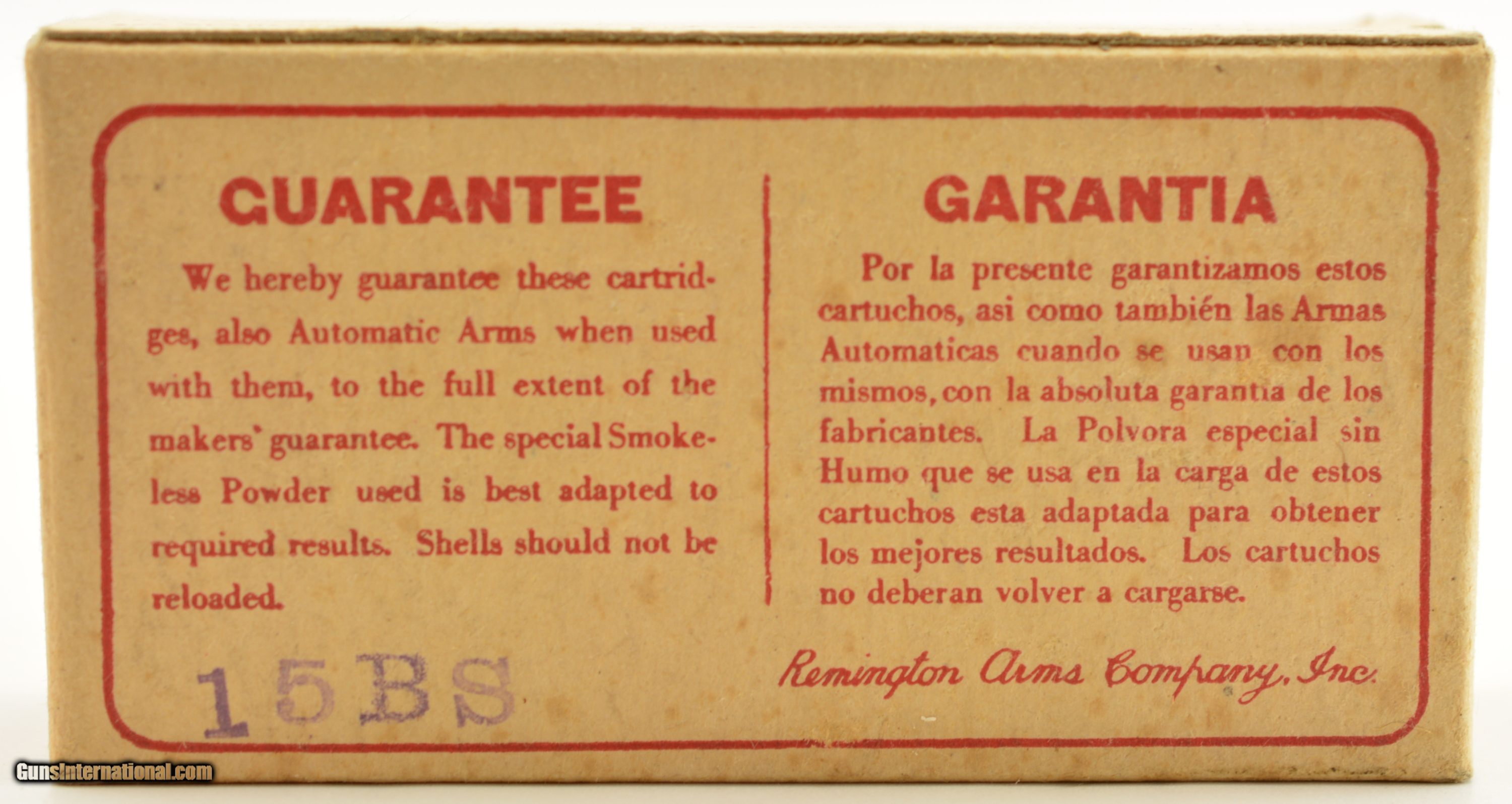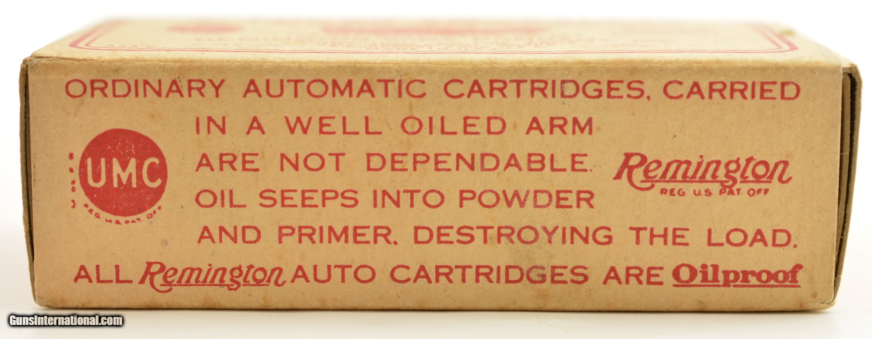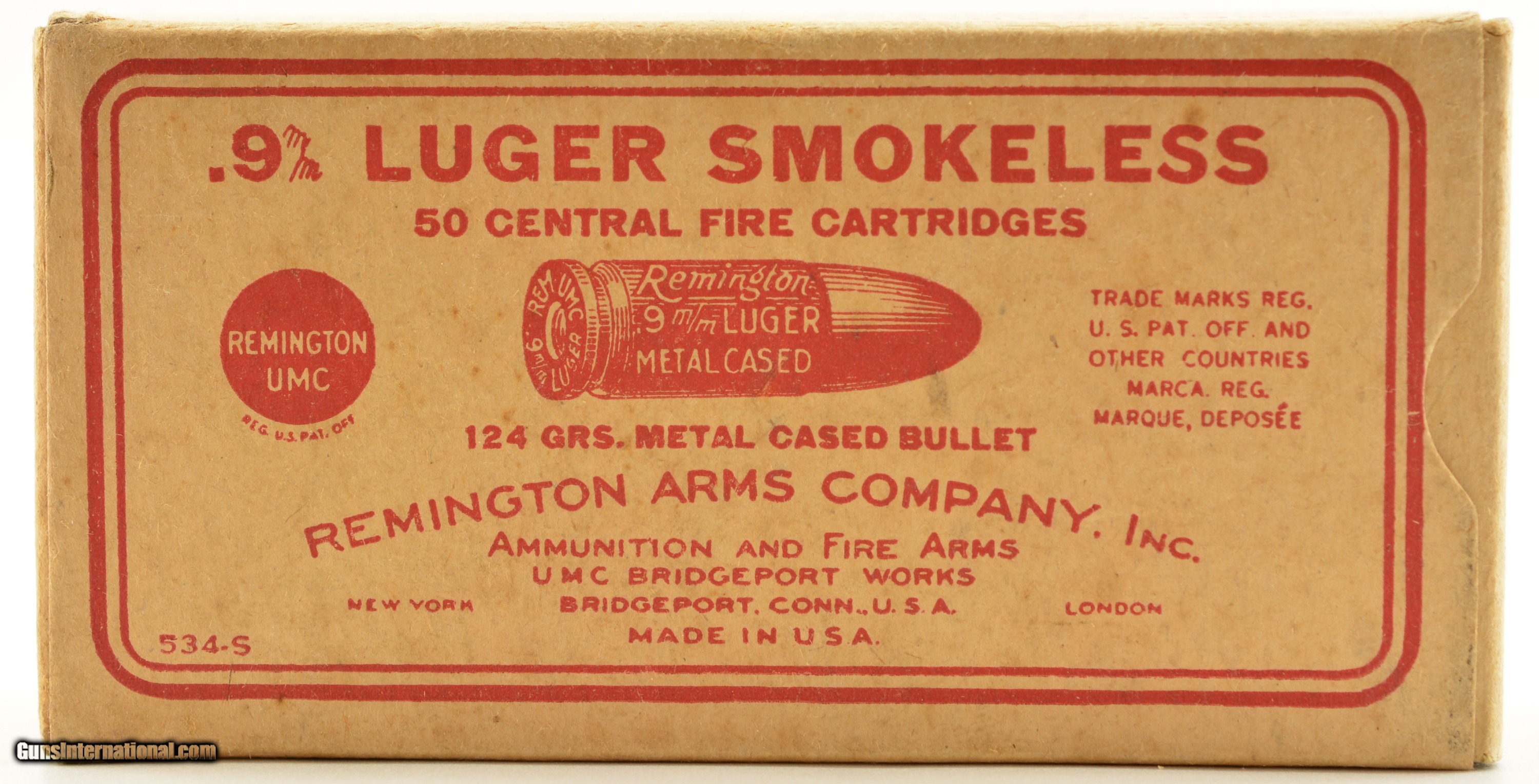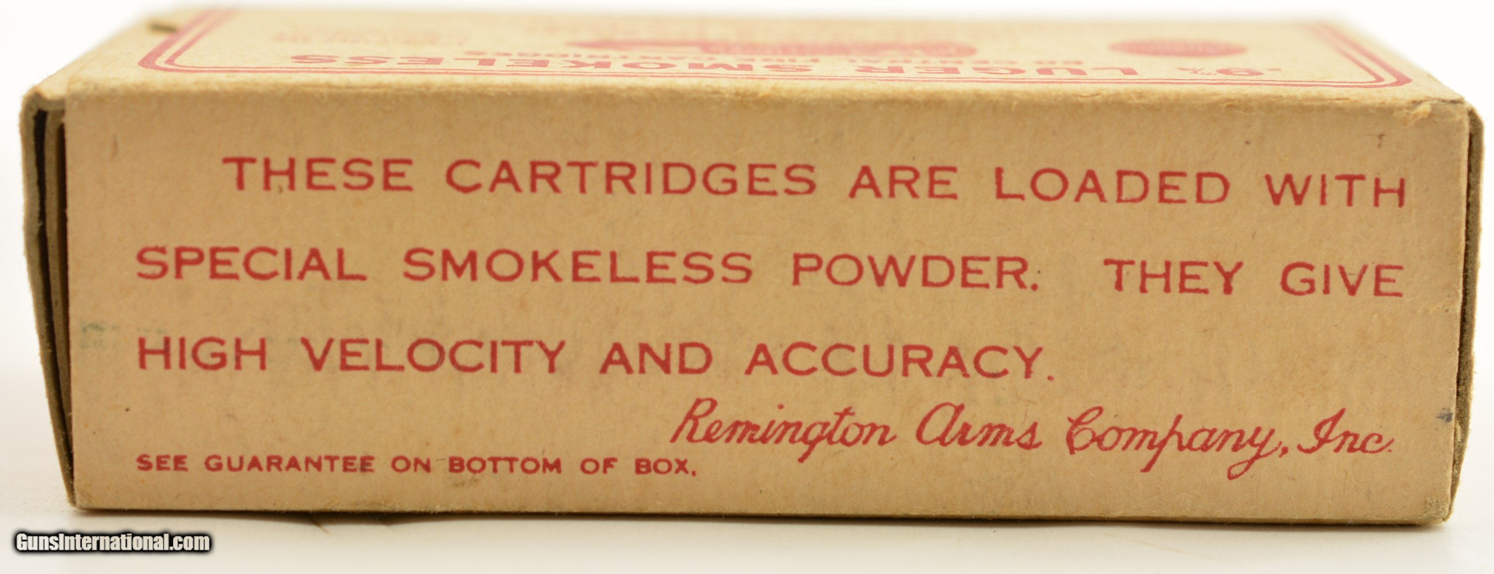Description: This is a full box, 50 original rounds, of 9mm Luger ammunition manufactured by Remington in the mid 1920's. The one piece yellow/buff box with red overprint has thumb cut and slide out tray with early oilproof and smokeless powder call outs. In excellent condition the box has very slight corner edge wear with crisp graphics. An excellent collector grade display box for your World War I era gun. SOLD Manufacturer: Remington Model: Ammo Caliber Info: 9mm Luger Gauge Info: 9mm Luger |