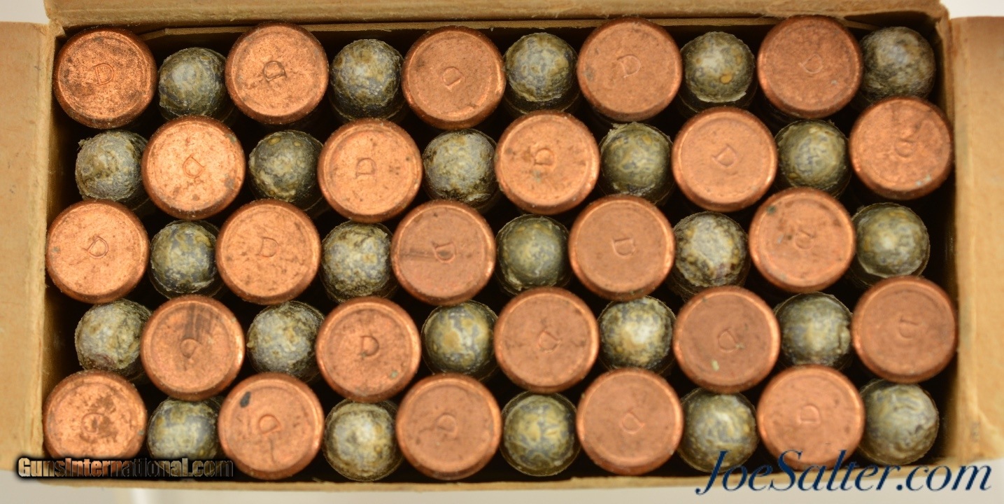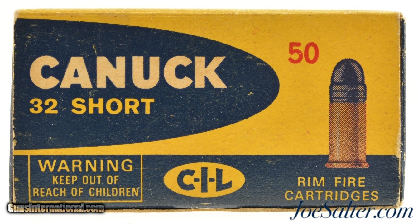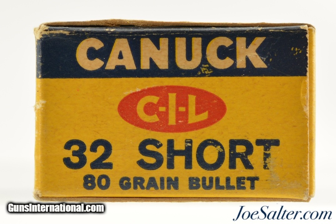 Description: This is a full box, 50 original rounds, of .32 Short RF Canuck ammunition manufactured by C-I-L in Canada with 80 grain copper coated lead bullets. The classic yellow, blue and red one piece box was manufactured in Montreal, Canada by Canadian-Industries-Limited and is in excellent condition. The cartridges are also in excellent condition. SOLD |