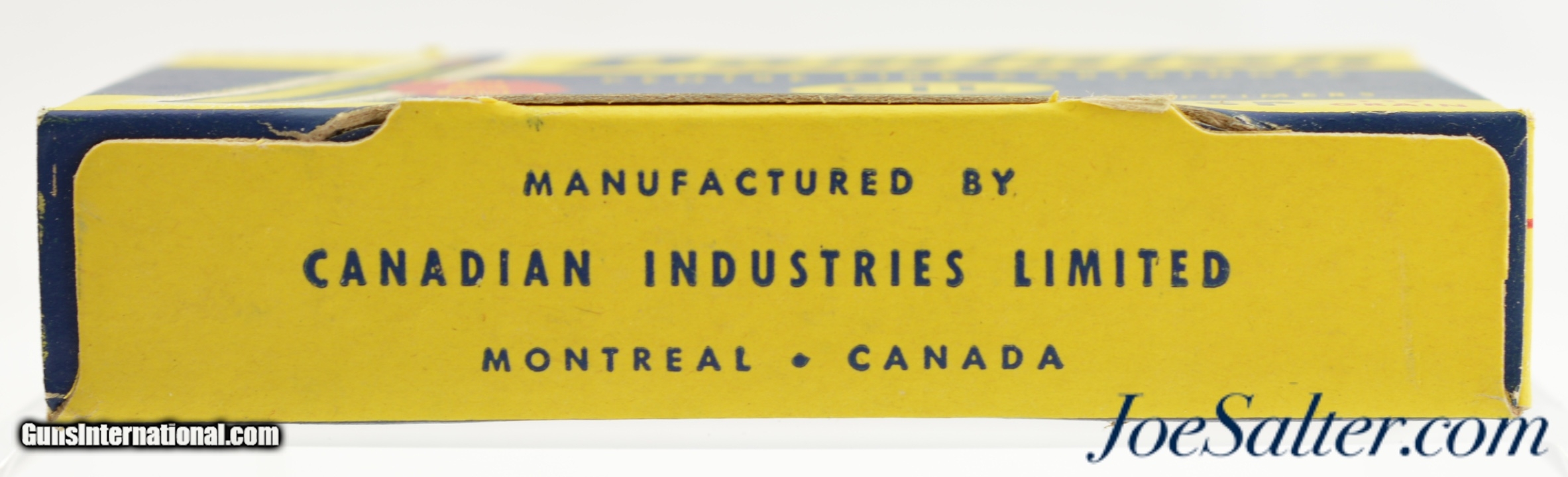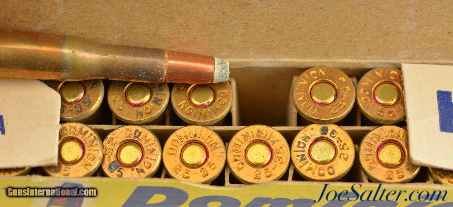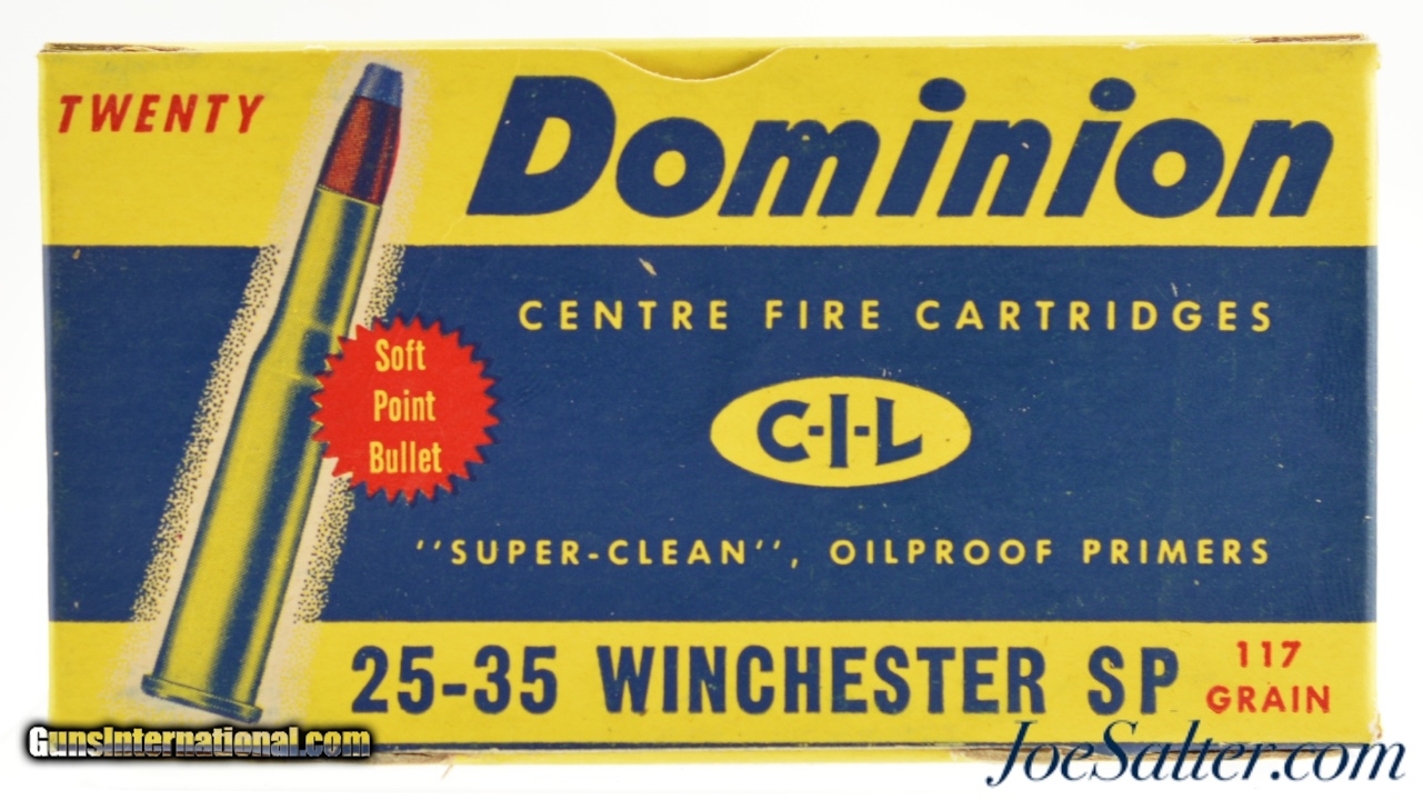 Description: This is a full box of Dominion .25-35 ammunition manufactured in Canada by C-I-L with 117 Grain soft-point cartridges. The colorful yellow, blue and red, one piece box is in excellent condition with crisp clean graphics. The cartridges are native to the box and in excellent condition. A great display and / or shooter box.; SOLD |
