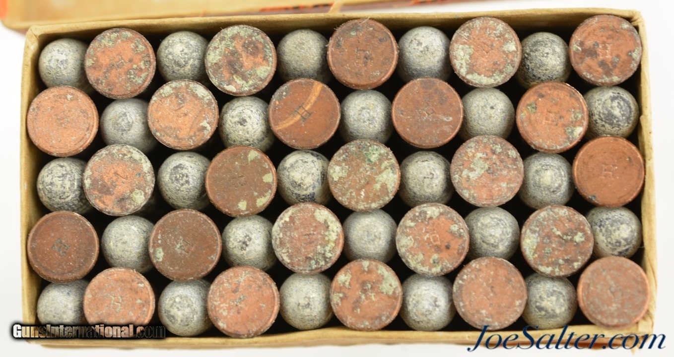 Description: This is a full box, 50 correct rounds, of .32 Short RF black powder ammunition manufactured by Winchester. The two piece box has an excellent primary and side seal labels with the top having the early "Metallic Cartridges" labeling with the incorrect Stetsons Patent date of Oct. 24, 1871 and an orange side seal label with the Lubricating patent date of Sept. 12, 1882 placing this box in the mid to late 1880's. In excellent condition the box is solid except for slight seam separation on one of the top corners with very mild age darkening. The Graphics remain excellent with only a few minor flakes marring the labels that have dark and crisp colors and a excellent cartridge cut. The cartridges are in excellent condition. A fantastic early Winchester box in a great caliber ready to pair with your antique pistol. SOLD |