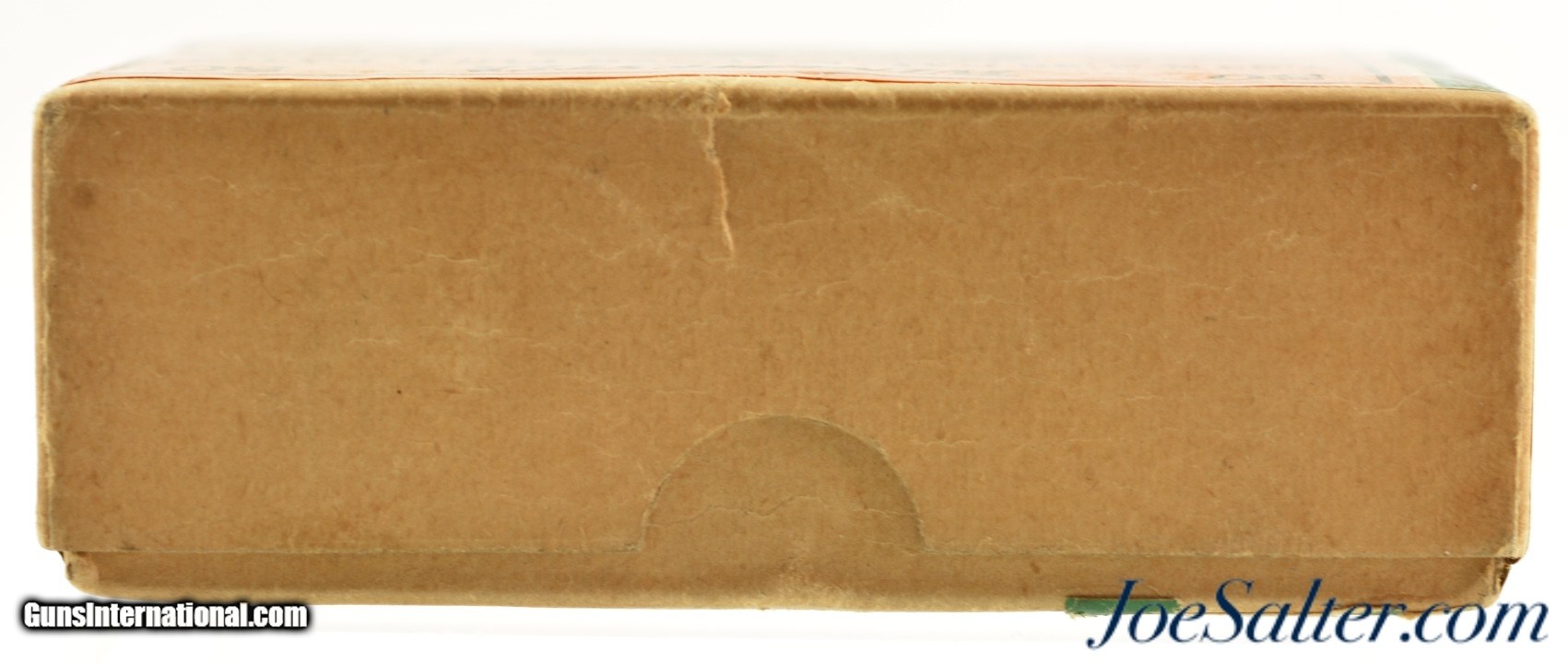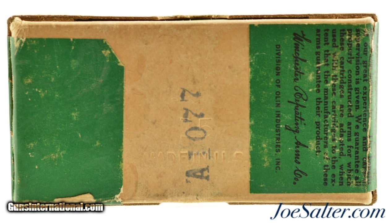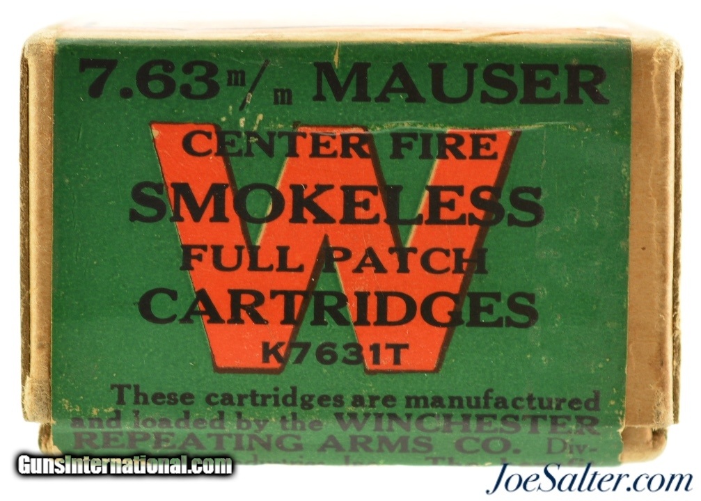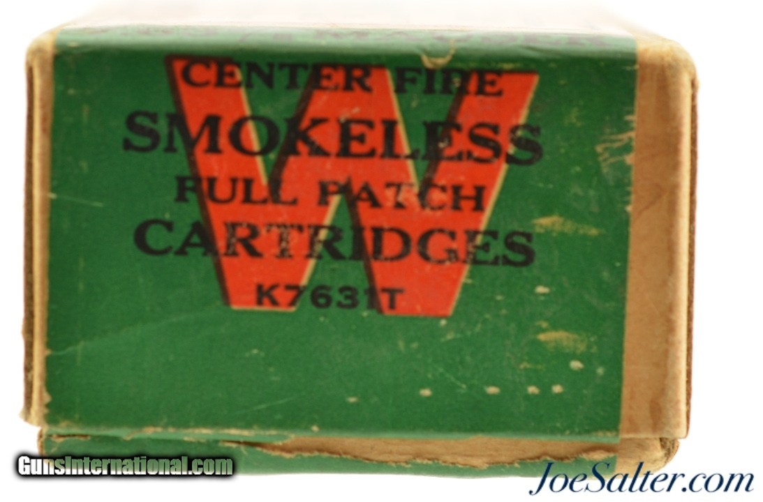 Description: This is a full box, 50 original rounds, of 7.63mm (.30 Mauser) ammunition manufactured by Winchester with 86 grain full patch bullets. The two piece buff box with orange and green labels is in excellent condition with intact Staynless labels showing a beautiful cartridge cut with bright colors. The box has the Olin Industries call out with "K7631T" code on the side. The cartridges are in excellent condition. A great display box! SOLD |