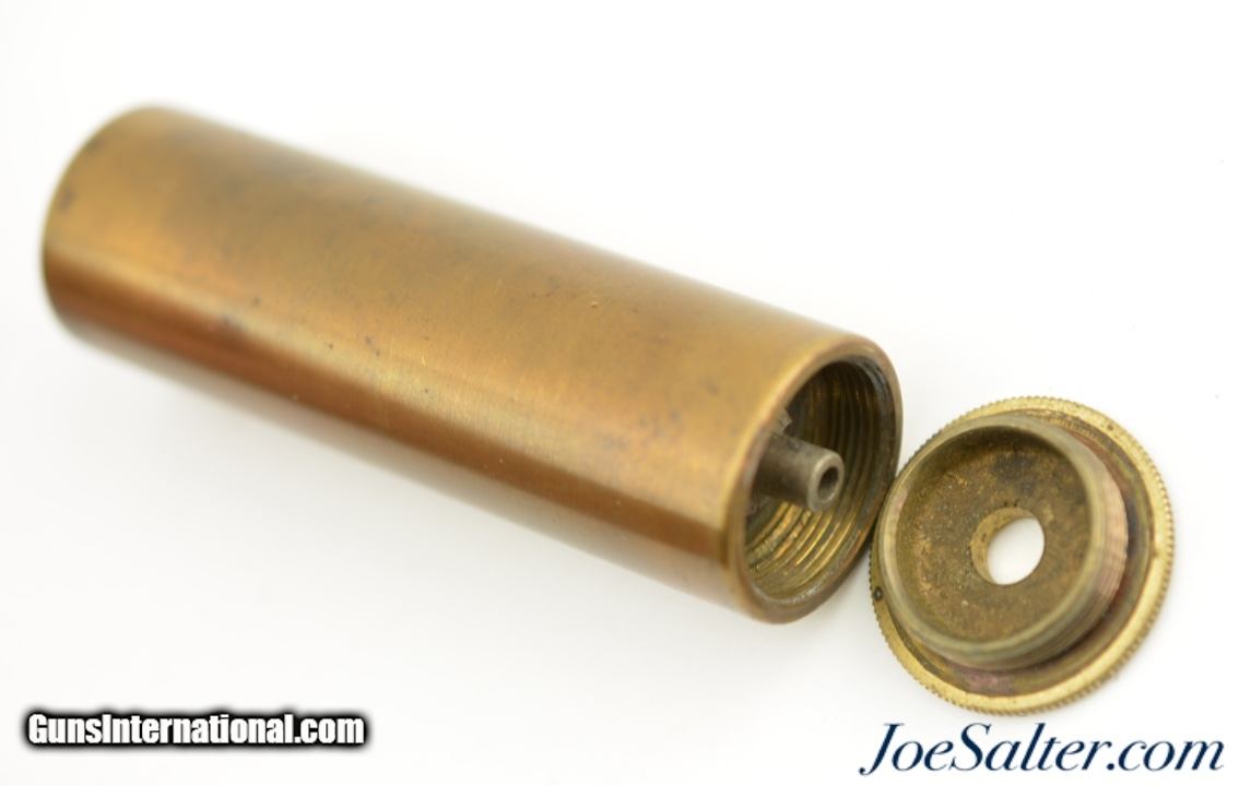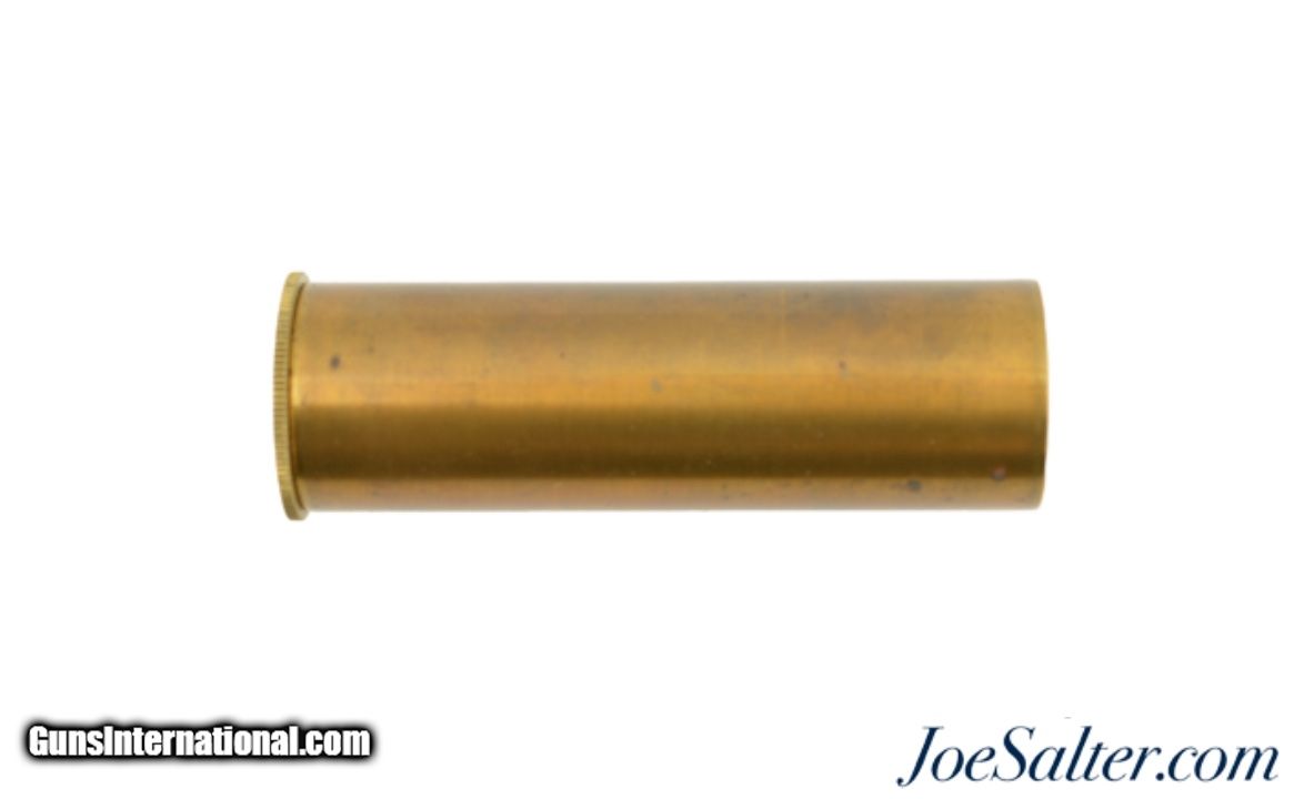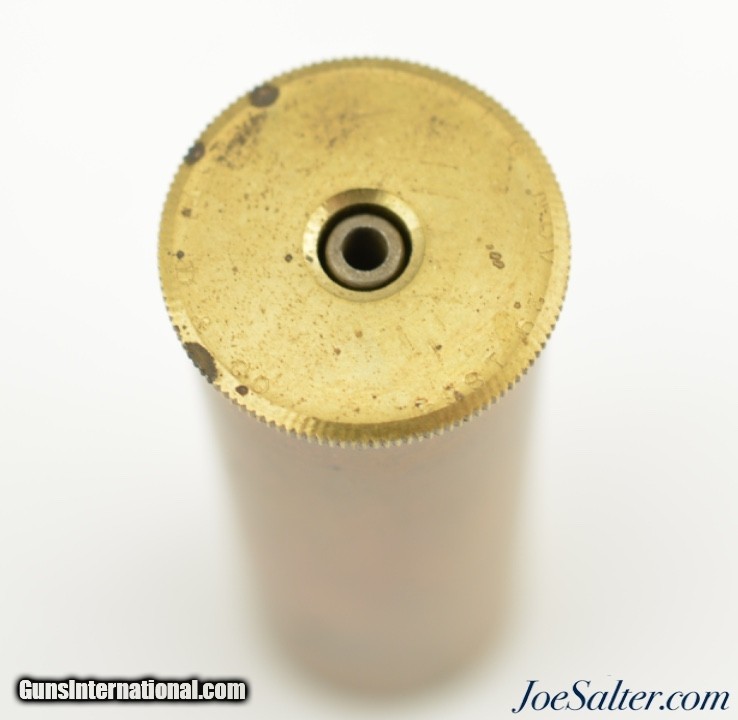 Description: This is a F. Draper & Co. patented shotgun shell that had a unique knurled rim which unscrews to allow for reloading with a percussion cap. They were patented by William H. Wills of Boston, MA and produced by F. Draper & Company of East Cambridge, Connecticut. The flat brass base is marked "F. D. & Co." / "Patented Nov 29 1864". In excellent condition the 12 gauge brass shell measures 2 ½ inches and appears to have seen little or no use with the end easily unscrewing which is not common for these. An outstanding example with a Civil War Patent date that will add to any cartridge collection and would be great to display with an antique shotgun. SOLD |