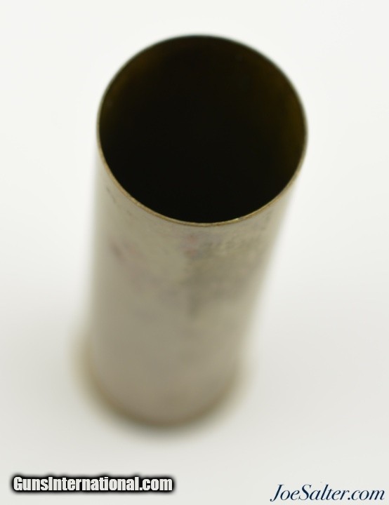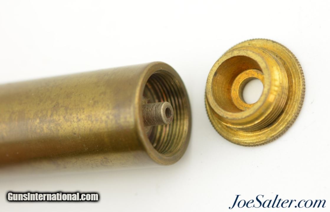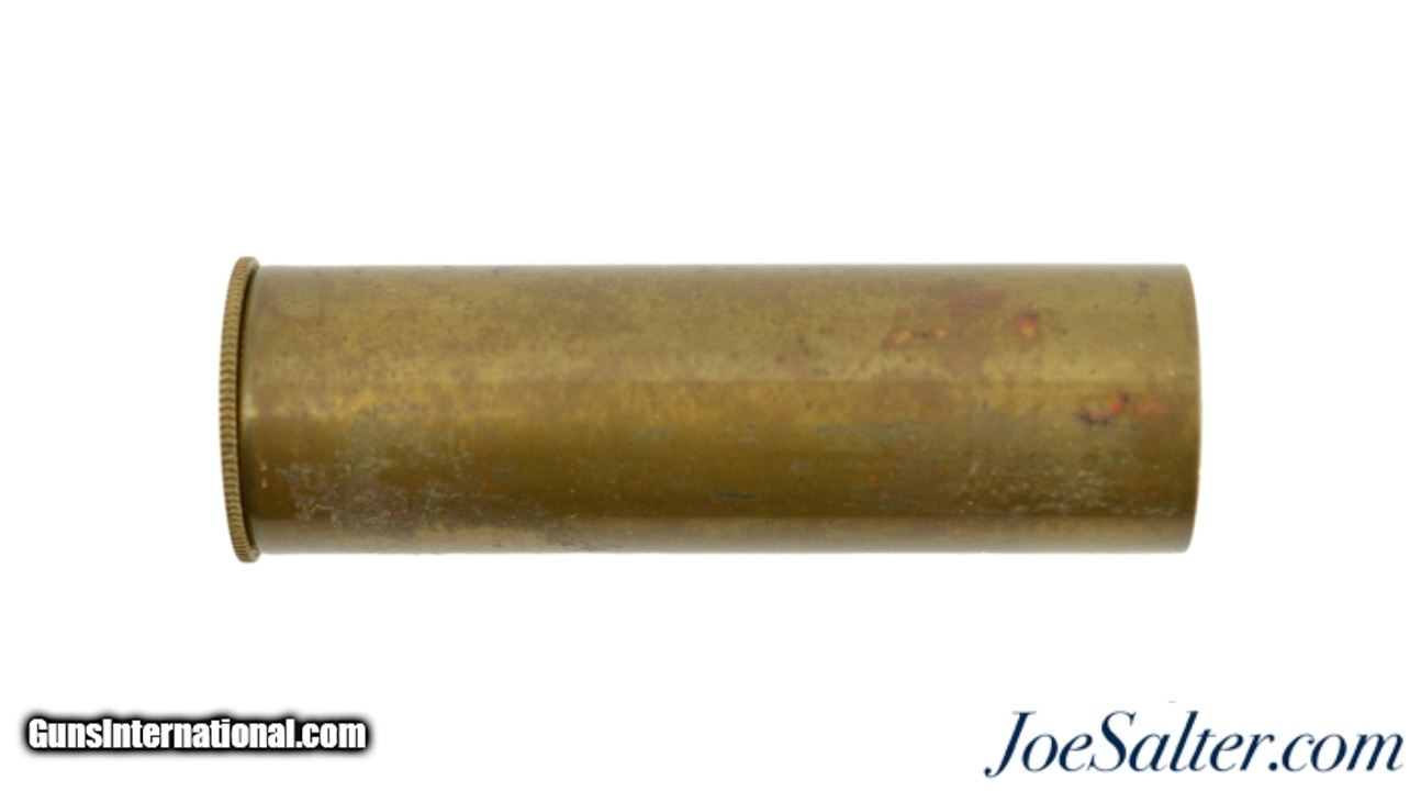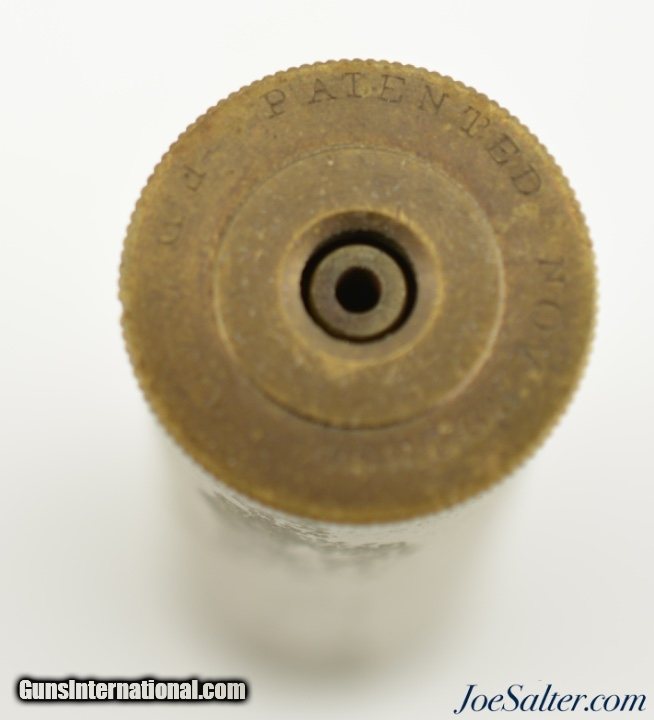 Description: This is a F. Draper & Co. patented shotgun shell that had a unique knurled rim which unscrews to allow for reloading with a percussion cap. They were patented by William H. Wills of Boston, MA and produced by F. Draper & Company of East Cambridge, Connecticut. The flat brass base is marked "F. D. & Co." / "Patented Nov 29 1864". In excellent condition showing slight age darkening and collector marking the 14 gauge brass shell measures 2 ½ inches and appears to have seen little use with the end easily unscrewing which is not common for these. An outstanding example with a Civil War Patent date that will add to any cartridge collection and would be great to display with an antique shotgun. SOLD |