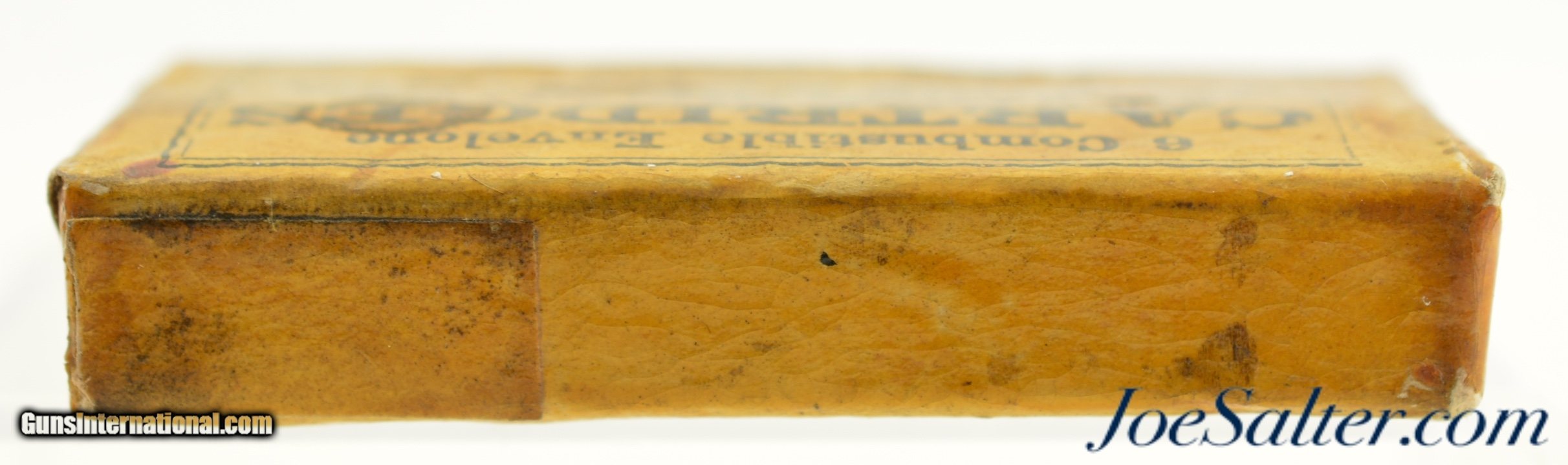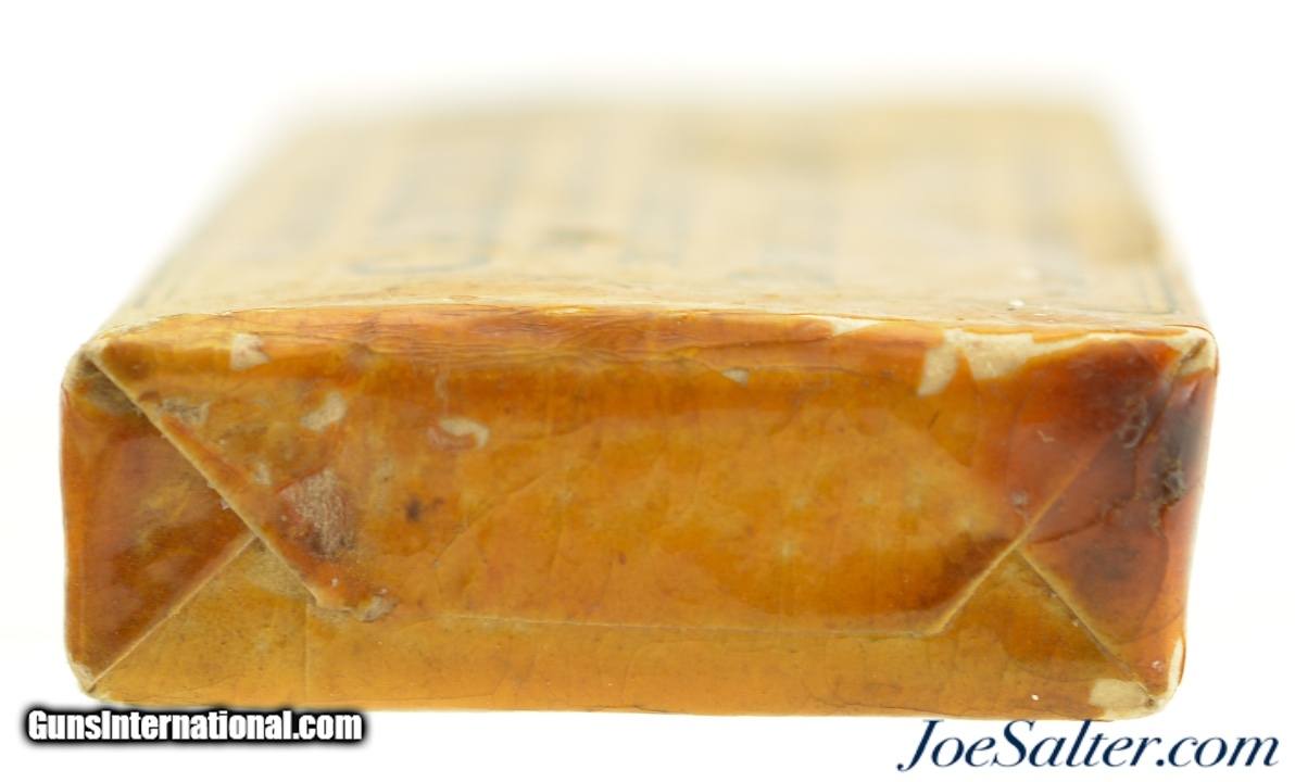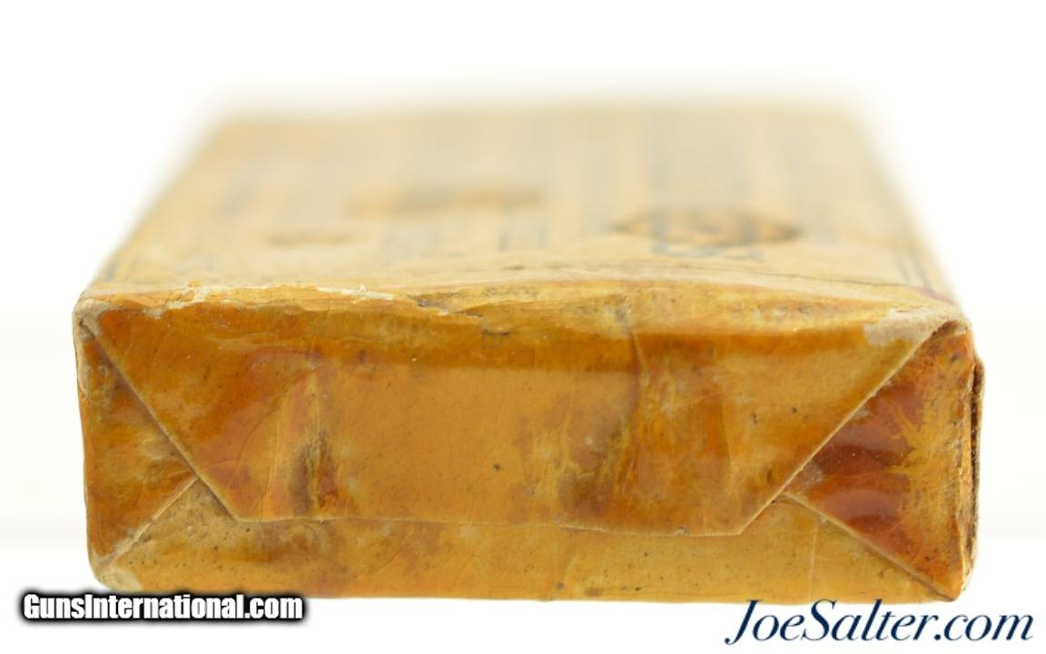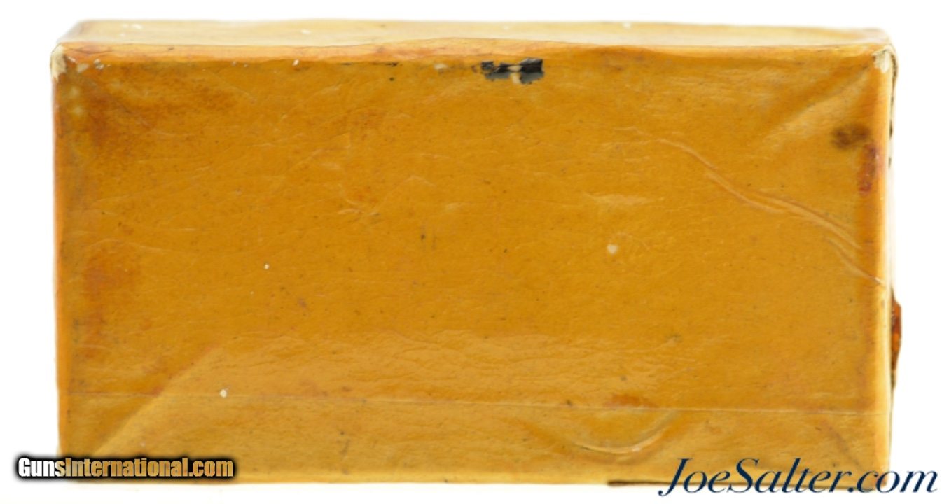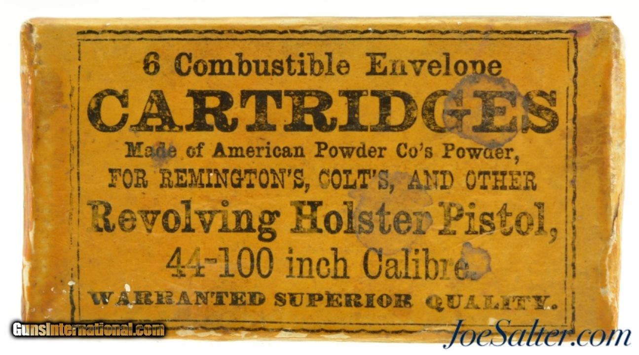 Description: This is a full and sealed percussion ammunition packet of 6 combustible 44 caliber (44-100) Envelope cartridges, marked "Made of American Powder Co.'s Powder / FOR REMINGTON'S, COLT'S, AND OTHER / Revolving Holster Pistol." Made for the l large caliber Civil War revolvers the packet has an excellent crisp top marking, fully intact without any edge splits having a very slightly crazed finish with some very small spots of sealant loss and some spotting. An excellent example to display with your Colt or Remington 44 Caliber revolver. SOLD |