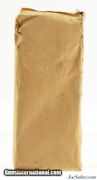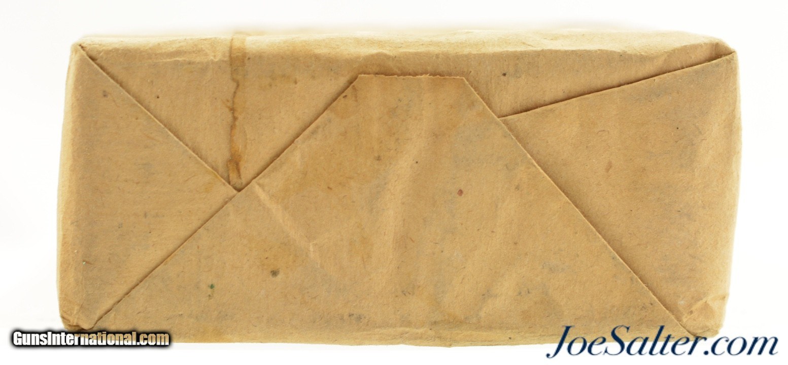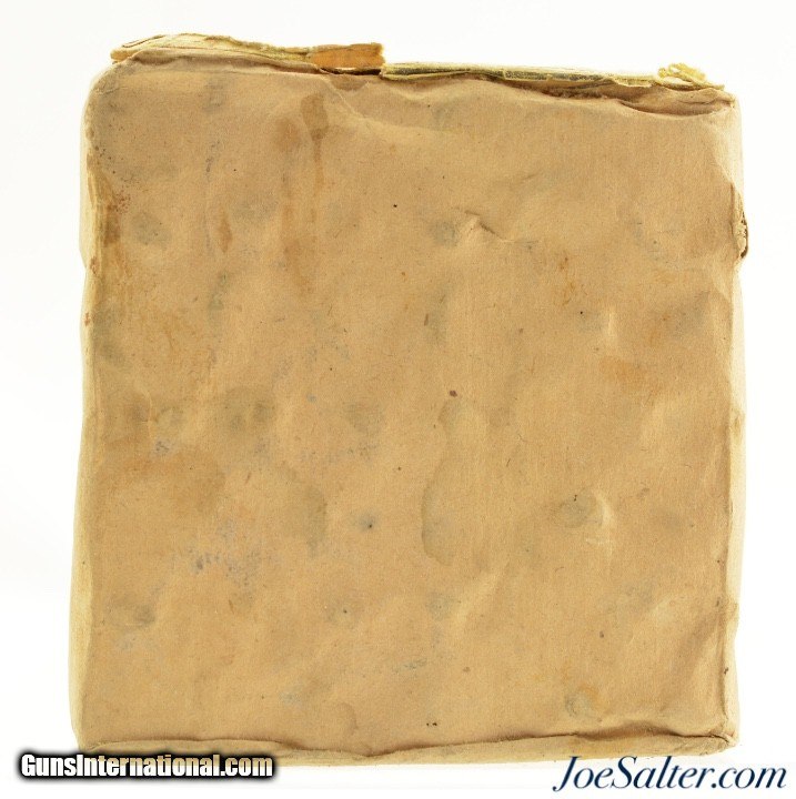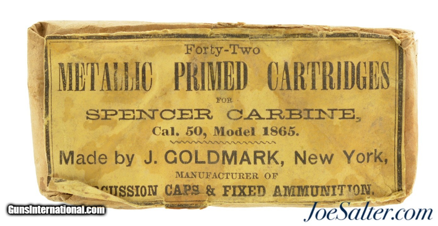 Description: This is a full "Soft Pack" with 42 original rounds of .56-50 Spencer (Model 1865, .50 Caliber) ammunition manufactured by Joseph Goldmark of New York. The cartridges will have the "JG" headstamp and are packaged as six rows of seven cartridges. These are Civil War era cartridges, likely just post war manufacture with the company in production from 1864-66. The sealed package has a very nice yellow label with call out for the Spencer Carbine. The paper wrapped cartridge packet is solid with some shell protrusions and minor age soiling. A rare item for the cartridge collector or to pair with your Spencer Carbine. SOLD |