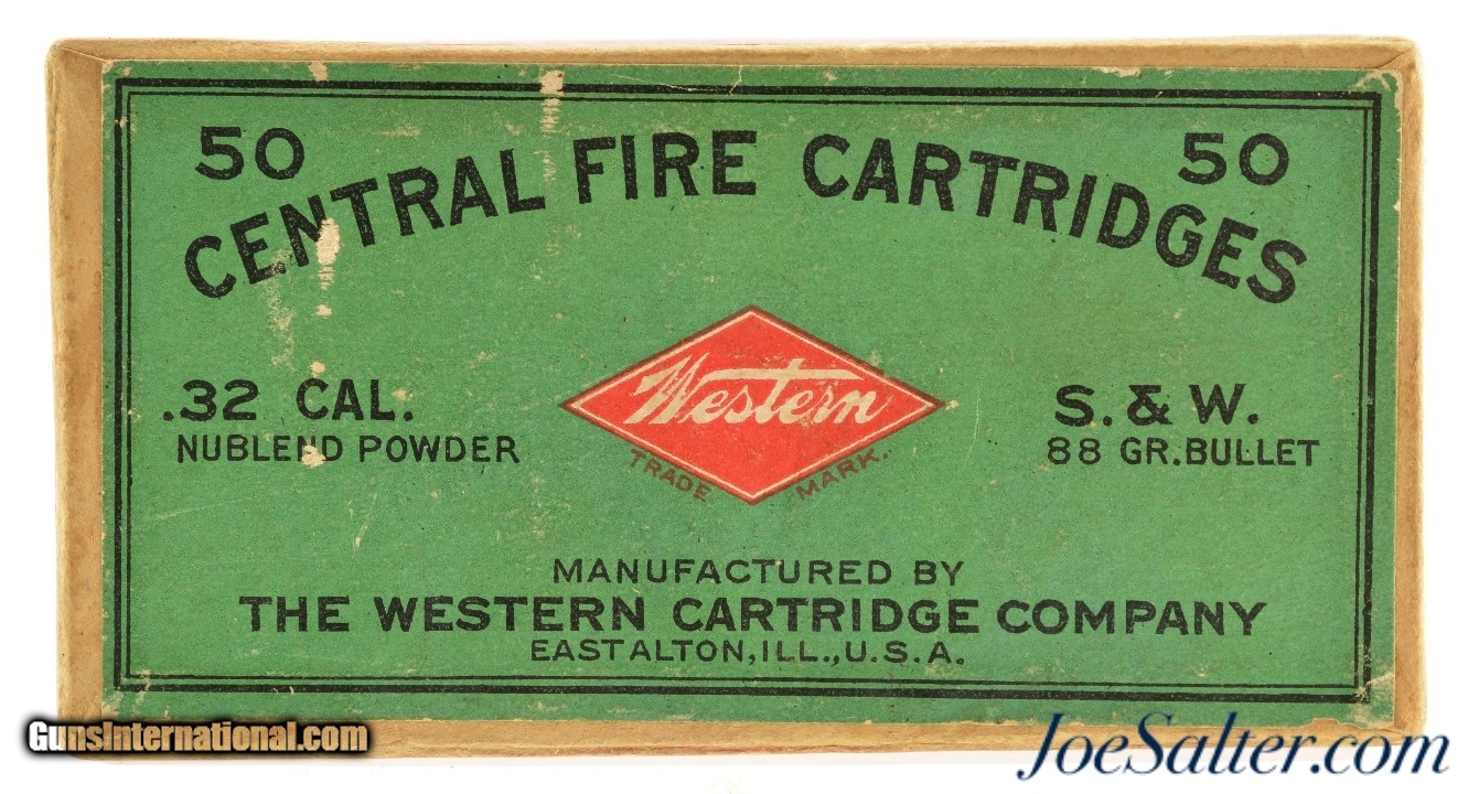 Description: This is a full box, 50 original rounds, of .32 S&W ammunition manufactured by Western with 88 grain bullets and Nublend Powder. The two piece green and red label box is in excellent condition with an excellent primary label showing some very small flaking. The side seal label is intact. A very nice box that would look great on display. SOLD |
