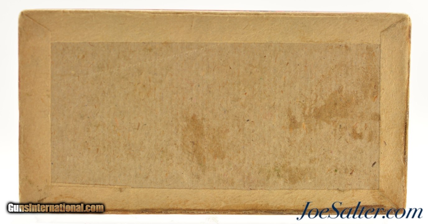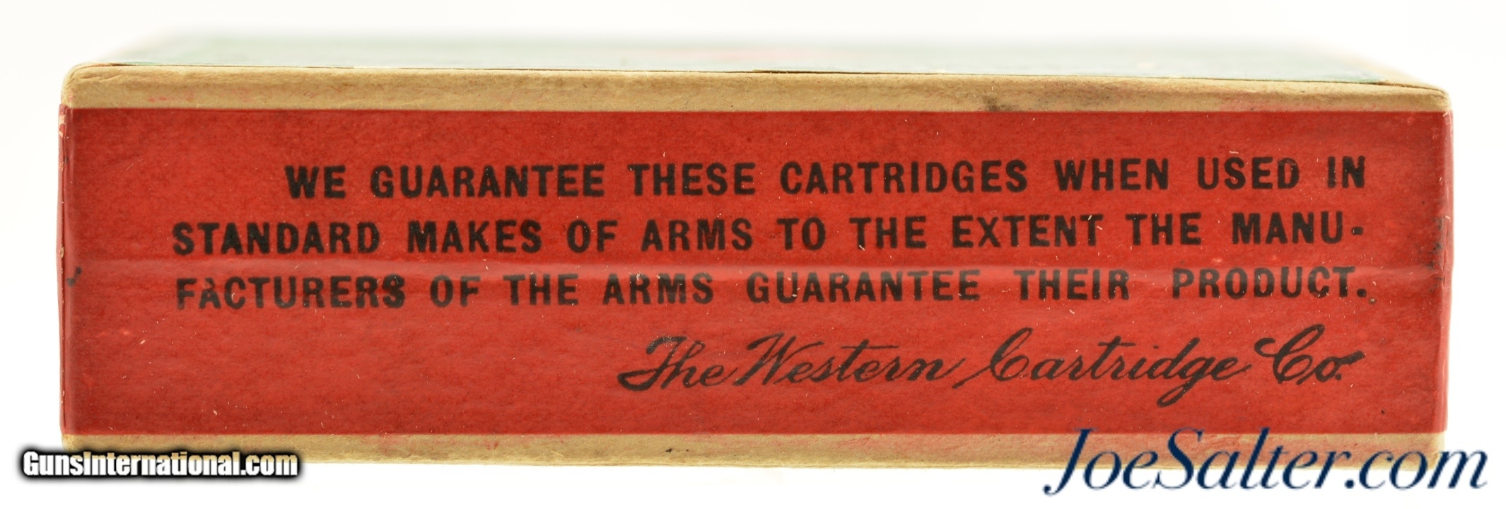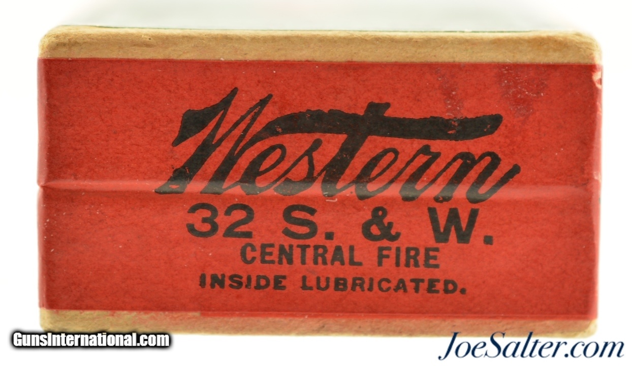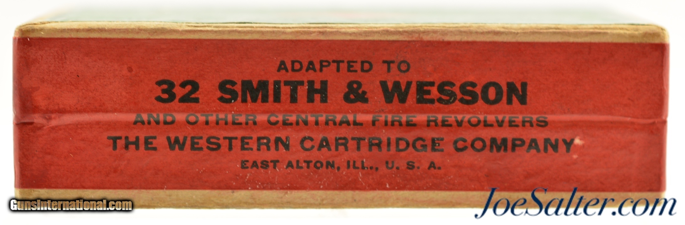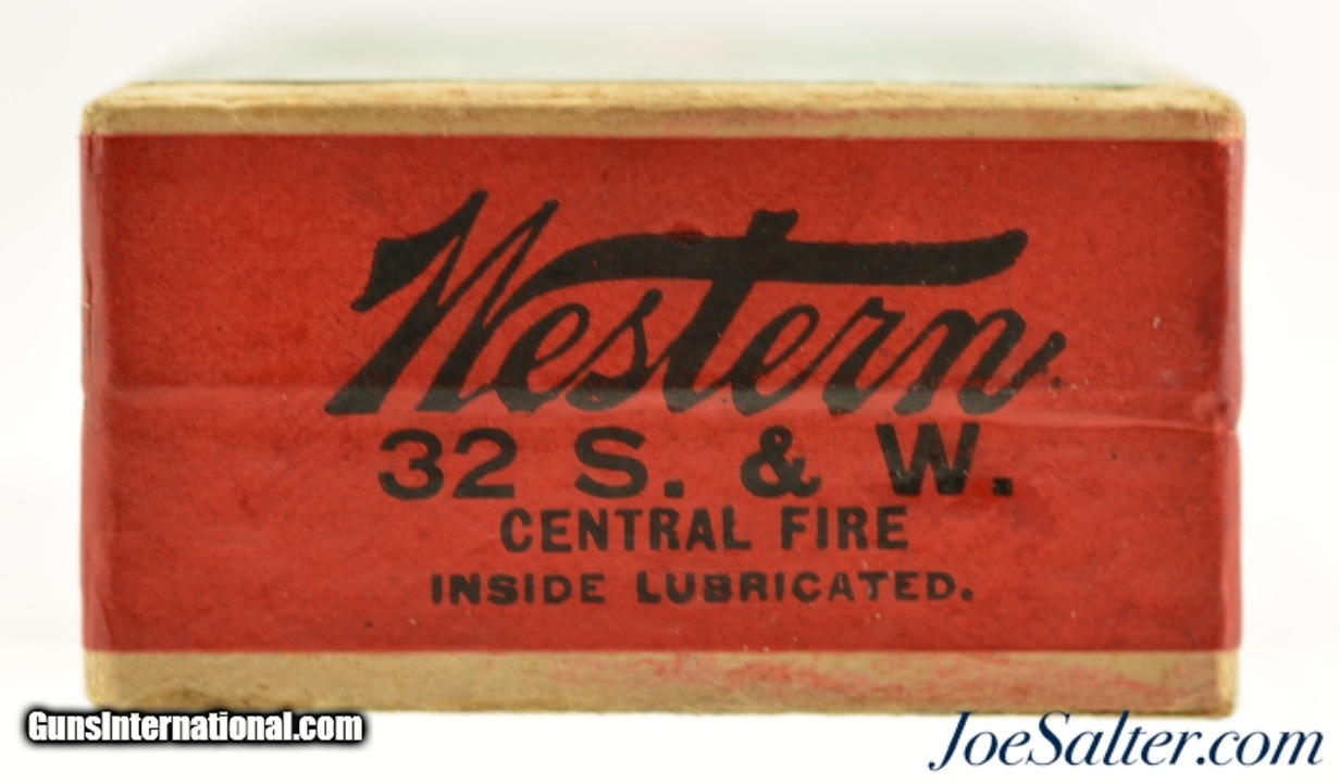 Description: This is a full box, 50 original rounds, of .32 S&W ammunition manufactured by Western with 88 grain bullets and Nublend Powder. The two piece green and red label box is in excellent condition with an excellent primary label showing some very small flaking. The side seal label is intact. A very nice box that would look great on display. SOLD |