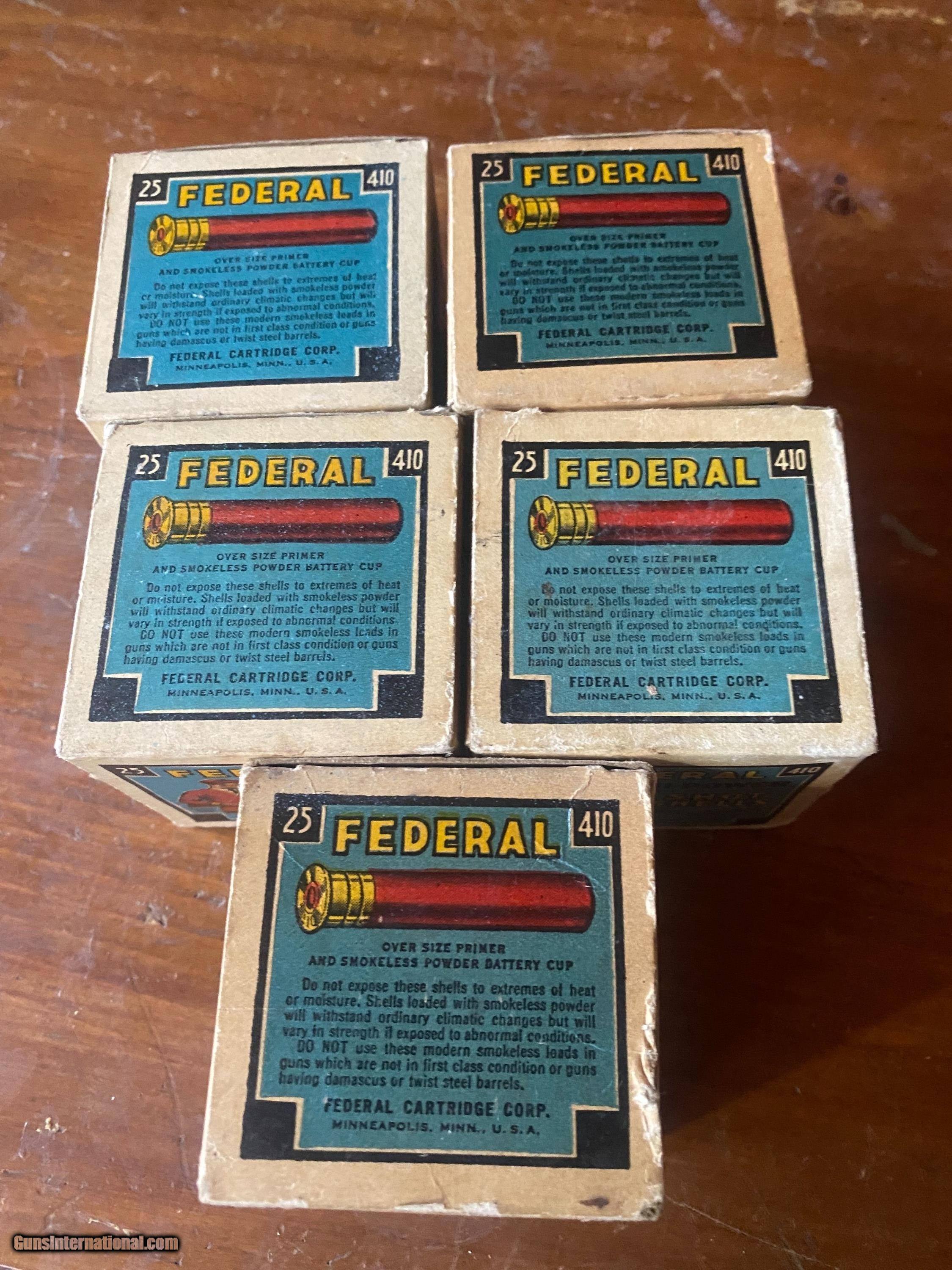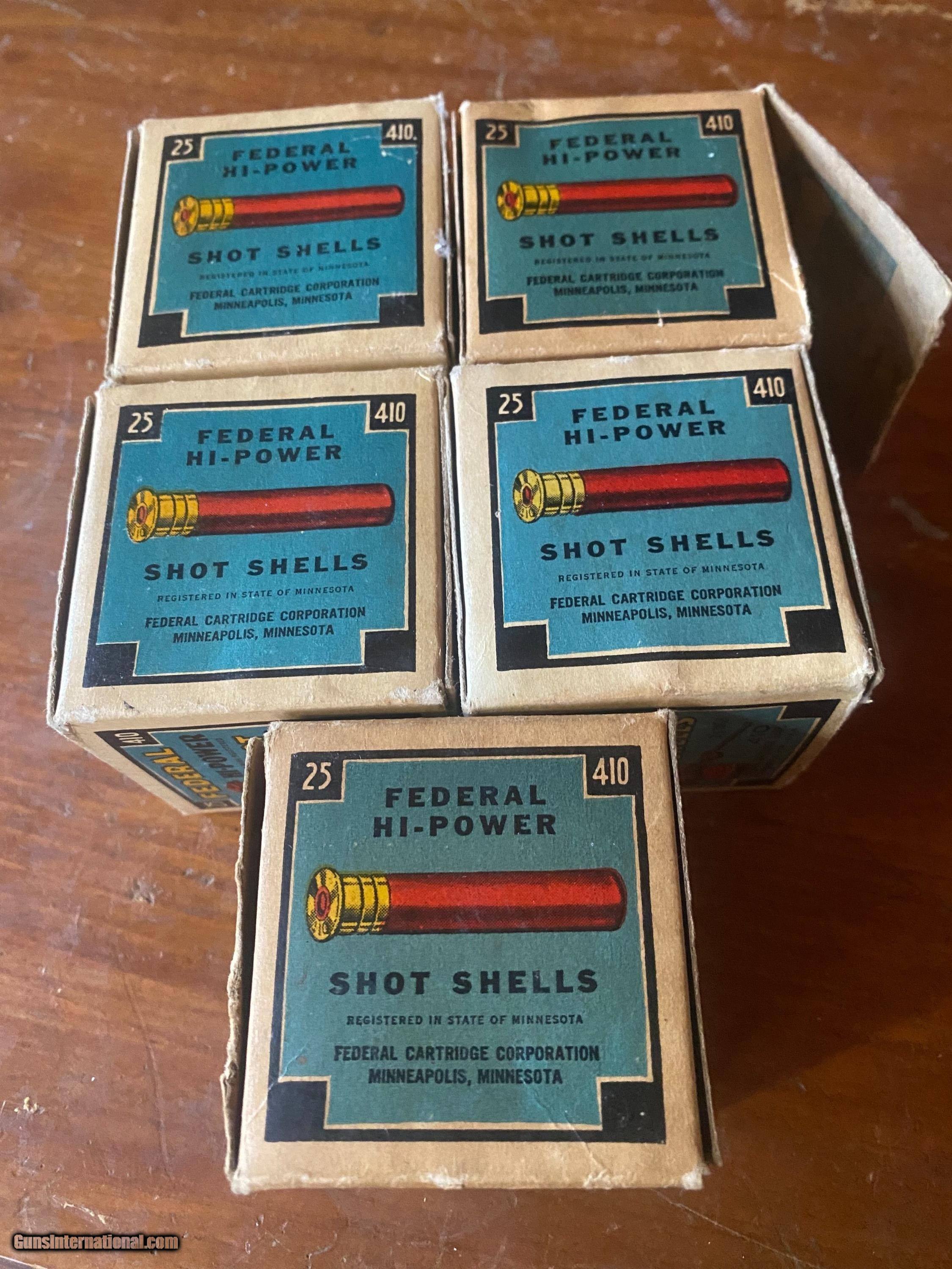 Description: Five Boxes of Vintage Federal Shot Shells. .410 2 1/2". Four boxes are full and one box is opened and missing four shells. Boxes are all in nice shape with great graphics. SOLD Shotgun Gauge: .410 Gauge |