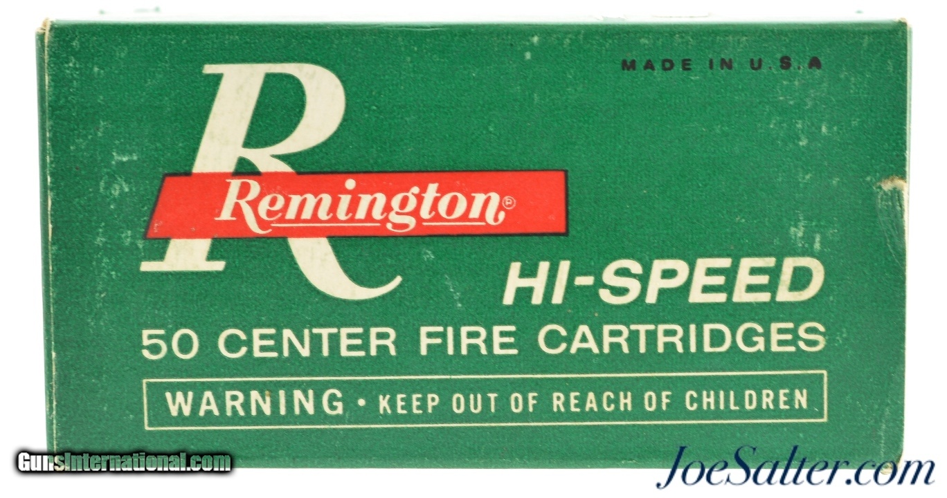 Description: This is a full box, 50 original rounds, of .22 Rem Jet ammo manufactured by Remington with 40 grain soft point bullets. The 1960's vintage red, green and white box is in excellent condition as are the cartridges. SOLD |