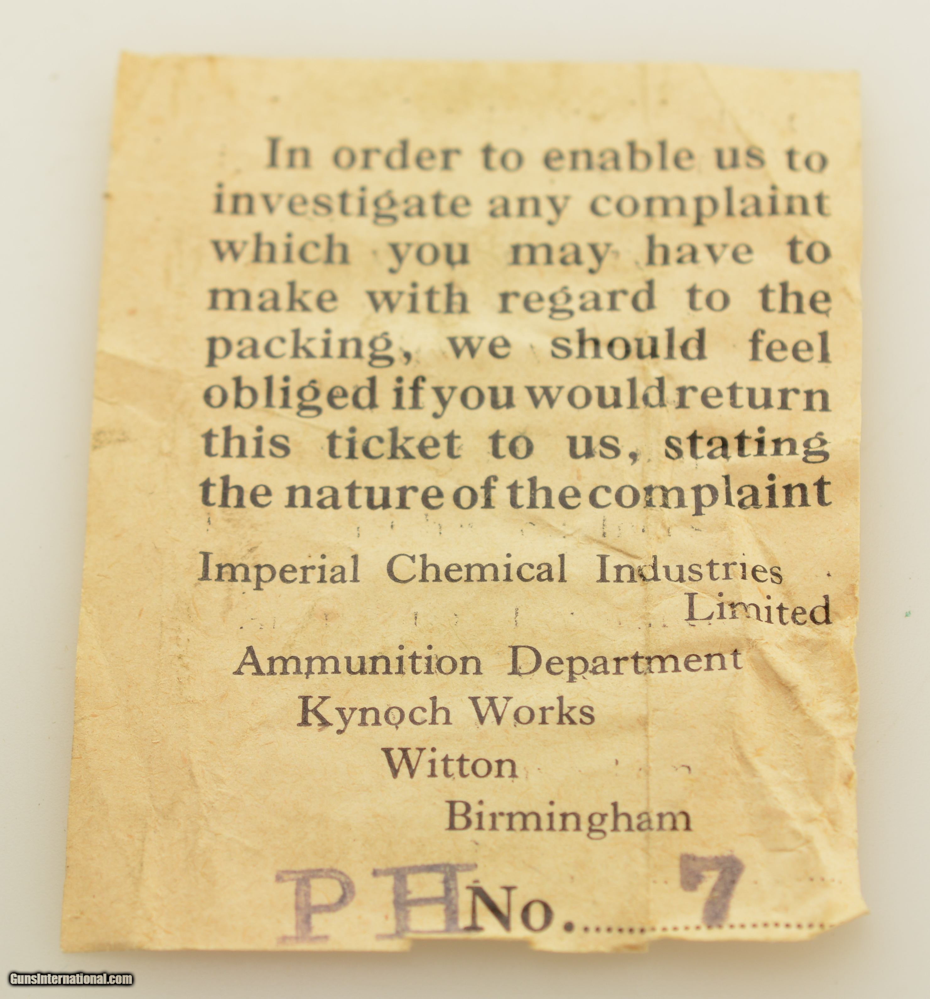 Description: This is a full box, 20 original rounds, of .401 WSL (Winchester Self-Loading) ammunition sold by C-I-L in Canada and manufactured for them by Kynoch in England with Kynoch head stamps on the cartridges. The two piece box with yellow Canadian Industries Limited labeled box shows early tape repairs to corners and labels with excellent cartridges, a few of which have mild case staining. The original inspection / complaint paper is present inside the box from “Imperial Chemical Industries Limited / Ammunition Department / Kynoch Works / Witton / Birmingham." A great box for the collector and shooter. SOLD Manufacturer: Winchester Model: Kynoch Caliber Info: .401 Win Gauge Info: .401 Win |