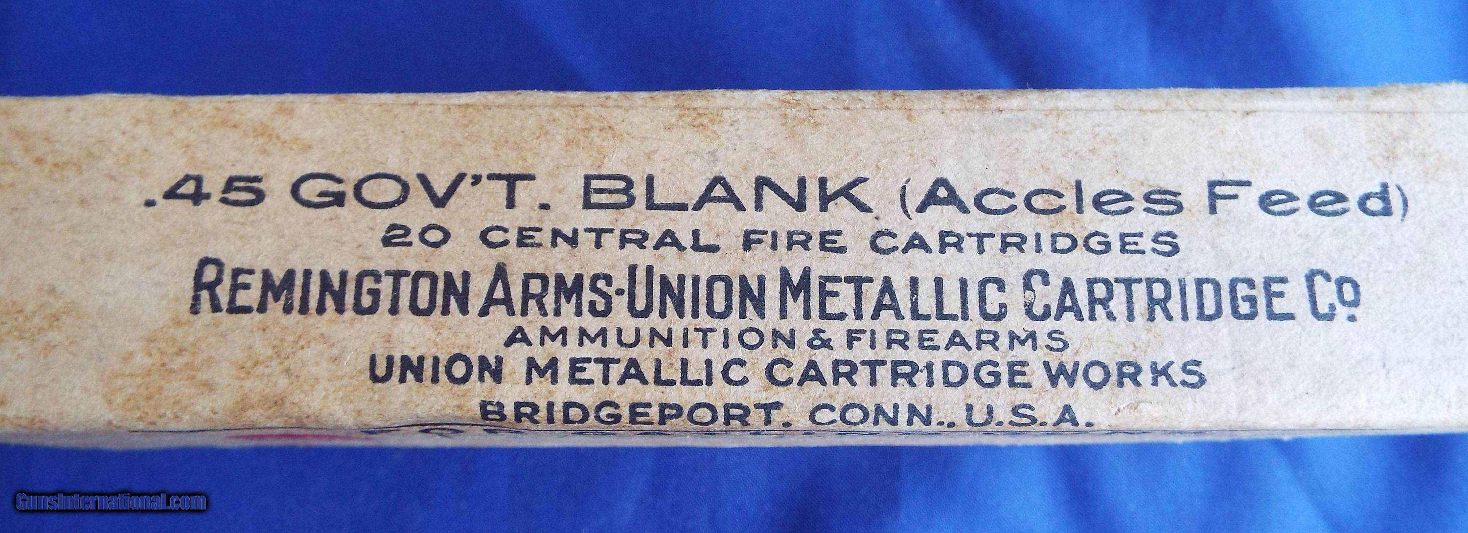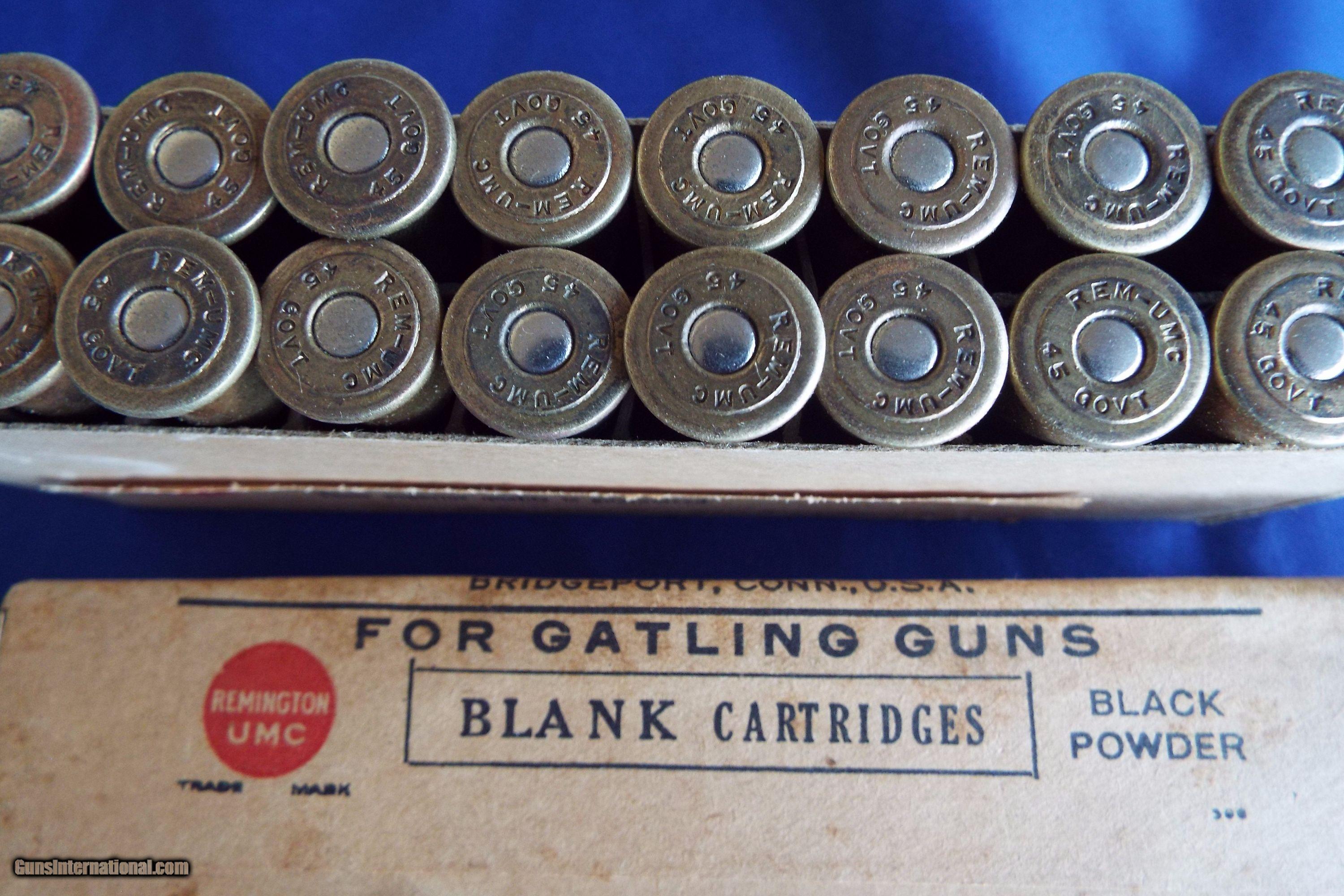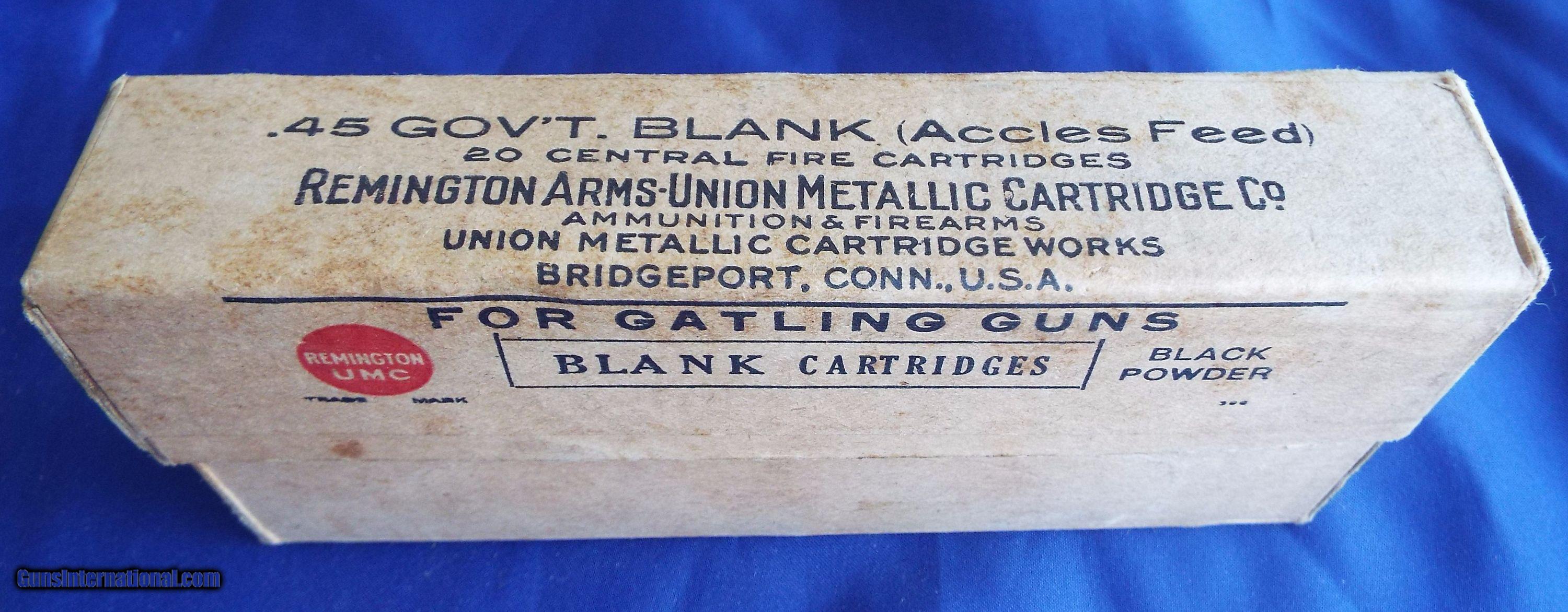 Description: FULL BOX (20 ROUNDS) .45 GOV'T BLANK (Accles Feed) CENTRAL FIRE CARTRIGES FOR *GATLING GUN* REMINGTON-UMC SUPER CLEAN! Black Powder Blank Cartridges, marked for GATLING GUNS. Hollow tipped brass cases with REM-UMC OVER 45 GOV'T head stamp. EXCELLENT VINTAGE CONDITION. PLEASE VIEW ALL PICTURES AS THEY ARE PART OF THE DESCRIPTION! Shipping is $15 UPS ground lower 48 only. From the collection of retired gunsmith.Please view our other listings, We will combine shipping on multiple purchases. Any questions, please call ERICA / SELF DEFENSE INC. 772-349-0334 (Florida) SOLD |