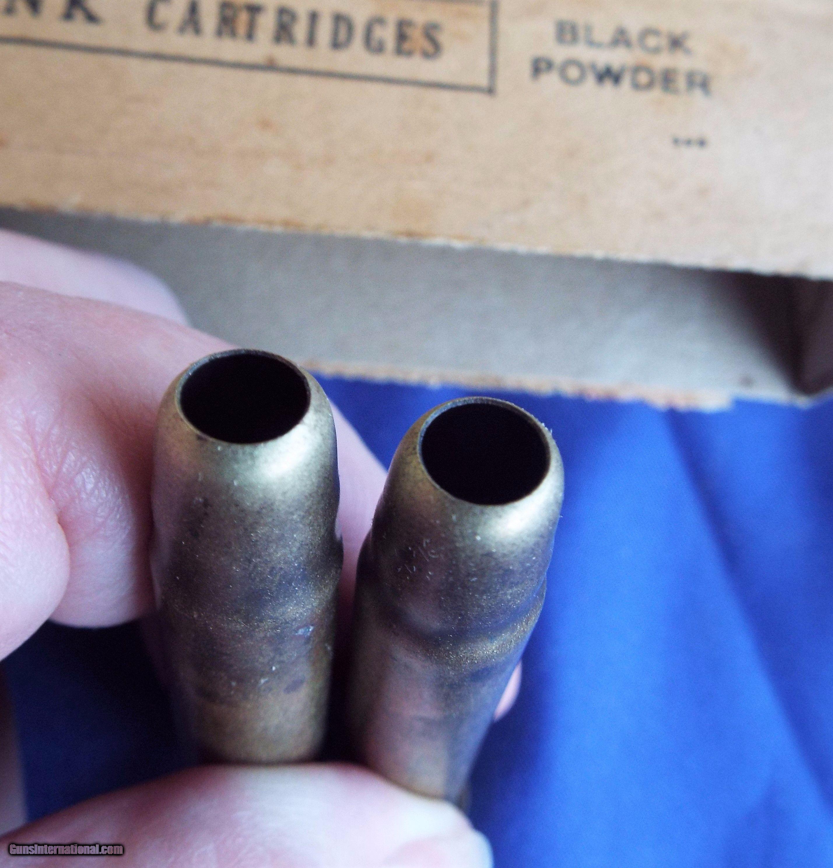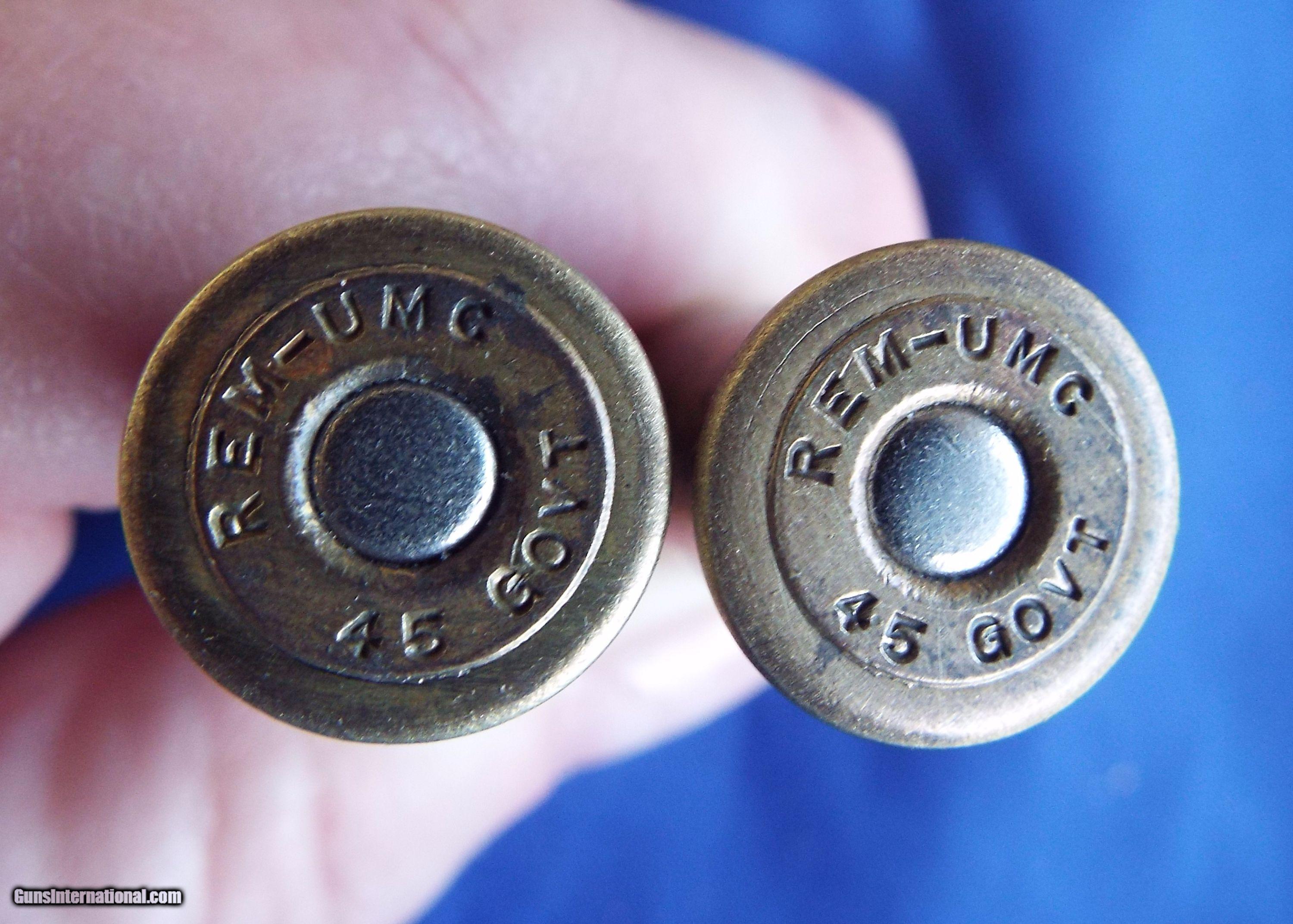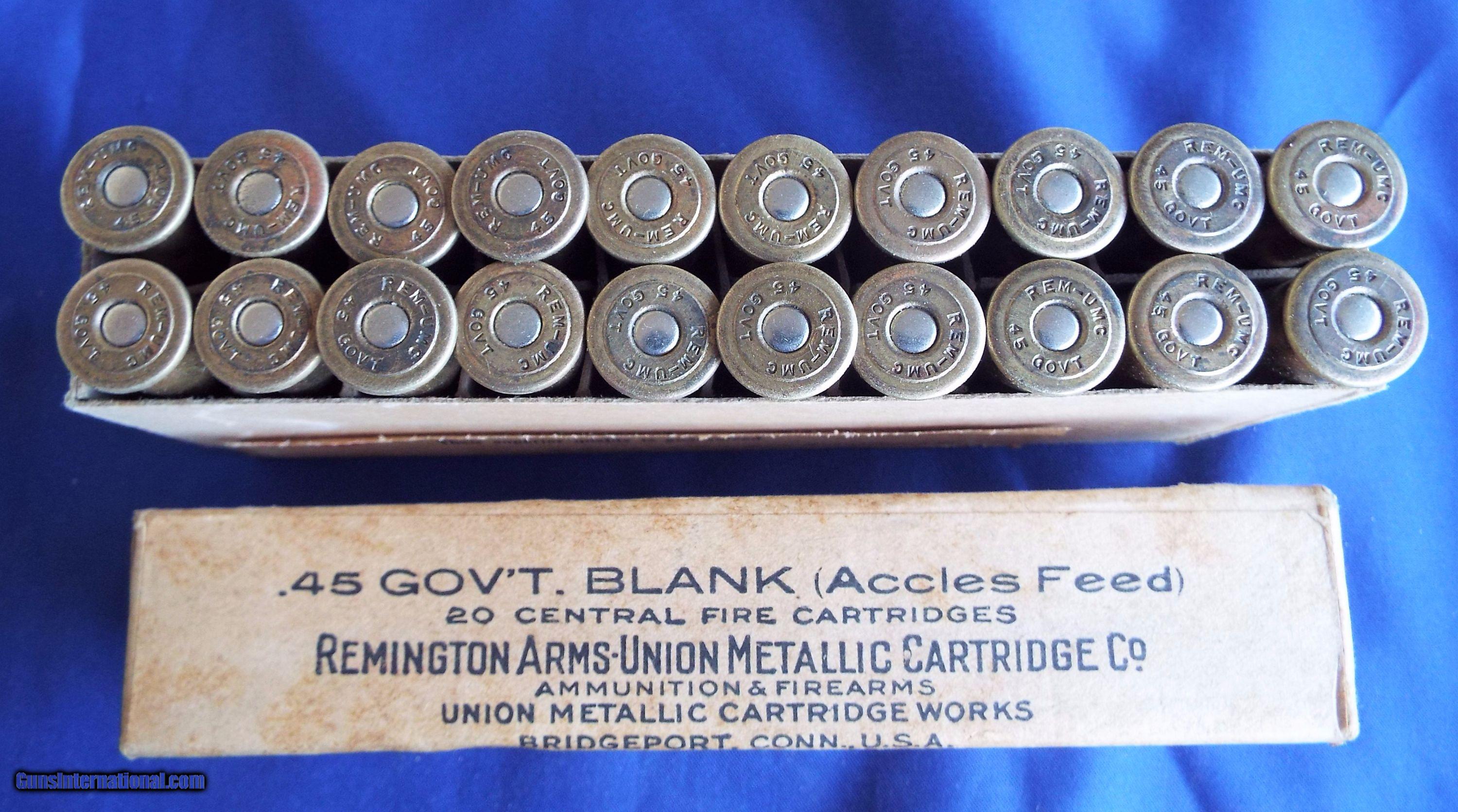 Description: FULL BOX (20 ROUNDS) .45 GOV'T BLANK (Accles Feed) CENTRAL FIRE CARTRIGES FOR *GATLING GUN* REMINGTON-UMC SUPER CLEAN! Black Powder Blank Cartridges, marked for GATLING GUNS. Hollow tipped brass cases with REM-UMC OVER 45 GOV'T head stamp. EXCELLENT VINTAGE CONDITION. PLEASE VIEW ALL PICTURES AS THEY ARE PART OF THE DESCRIPTION! Shipping is $15 UPS ground lower 48 only. From the collection of retired gunsmith.Please view our other listings, We will combine shipping on multiple purchases. Any questions, please call ERICA / SELF DEFENSE INC. 772-349-0334 (Florida) SOLD |