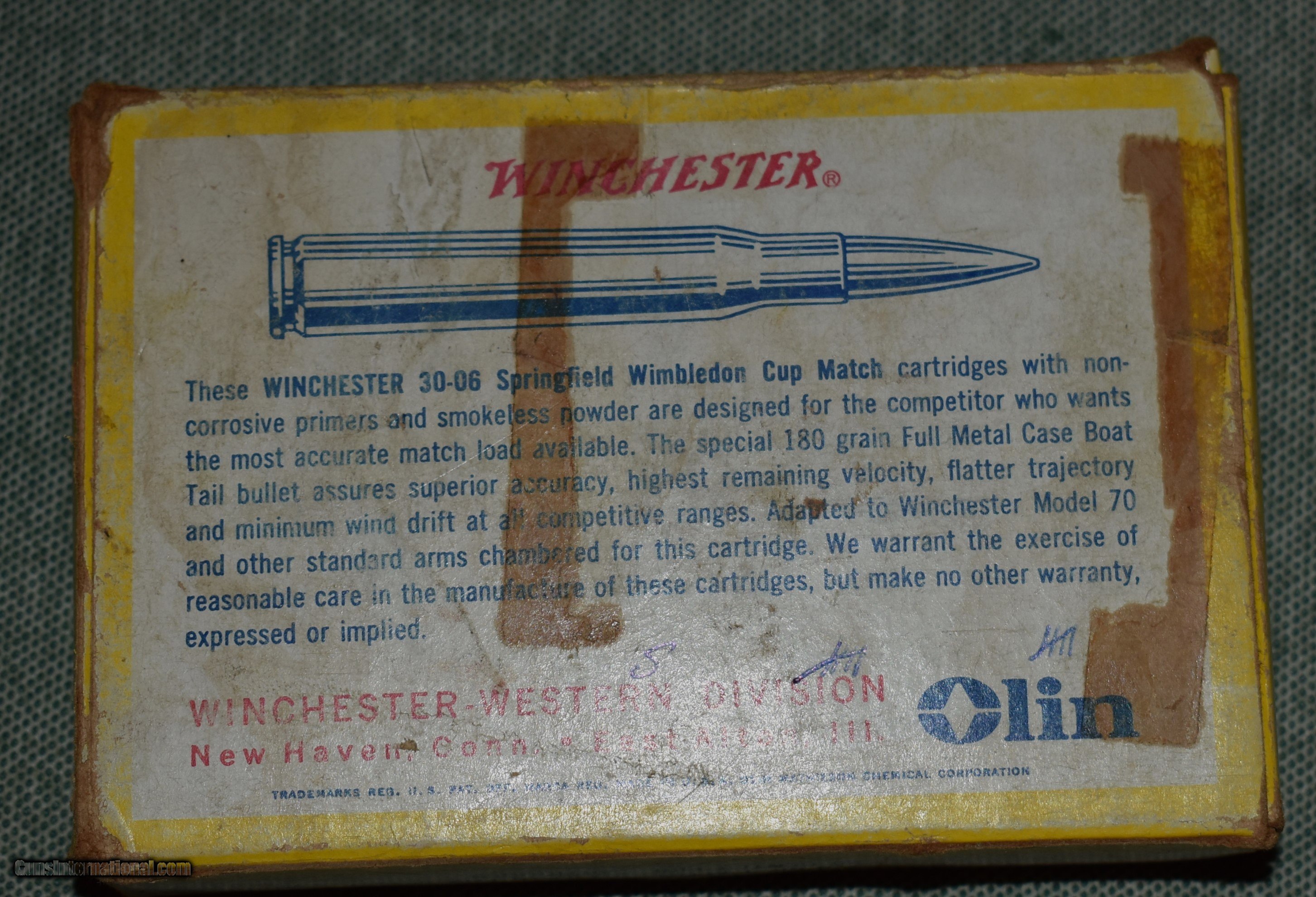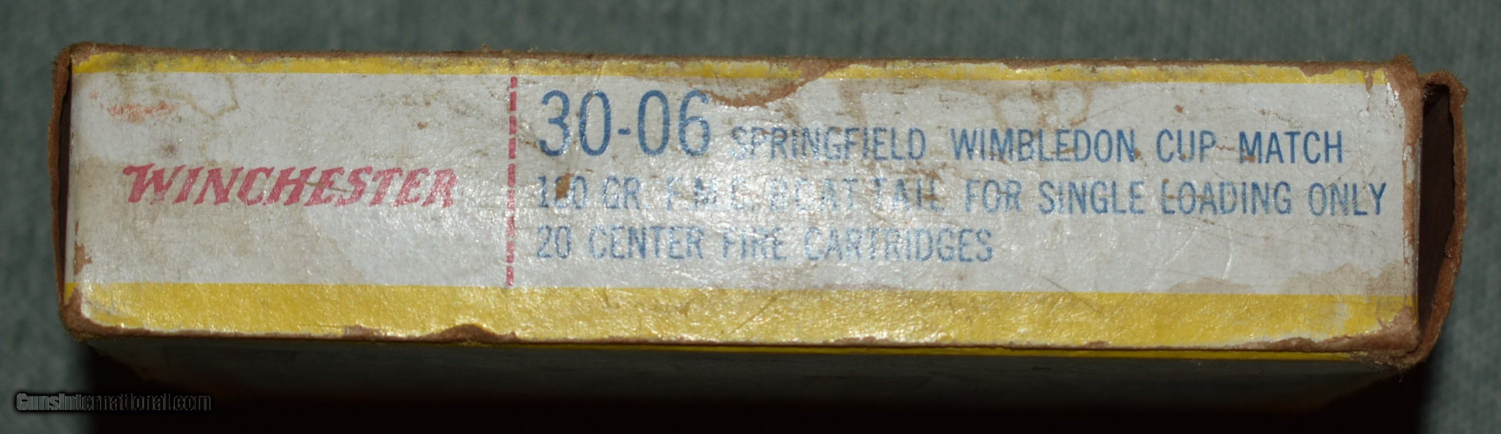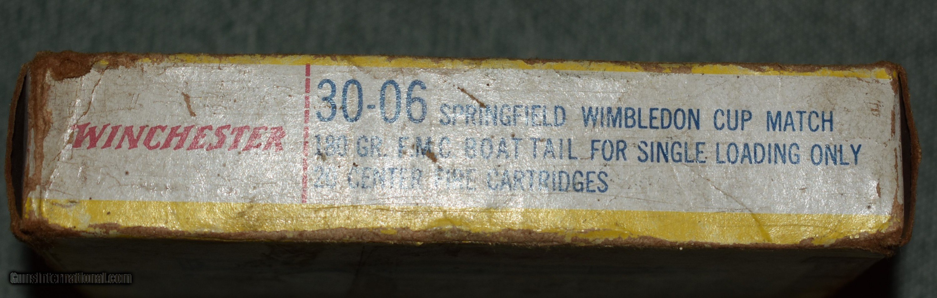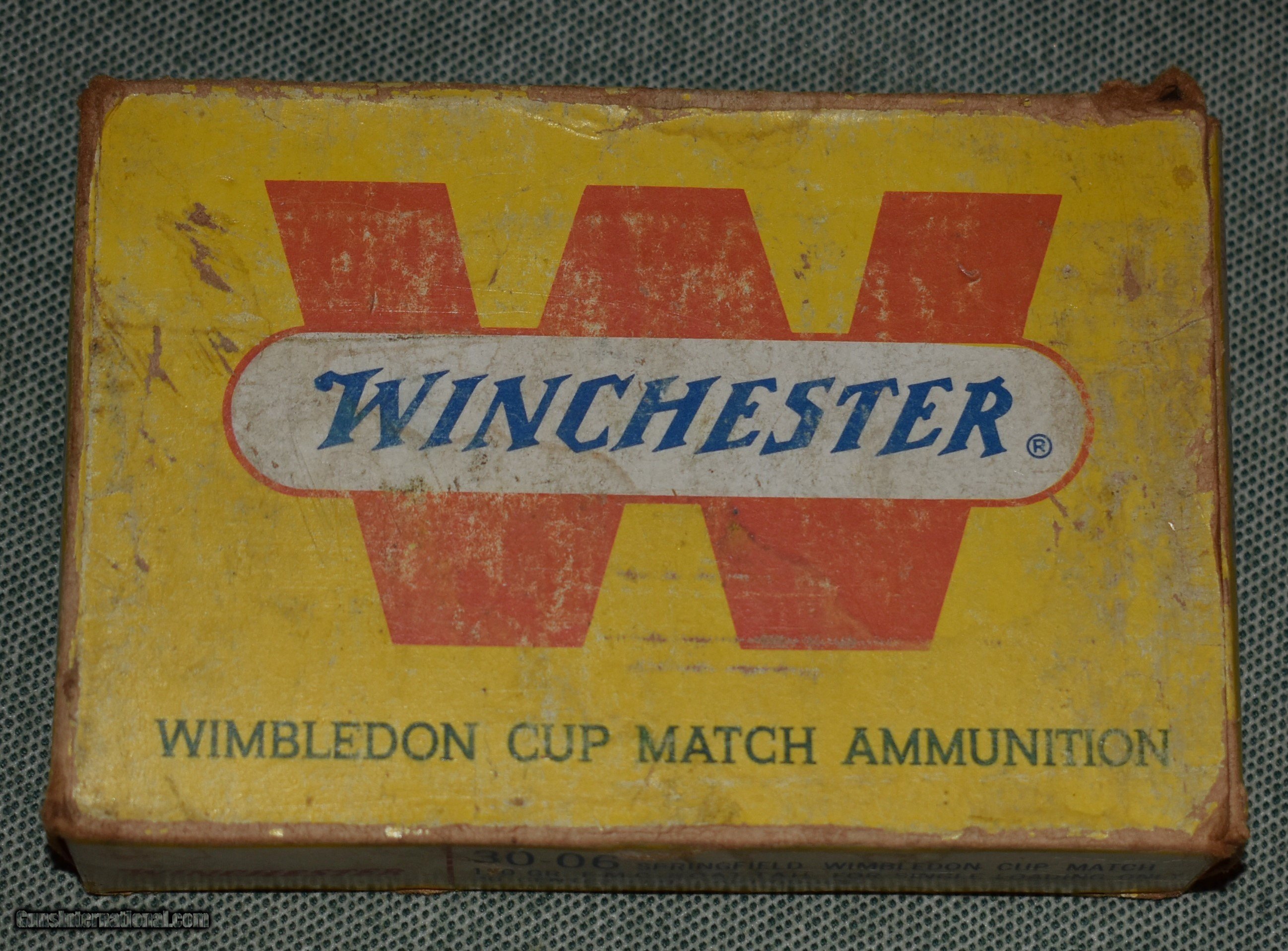 Description: Afull box of Winchester Wimbledon 30-06 Match ammuniton. 180 grain full metal jacket boat tail. The vox has good bright graphics but is slightly tattered at the corners and is lightly soiled. The cartridges are all in excellent condition. Still a scarce box from the 1050s.Price includes shipping. SOLD Rifle Caliber: .30-06 Springfield |
