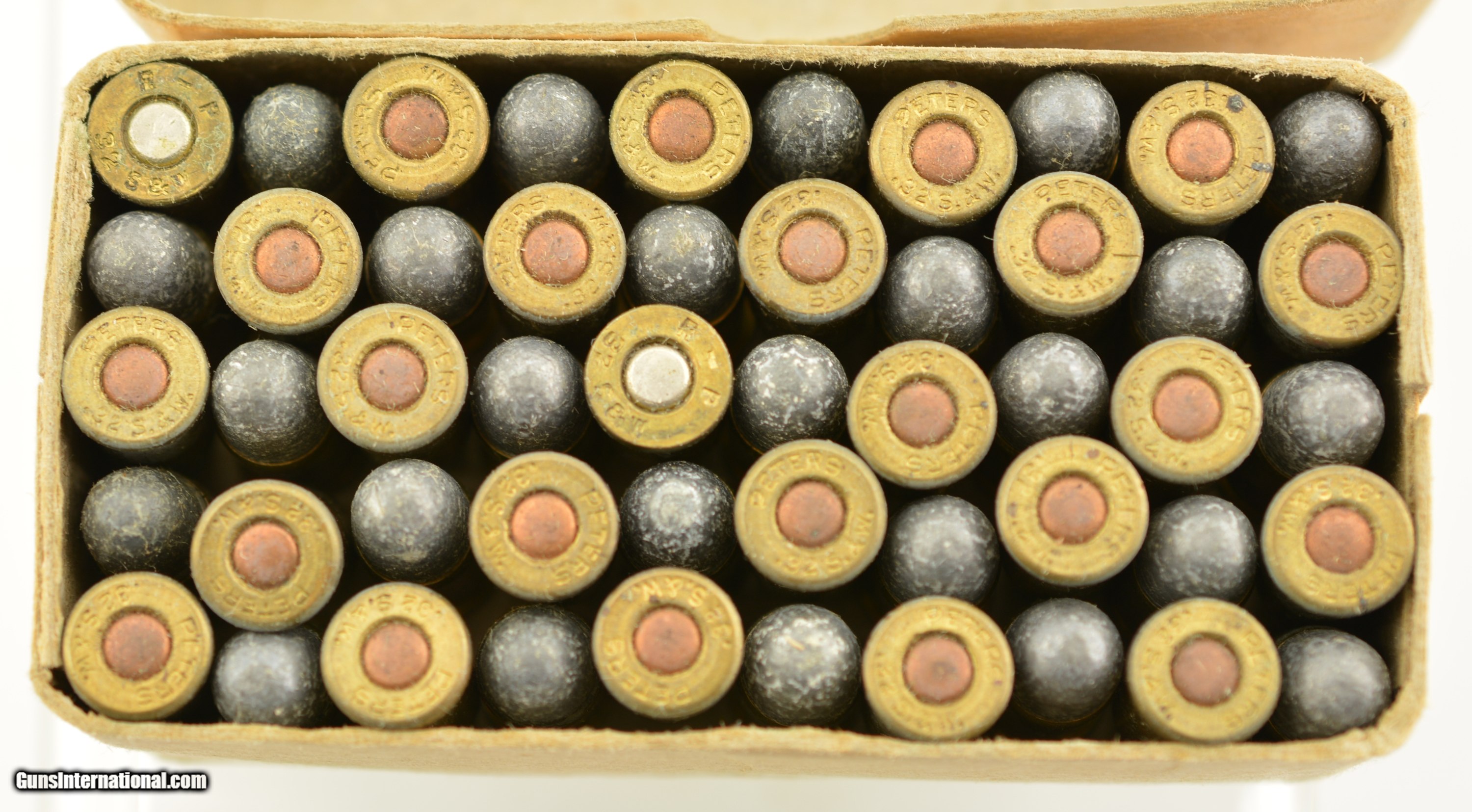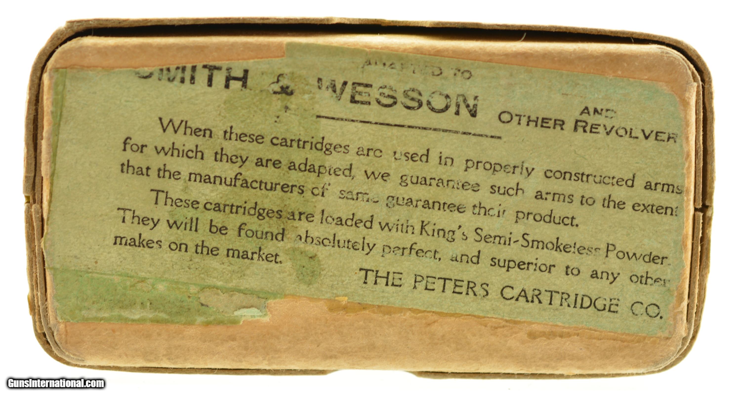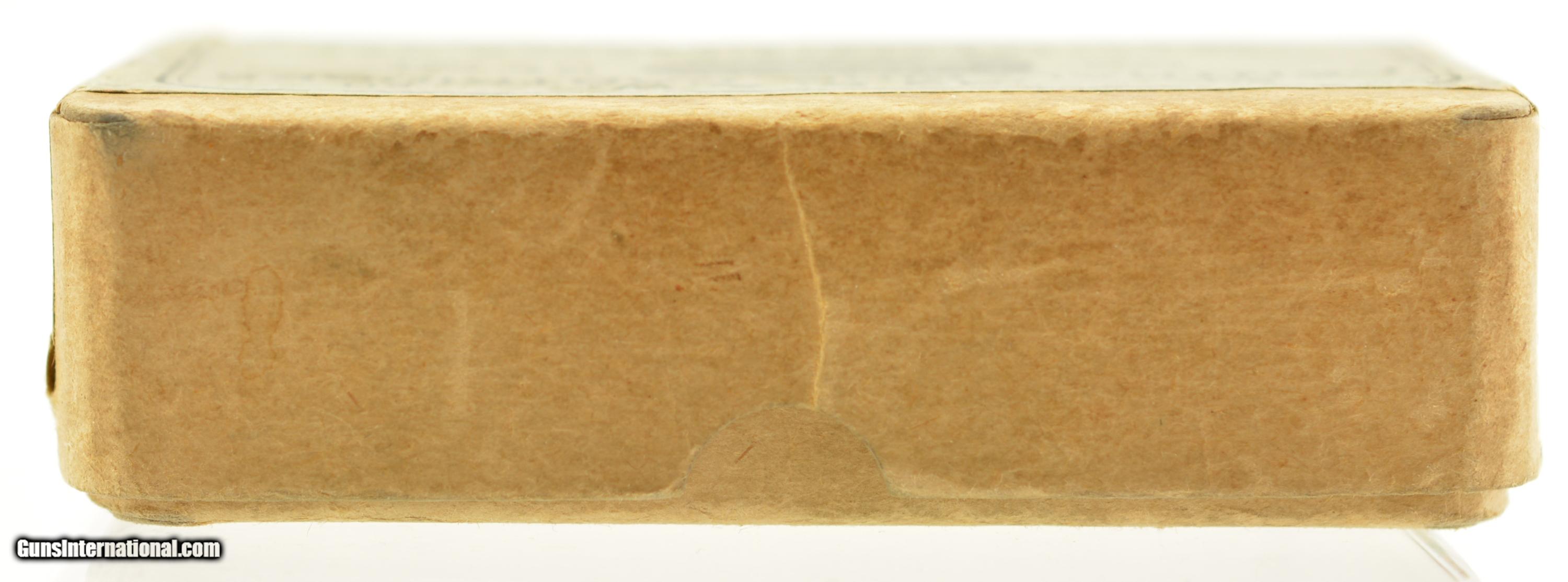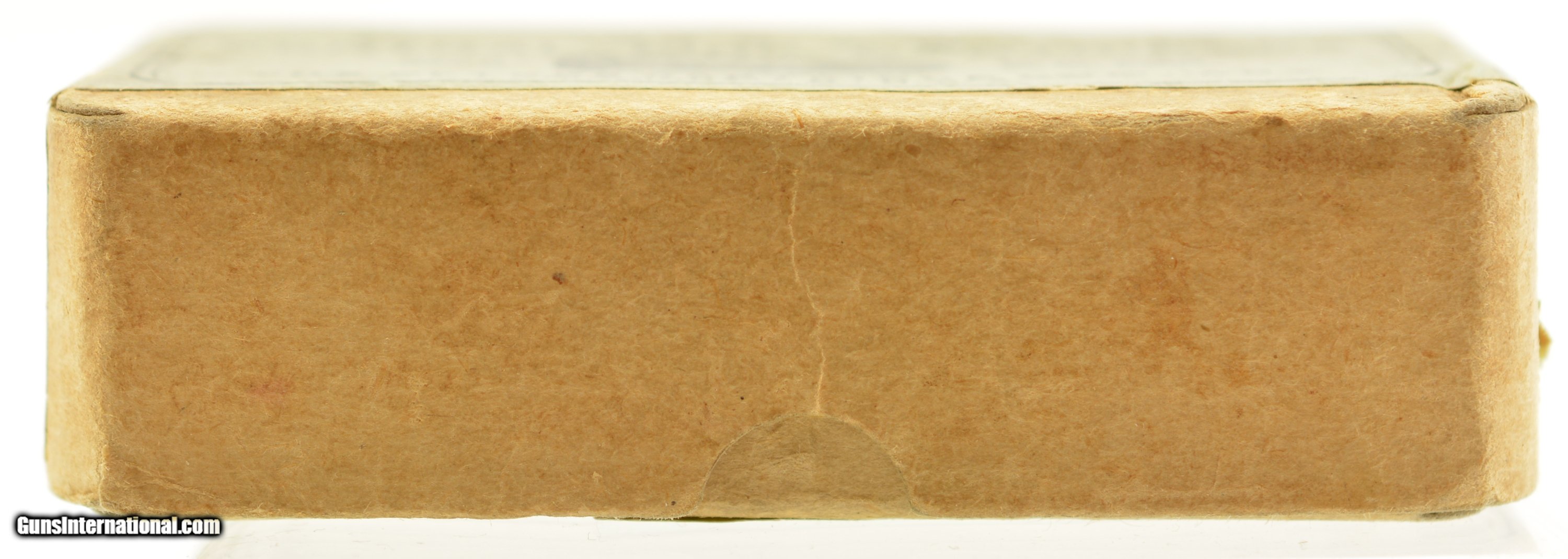 Description: This is a full box, 50 mixed headstamped rounds of .32 S. & W. ammo manufactured by the Peters Cartridge Company. The early King's Semi-Smokeless powder box with green and black wrap around label is in very good to near excellent condition, solid with some light age soiling and staining missing some small pieces of the side label. The cartridges are in near excellent condition with most being the correct Peters rounds and several non-Peters marked ones. SOLD Manufacturer: Peters Caliber Info: .32 S&W Gauge Info: .32 S&W |