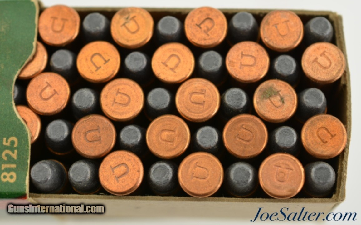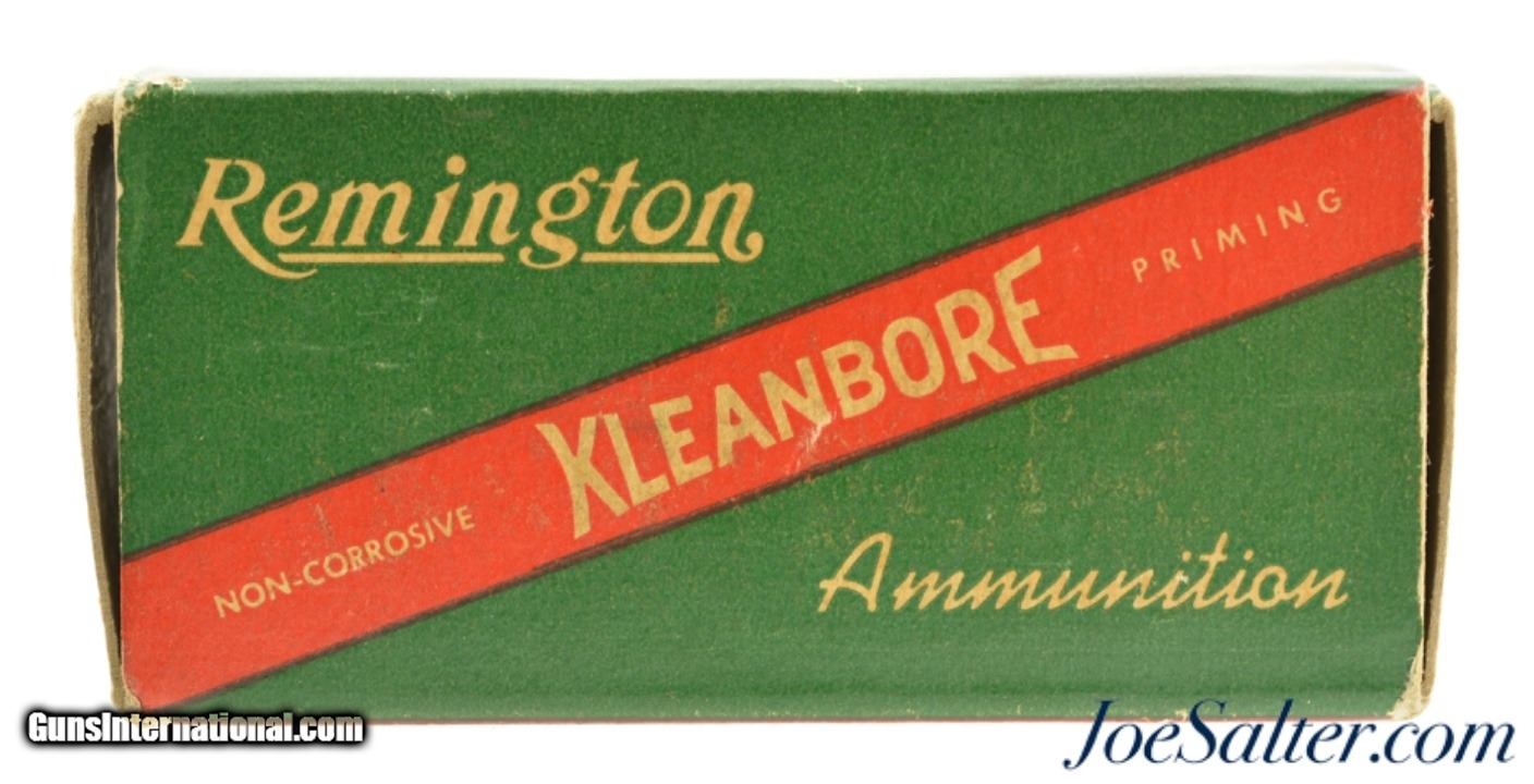 Description: This is a full box, 50 original rounds, of .25 Stevens RF ammunition manufactured by Remington. The post WWII one piece box is in near excellent condition with some light edge and corner wear. The cartridges are in excellent condition. A very nice full box of what was the last commercial US loading that's getting harder to find. SOLD |