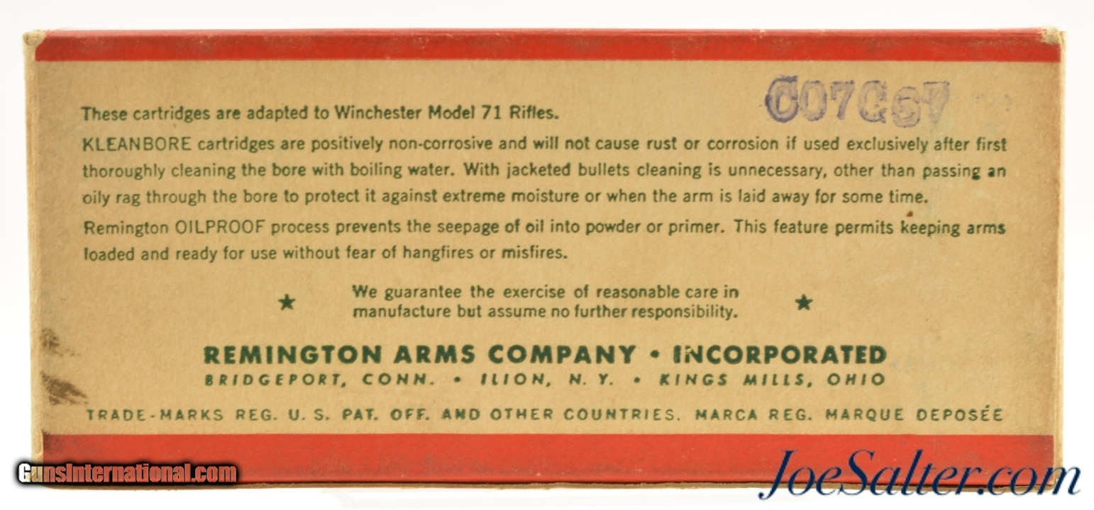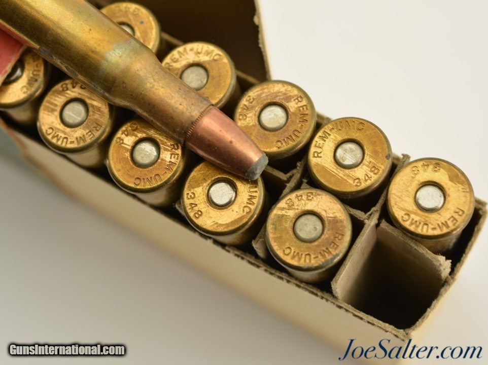 Description: This is a full box, 20 rounds, of .348 Winchester Hi-Speed Remington ammunition manufactured by Remington with 150 grain soft point bullets. The post WWII green and red box is in excellent condition, missing one inside flap with some minor rub wear with excellent cartridges. SOLD |