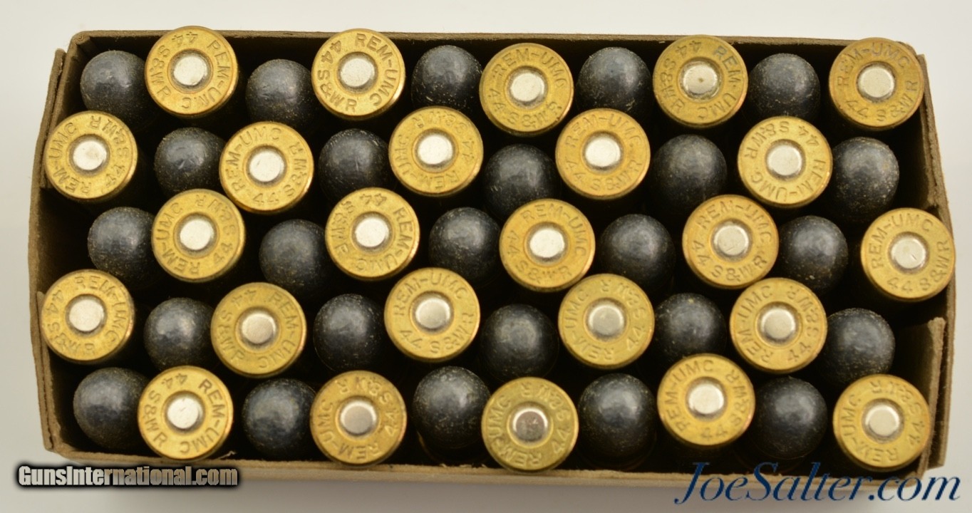 Description: This is a full box, 50 original rounds, of .44 S.&W. Russian ammunition manufactured by Remington with 246 grain lead bullets. The green, red and white one piece, post WWII box shows edge and shelf wear with expert repairs to one flap. The cartridges are in excellent condition. SOLD |