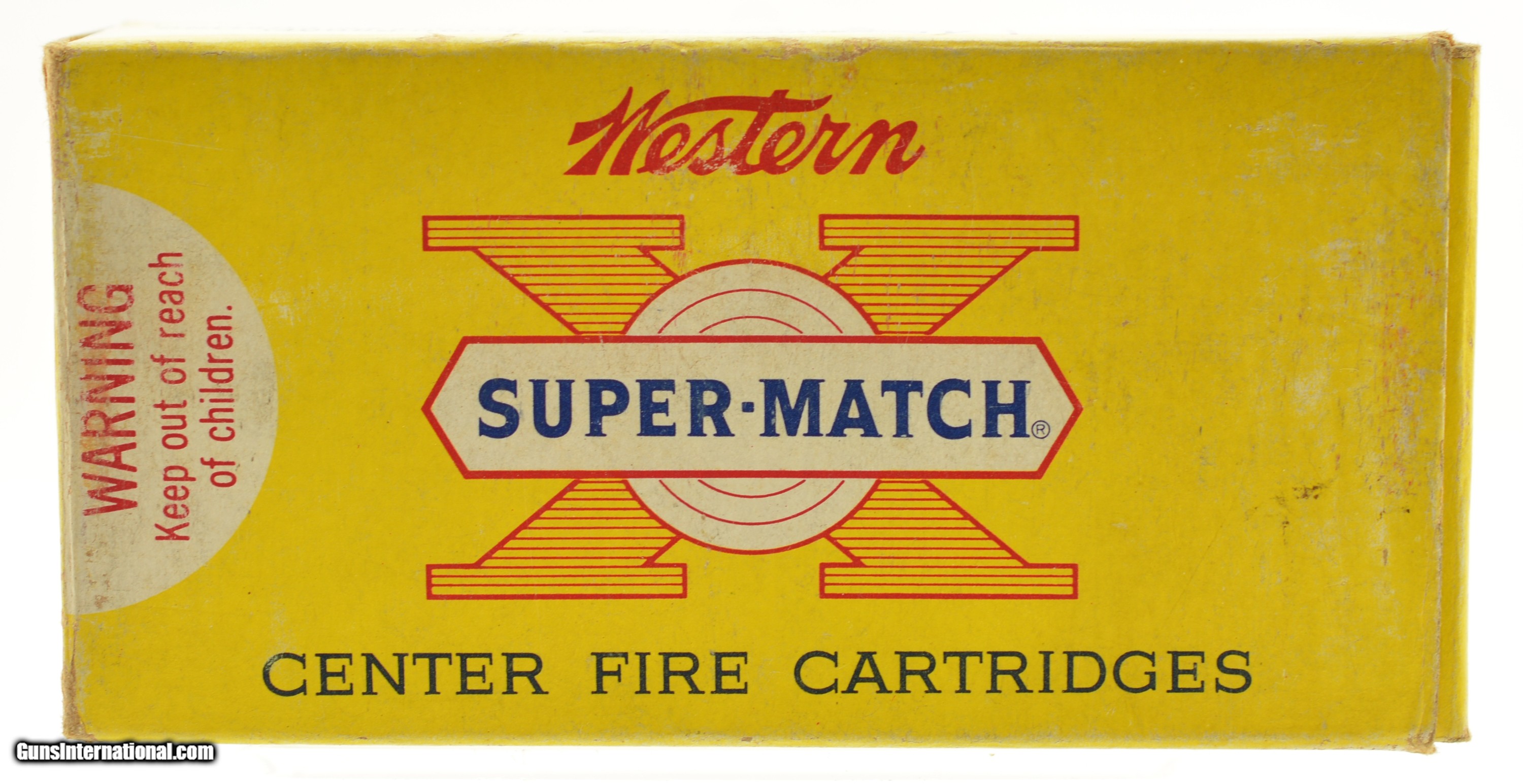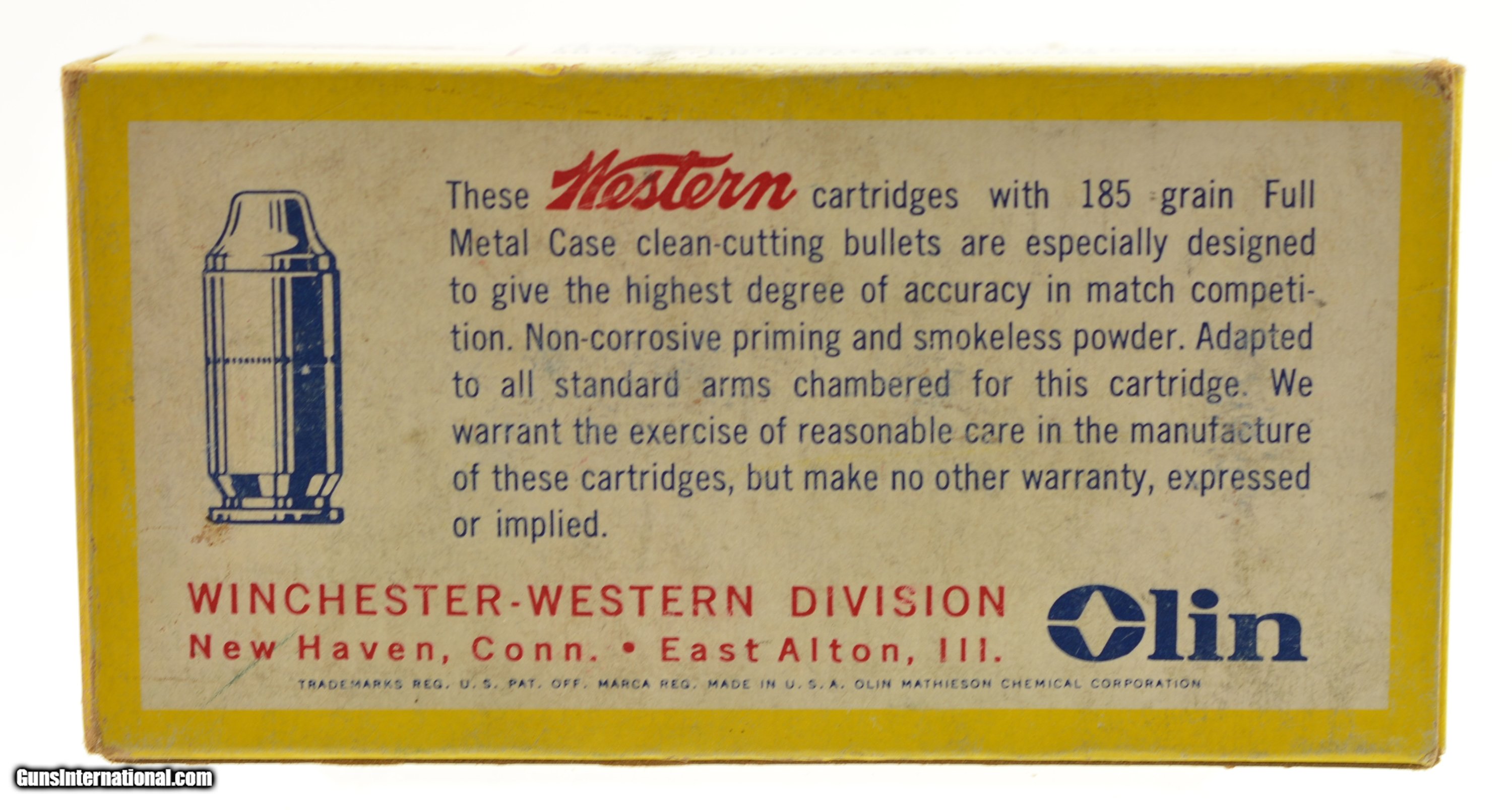 Description: This is a full box, 50 original rounds, of .45 Auto ammunition manufacture by Western with 185 grain full metal case clean-cutting bullets. The yellow, red and white one piece box shows edge and rub wear with excellent cartridges. SOLD Manufacturer: Western Caliber Info: .45 ACP Gauge Info: .45 ACP |