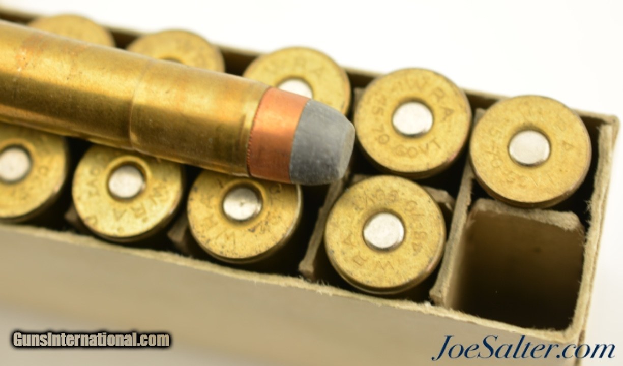 Description: This is a full box, 20 rounds, of .45-70 ammunition with "WRA" head stamped cases and a Western Cartridge box. The one piece box is solid with the classic "Bullseye" graphics and is in very good condition with writing on the back and side. The cartridges have non-matching head stamps to the box with the Winchester "WRA" labeling and are in excellent condition. A very nice display box. SOLD |