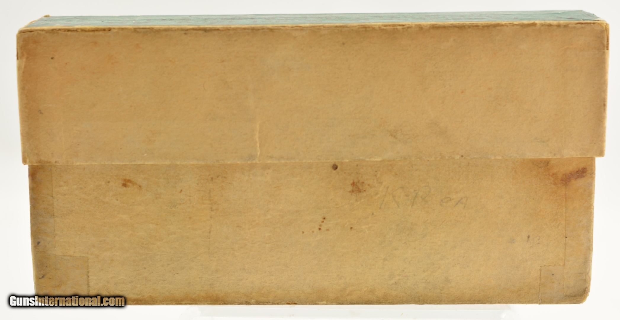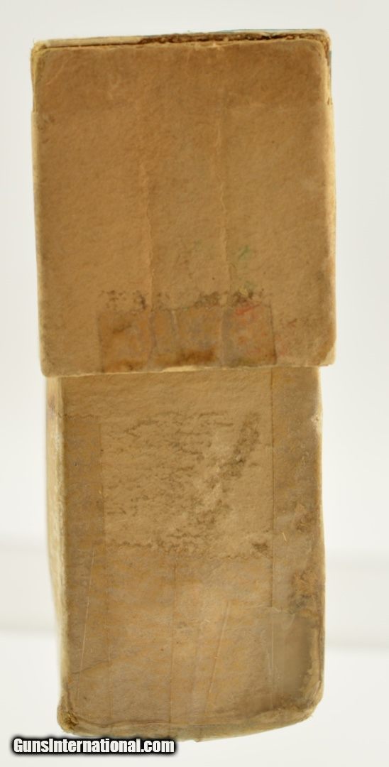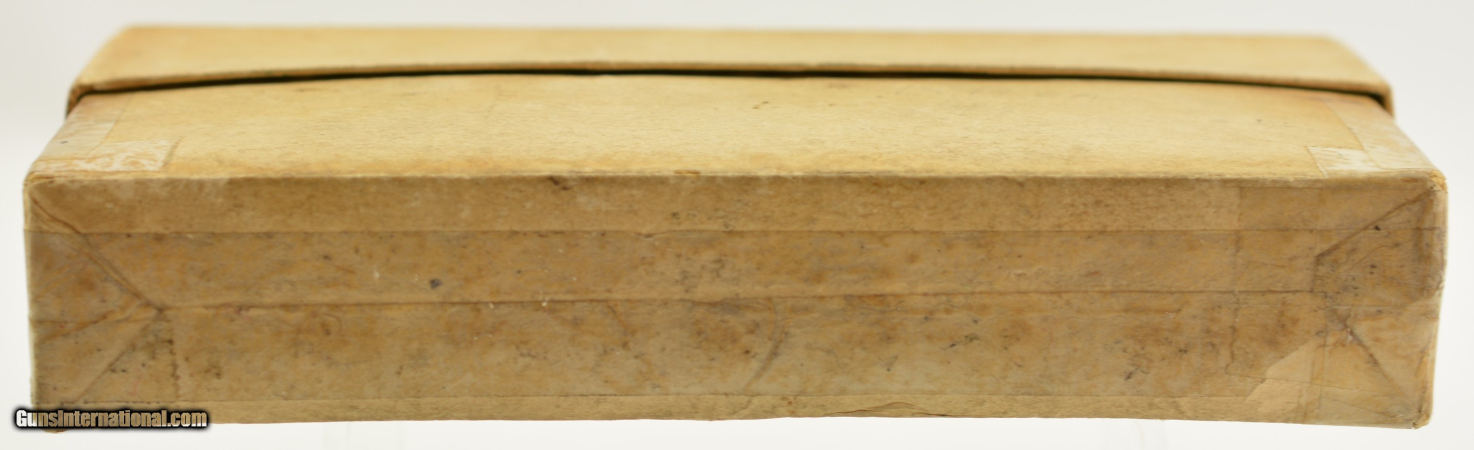 Description: This is a full box, 20 original rounds, of .40-70 black powder ammunition manufactured by Winchester with 330 grain lead bullets. The two piece box intact showing older tape repairs to the bottom and sides. The top remains solid with wood insert and has an excellent top and side label with a very nice cartridge cut showing the Model 1886 call out having some light flaking. The cartridges are in excellent condition. A very good looking Winchester box in a seldom-seen caliber. SOLD |