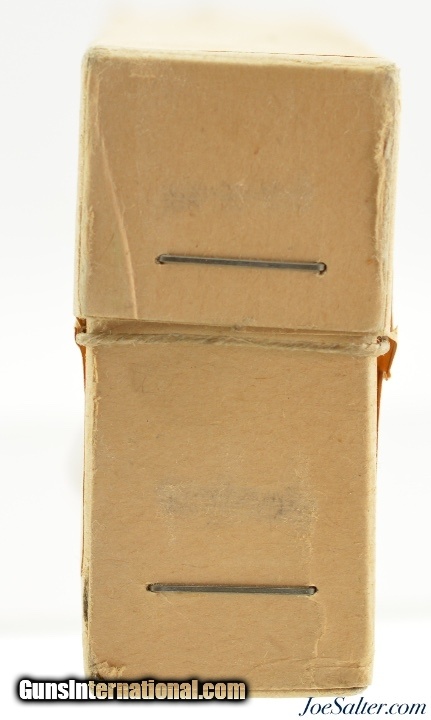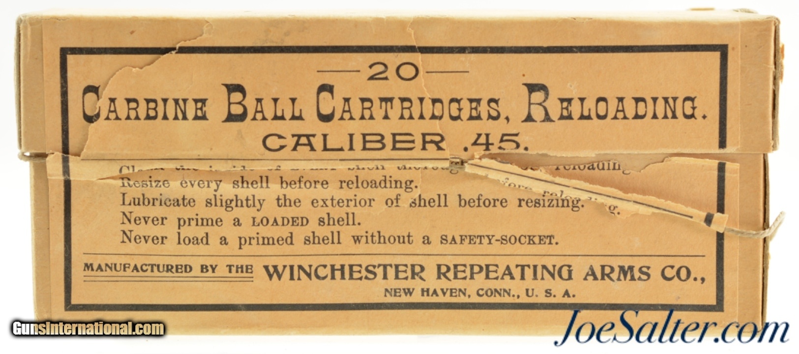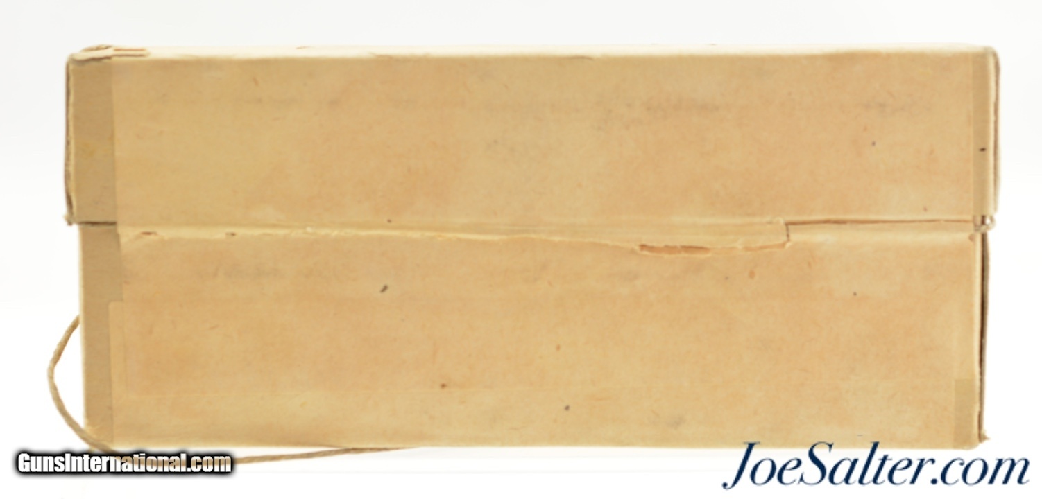 Description: This is a full and partially sealed, unopened with a somewhat fragile seal cord that has loosened over time, box of .45-70 ammo. The two piece buff box with buff and black label identifies the cartridges as for the Carbine of 45 caliber. A great box with a fragile label that would look good next to a trapdoor carbine or other appropriate rifle. SOLD |
