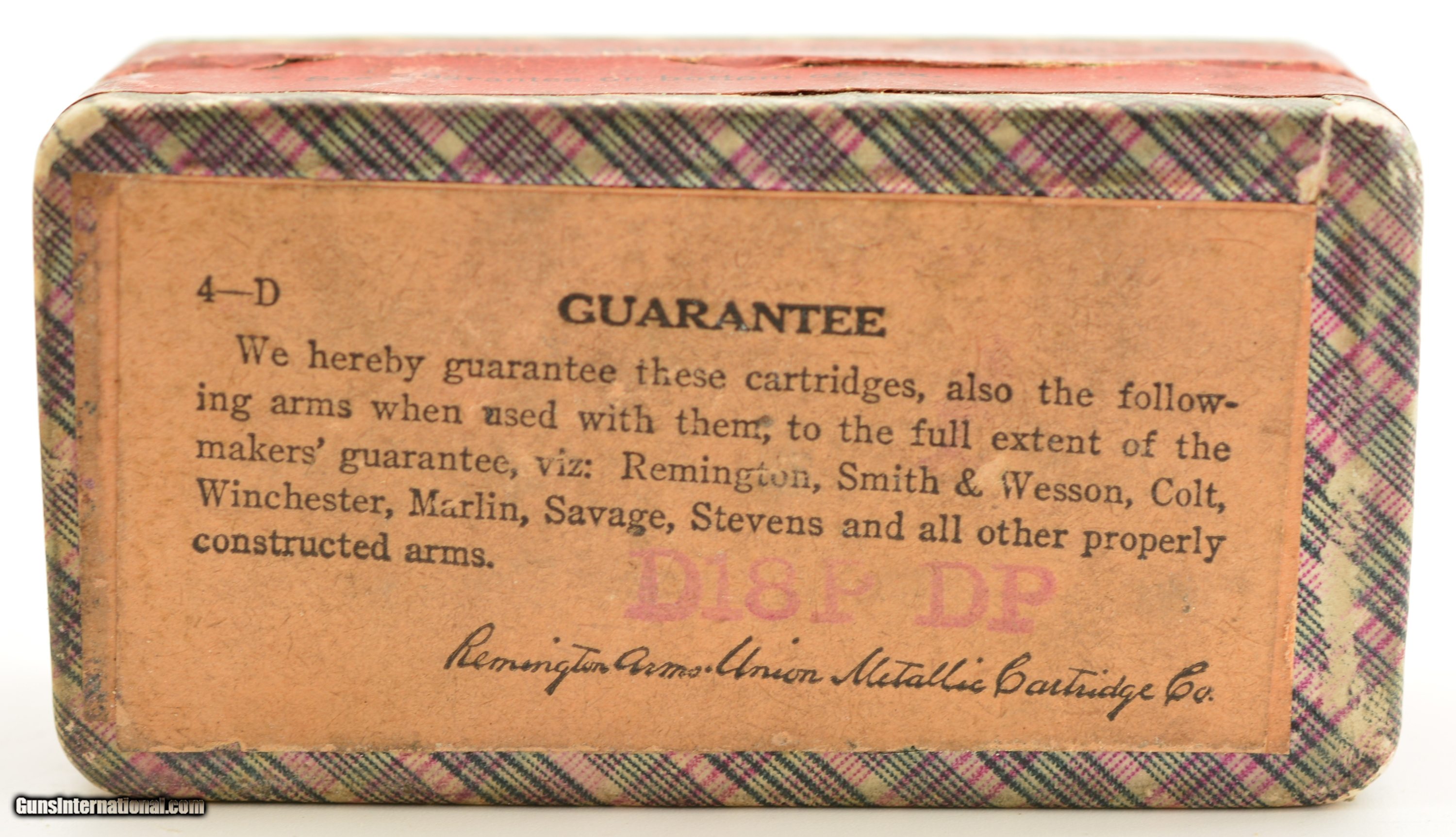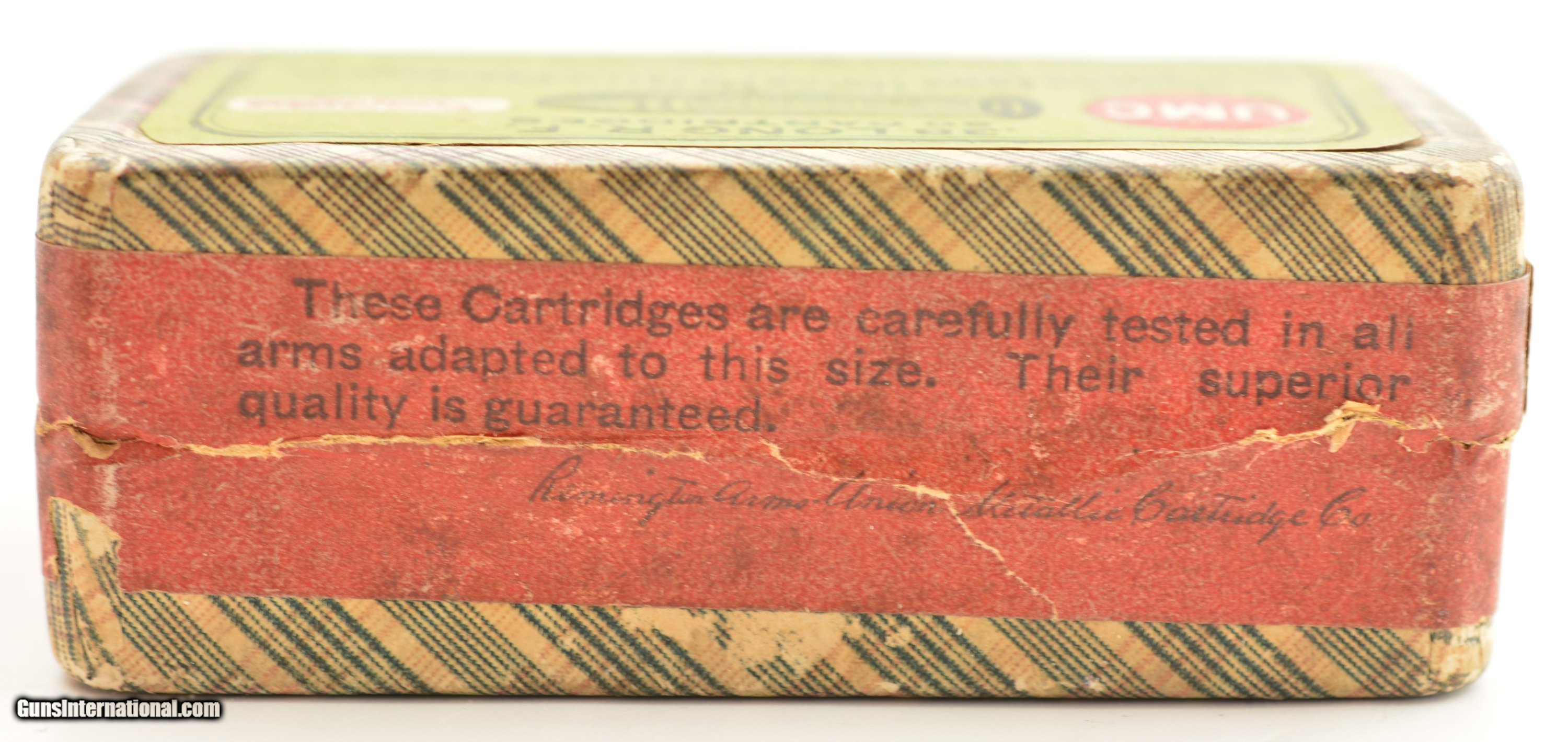 Description: This is a sealed, round corner, two piece full box of .38 Long Rim Fire black powder ammunition manufactured by Remington UMC. The “fabric" box is in excellent condition with bright colors and excellent graphics showing only light age soiling and some rub wear on the edges. SOLD Manufacturer: Remington Caliber Info: .38 RF Gauge Info: .38 RF |