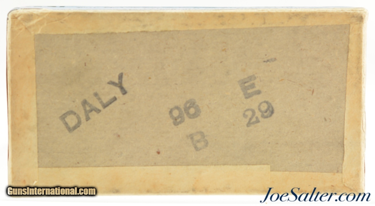 Description: This is a full and sealed box, 50 original rounds, of .38 Long Colt ammunition manufactured by the United States Cartridge Company in Lowell, Massachusetts. The blue and black label box has excellent, crisp color and graphics with call out for Colt's Double and Single Action revolvers. The box has age related seam separation on one bottom edge and the top side edges not uncommon for these heavier cartridges. A great looking box overall with specific Colt call outs that will make this a great display item. SOLD |