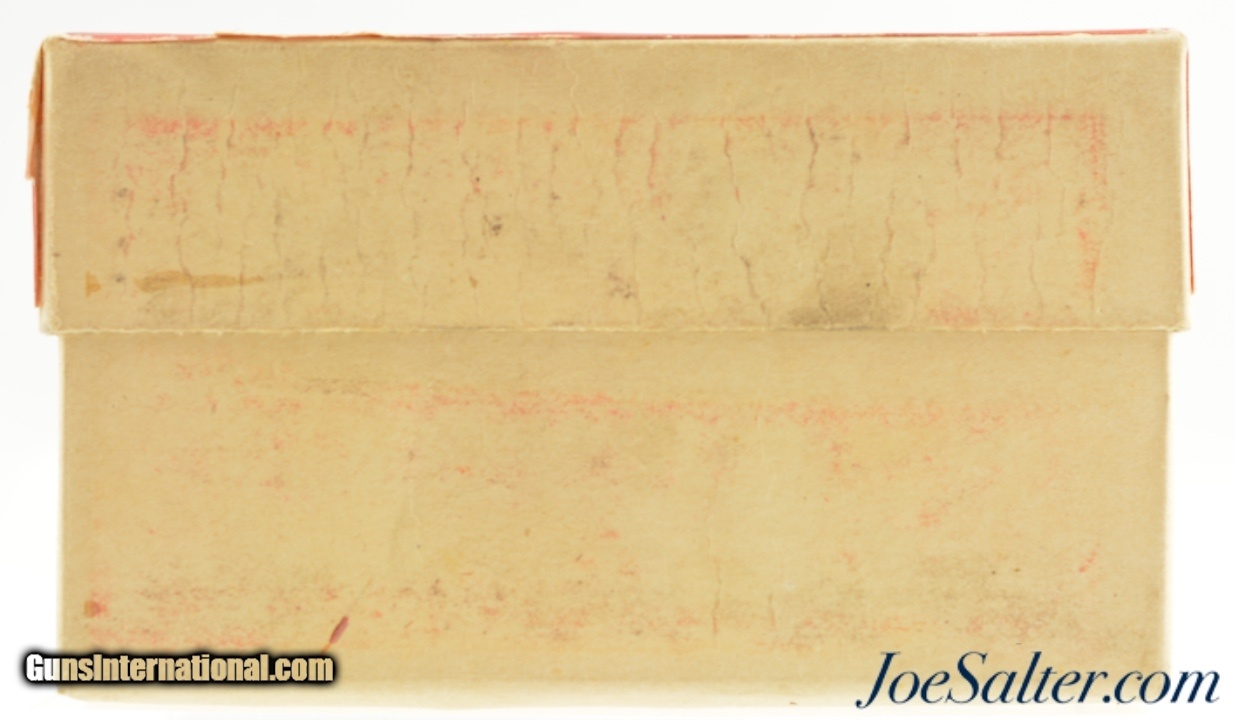 Description: This is a full and sealed box, 20 original rounds, of .30 Army (.30-40 Krag) ammunition manufactured by Winchester with 220 grain full patch bullets. The two piece red and black label box is in excellent condition with crisp graphics and bright colors featuring a nice cartridge cut and call outs for the Krag Jorgensen and Winchester Model 95 rifle. This is the 1930 & to early 1940's Non Mercuric Staynless box with "K" code and top label date of 3-30. An excellent, crisp box for the Winchester cartridge collector and to pair with your Krag or Model 95 rifle. SOLD |