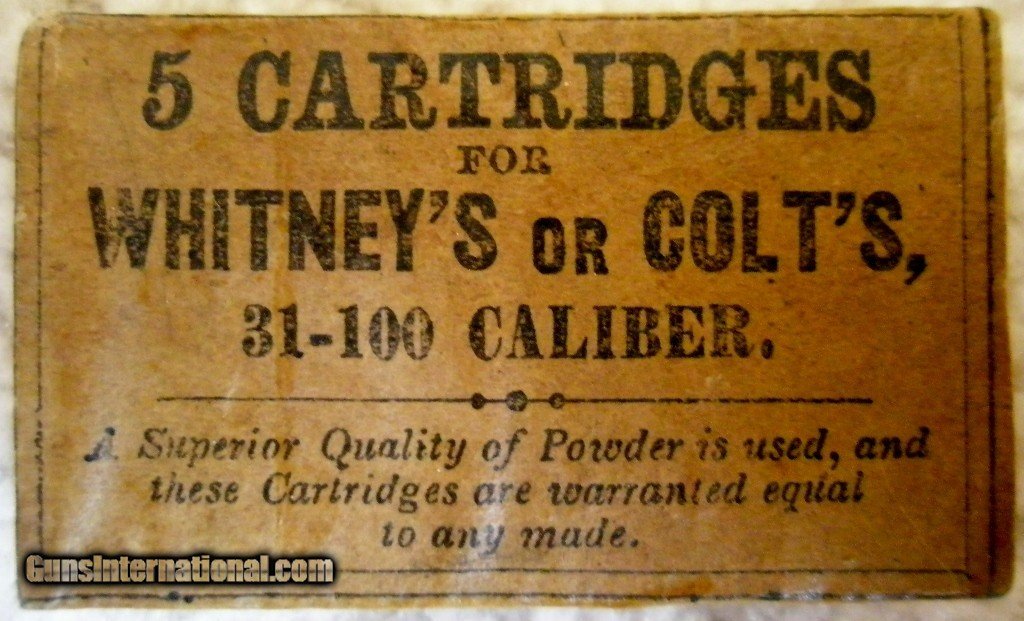 Description: This is a combustible 5-cartridge pack for the .31 caliber Colt Model 1849 or Whitney revolver, dating from the Civil War era. The pack is unopened and undamaged with the wire opener still sealed inside the package. The pack was sold by a New York City sporting goods retailer, Alfred Woodham, and his store's stamp is prominent on the back panel of the pack. Measures 2" x 1 1/4" x 1/2". Feel free to ask questions or for additional photos. SOLD. SOLD Handgun Caliber: .31 |