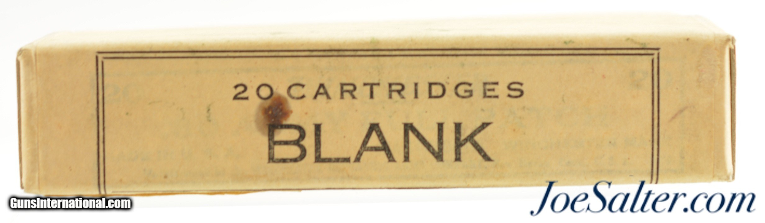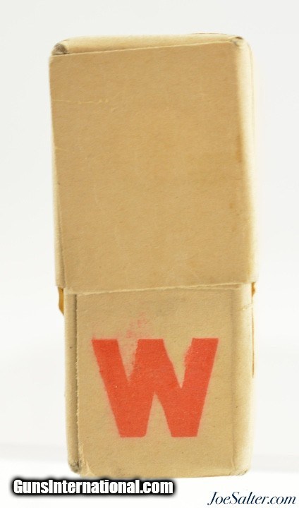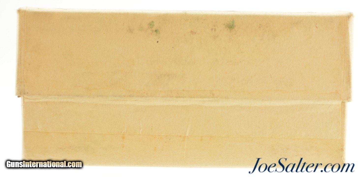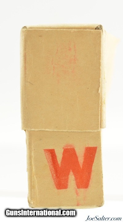 Description: This is a full and sealed box of .30 M1898 (.30-40 Krag) blank ammunition that was originally manufactured by Winchester and then re-labled at the frankford arsenal in December of 1943. The two piece buff box shows the red Winchester "W" on the lower box and has a second overlabel from Frankford arsenal with one corner neatly folded up to expose the original Winchester label below. The outer label states the cases were made by Winchester and then loaded at the Frankford Arsenal. Box and labels are in excellent condition. An interesting WWII box that belongs in any military ammo collection or to complete a Krag ammo display. Price: $195.00 Contact Seller |