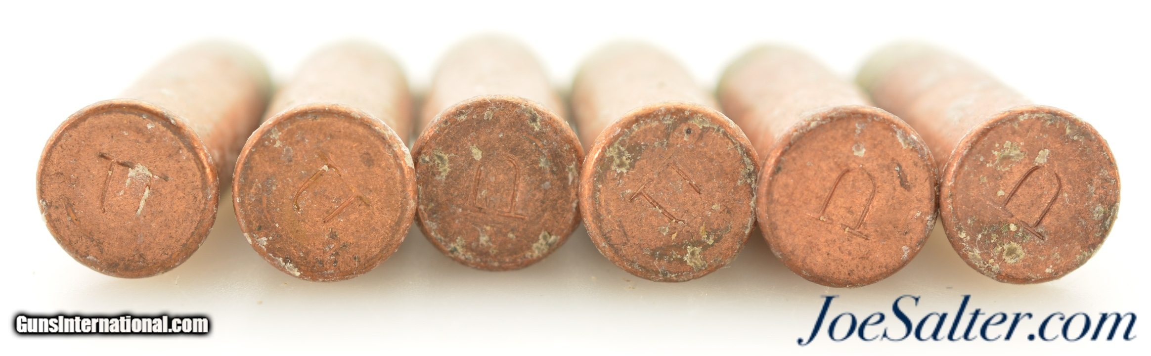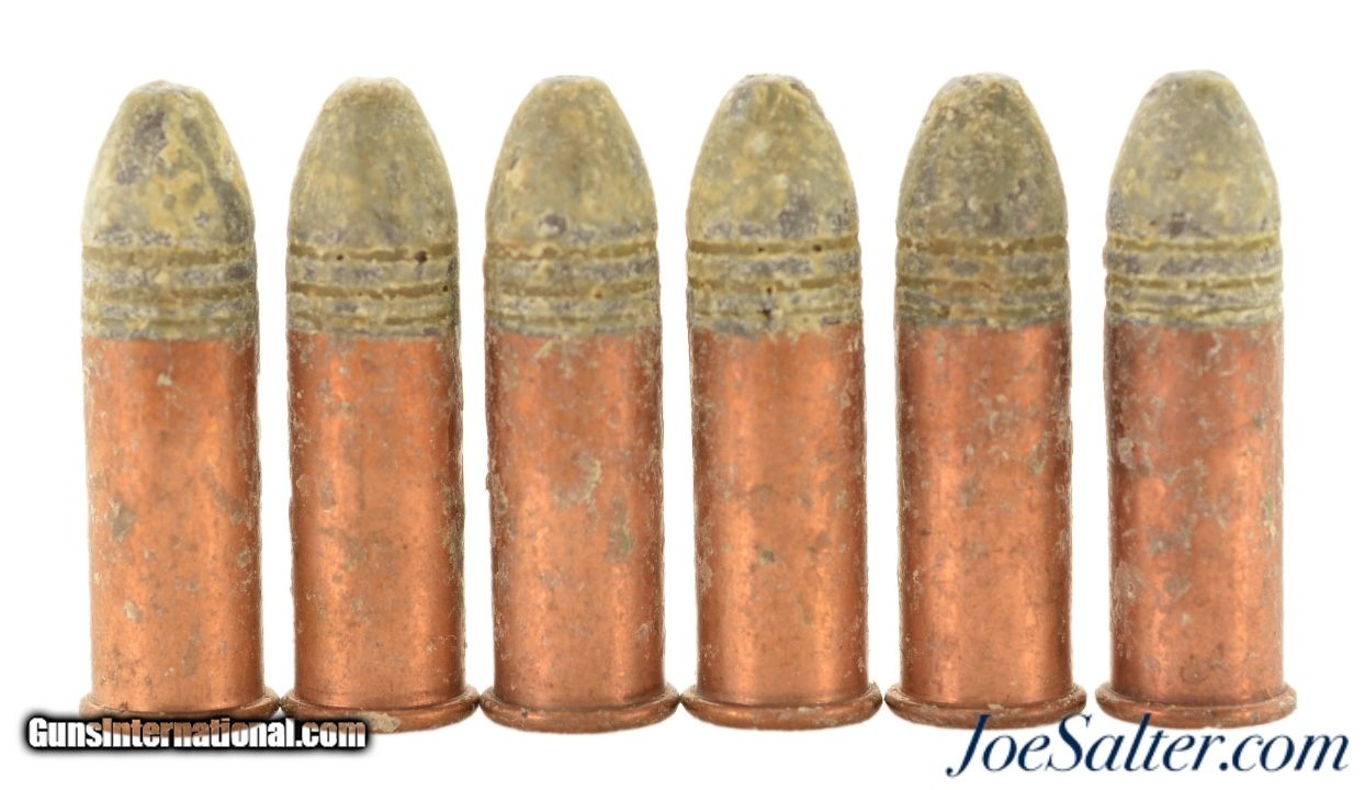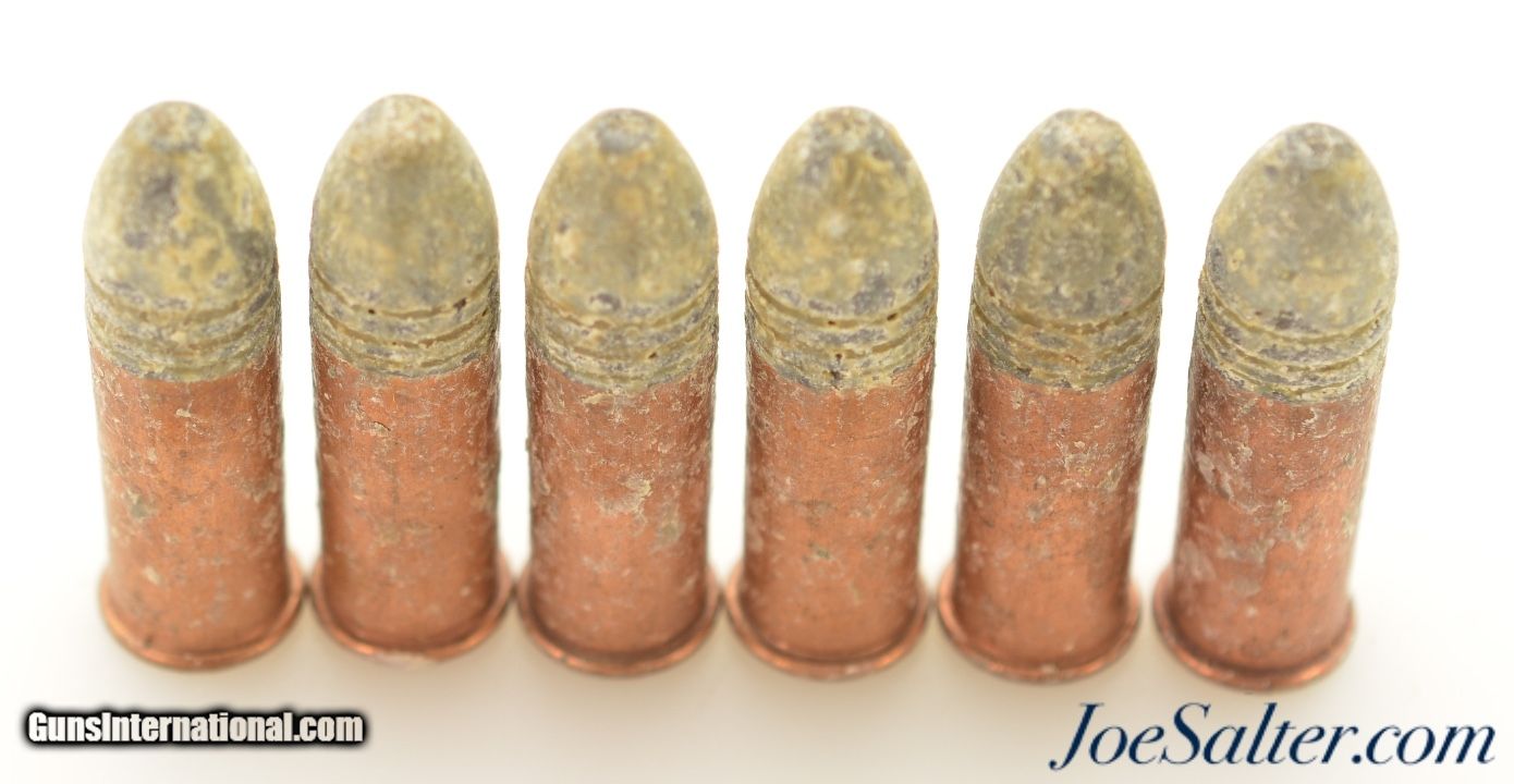 Description: This is a lot of 6 black powder rounds of .38 Long Rim Fire with "U" headstamp. The RF cartridges are in excellent condition with traces of the original bullet lubricant on the lead bullets and copper cases. Excellent to display with your old rim fire revolver.; SOLD |