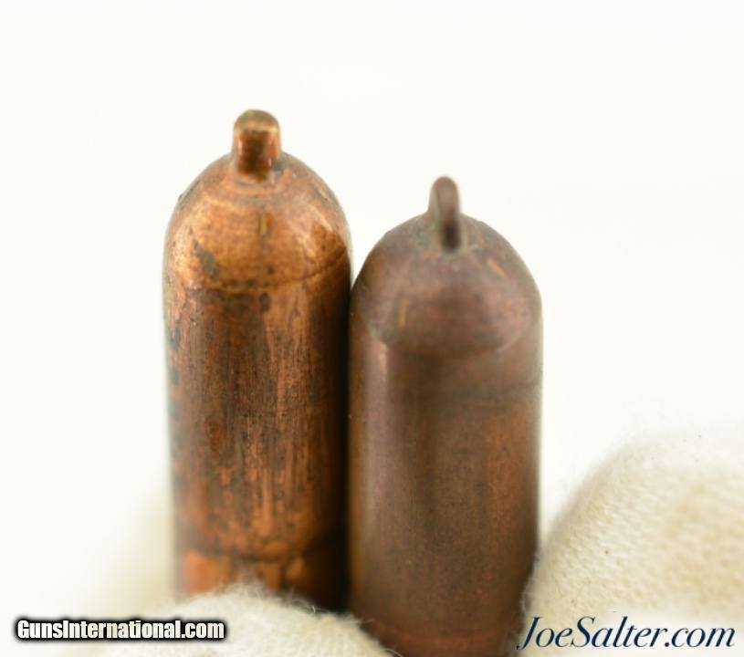 Description: This is a lot of two .32 Caliber National Teat fire cartridges. The two live rounds include one round and one flat teat. In excellent condition the round teat example has collector marking on the side and the flat one is unmarked. Great examples to display with your National Teat fire revolver. SOLD |