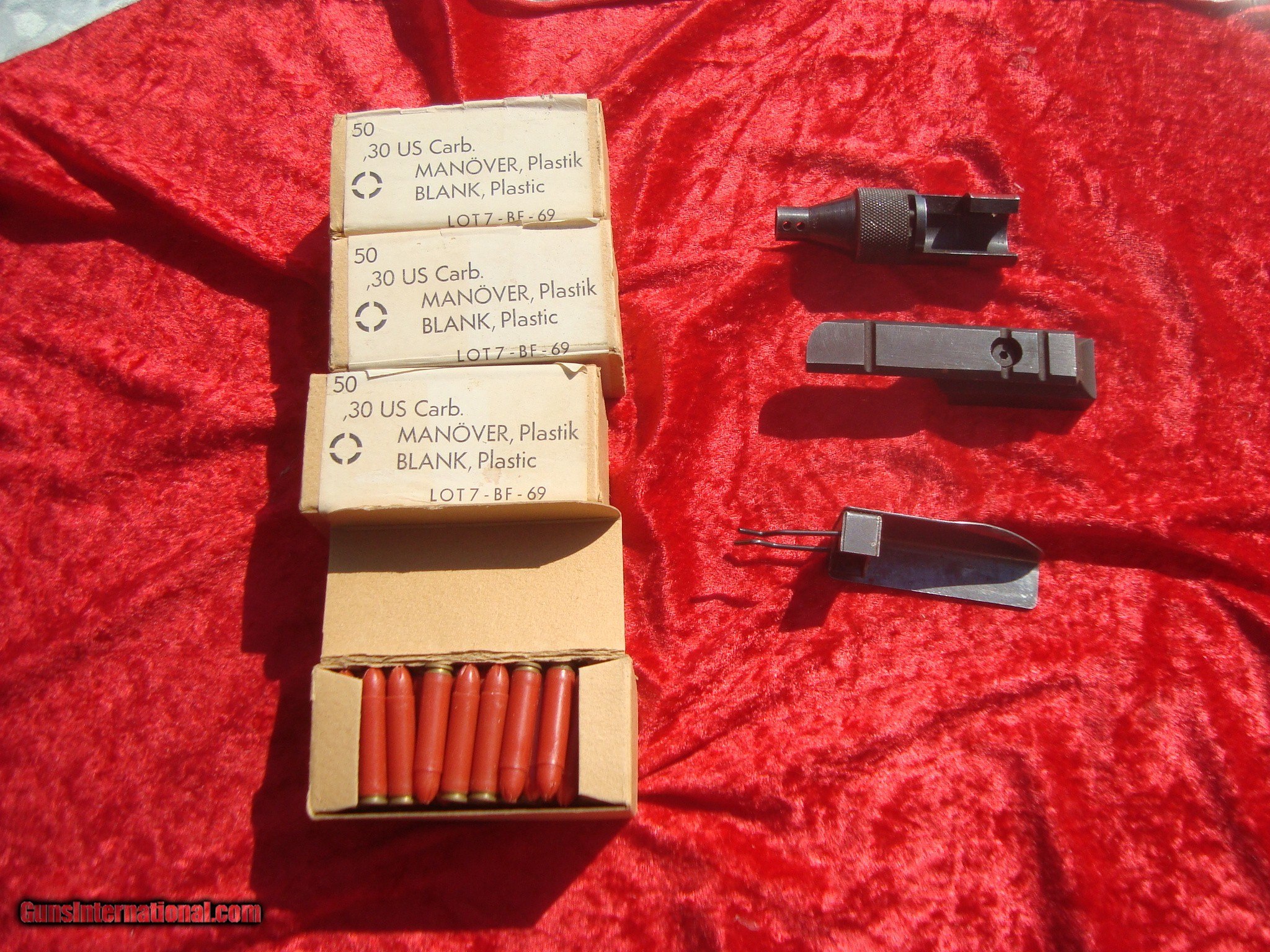 Description: M-1 Carbine blank firing kit, cosisting of 200 rounds of plastic reloadable blanks. 50 per box one box is open and 3 are sealed. Plus a Blank adapter, shell deflector, and a rear scope mount. $ 8.00 shipping. SOLD |
