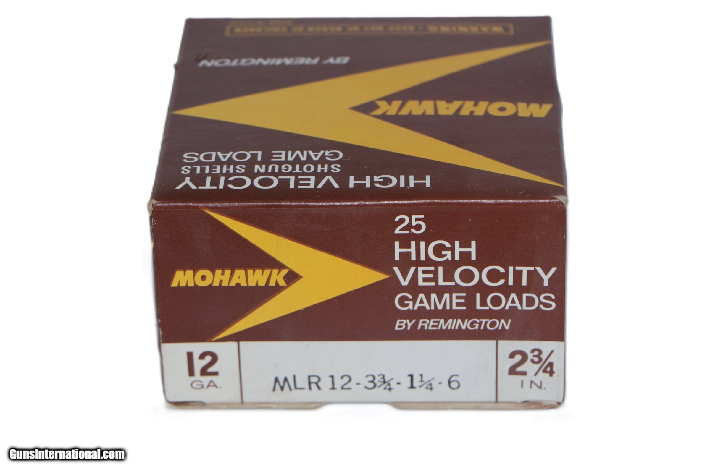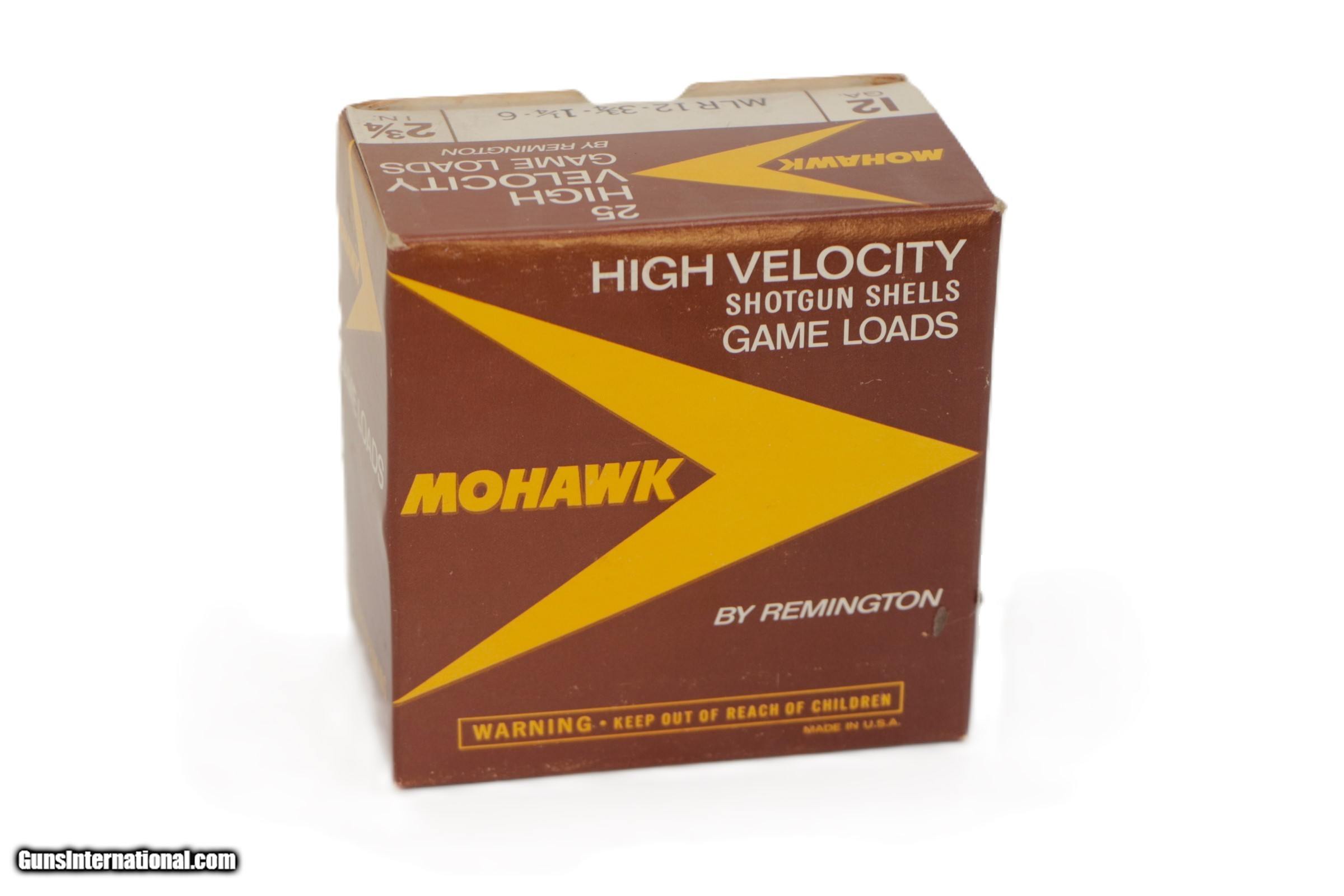 Description: Mohawk by Remington, 12 Gauge, 2-3/4", 1-1/4 oz, Shot Size 6, MLR12. Box and ammo are pristine. Add $16.50 S+H. 4 Available. Add $1.50 Shipping for each add'l box SOLD Shotgun Gauge: 12 Gauge