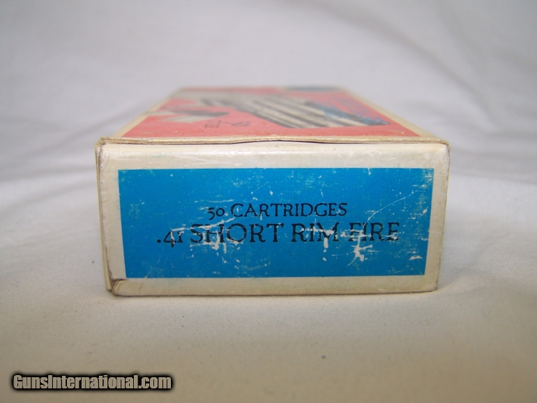 Description: We are offering a box of vintage NAVY ARMS .41 Short Rimfire ammunition. This box houses a complete 50 rounds. This one piece box is very attractive. It has been carefully opened and remains in very good condition. Inner box has a couple taped corners. Colors are bright; highly legible. Ammunition is in its original form and has been untouched. *** WE ONLY ACCEPT VISA AND MASTERCARD *** Shipping via UPS GROUND is $15.00 We require ID for new customers. NO SALES TO MA, CA, CT or NY SOLD |