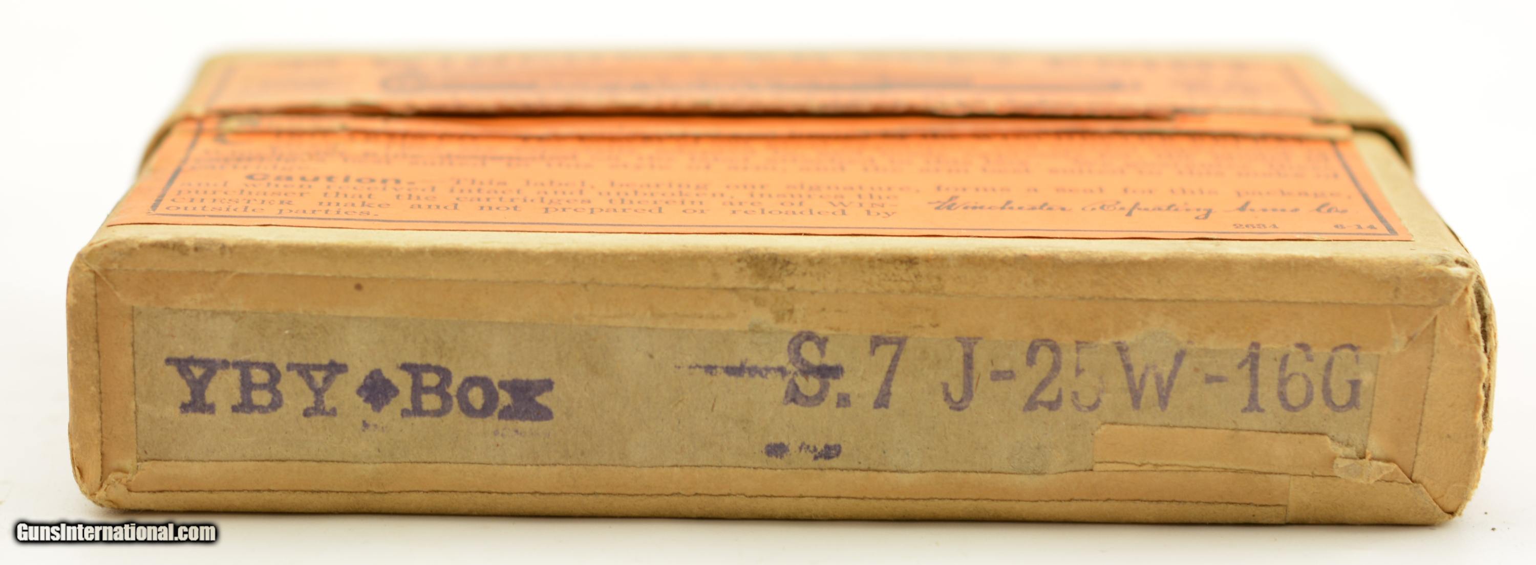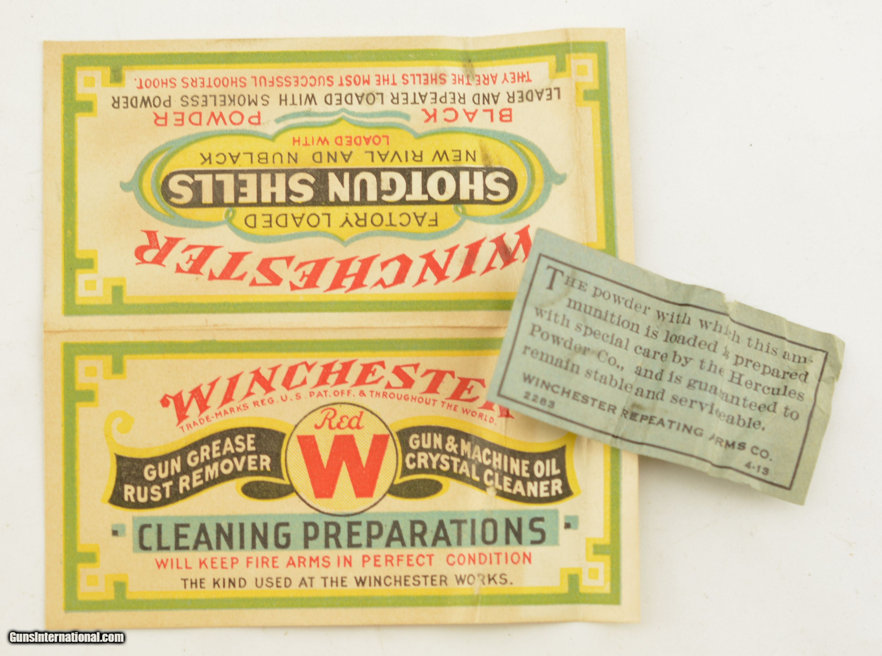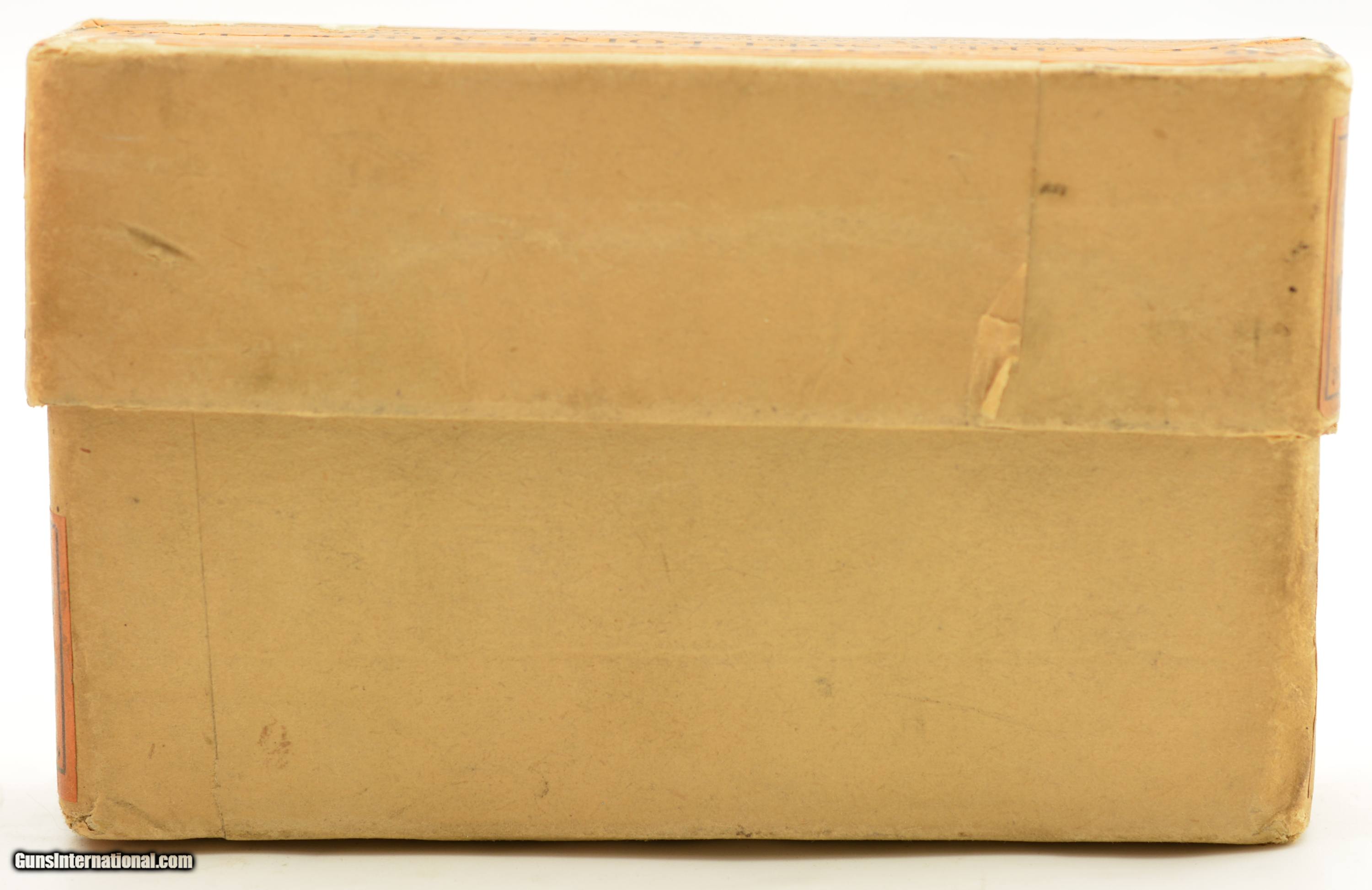 Description: This is a full box, 20 original rounds, of .35 Winchester ammunition manufactured by Winchester in a two piece, round corner box with 6-14 primary and 10-6 lid date codes. The orange and black labeled box is in near excellent condition with crisp graphics and excellent cartridge cut with a seam separation on the bottom right corner, some flaking to the top label and overall mild rub wear to top label. Included is an original 4-13 dated powder insert calling out the Hercules Powder Company and a 5-14 dated Winchester insert advertising shotgun shells and gun cleaning supplies. The cartridges are in excellent condition with “W.R.A. Co." head stamp and “w" primers. SOLD Manufacturer: Winchester Model: Ammo Caliber Info: .35 Win Gauge Info: .35 Win |