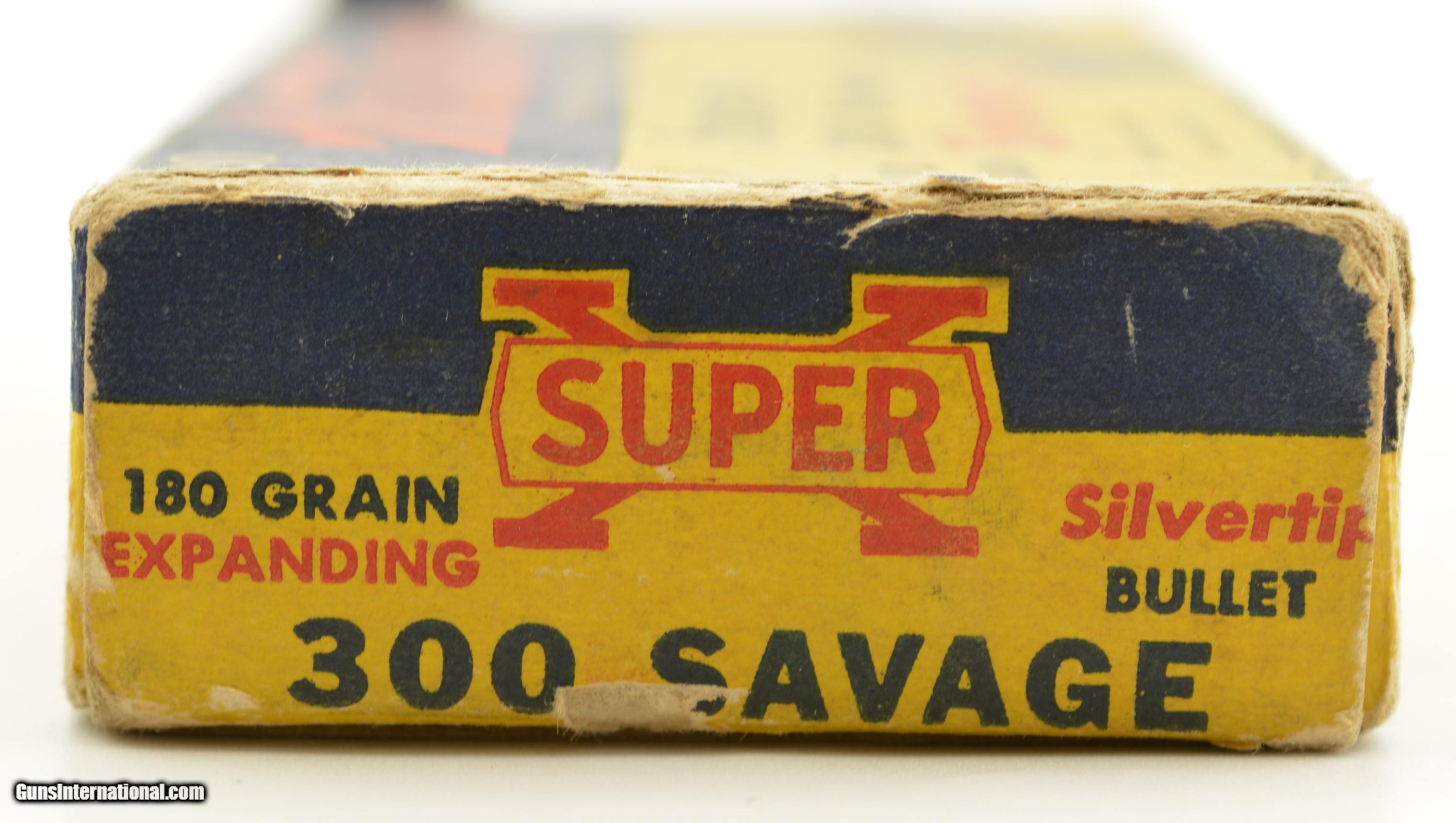 Description: This is a partial box, 10 original rounds of .300 Savage ammunition manufactured by Western with Super-X 180 grain Silvertip bullets. The one piece “Grizzly Bear" box is in poor condition with the right flap an some of the top image missing with a tape repaired slide out tray. Still a colorful box with most of the iconic graphics and 10 cartridges in excellent condition. SOLD Manufacturer: Western Model: Ammo Caliber Info: .300 Savage Gauge Info: .300 Savage |