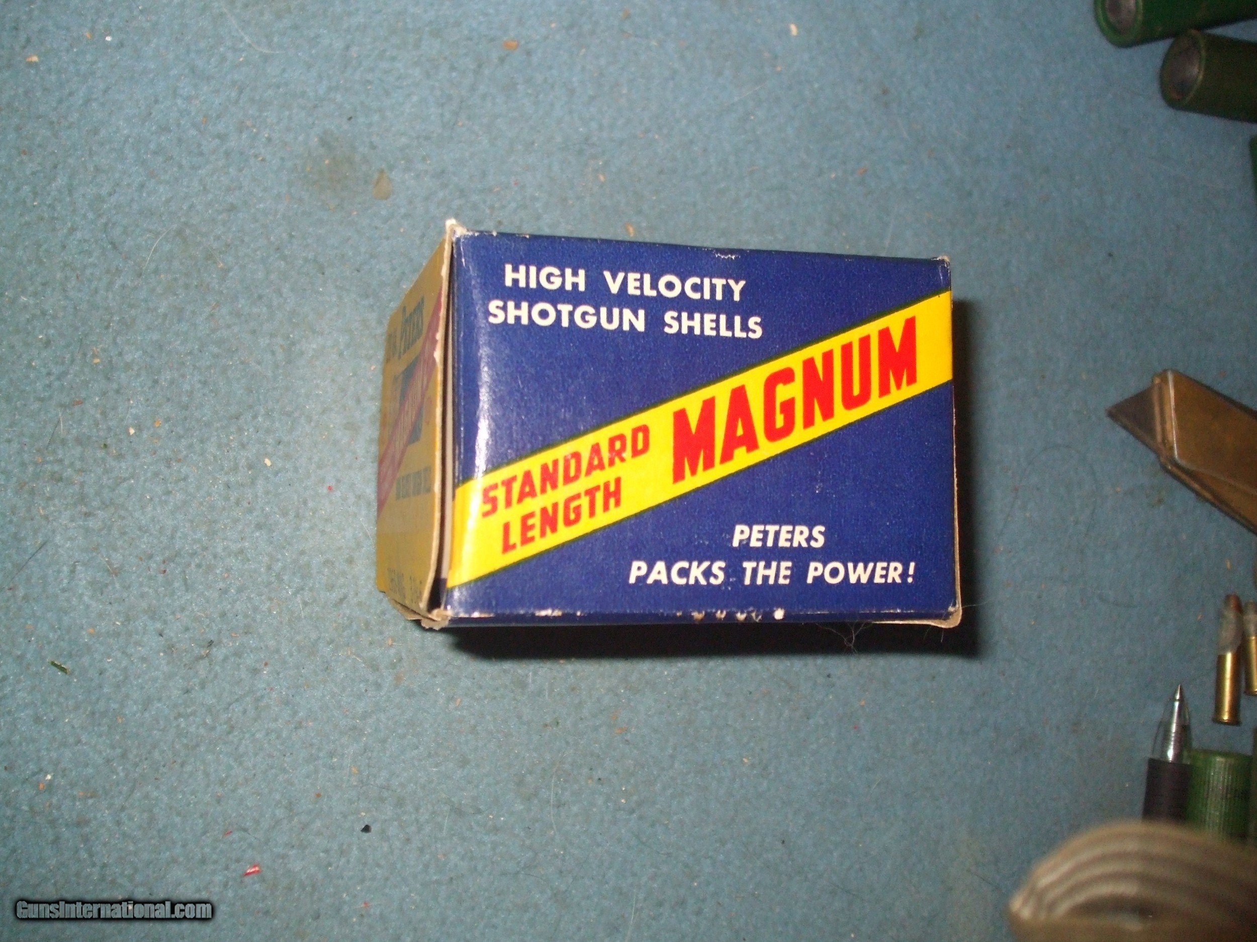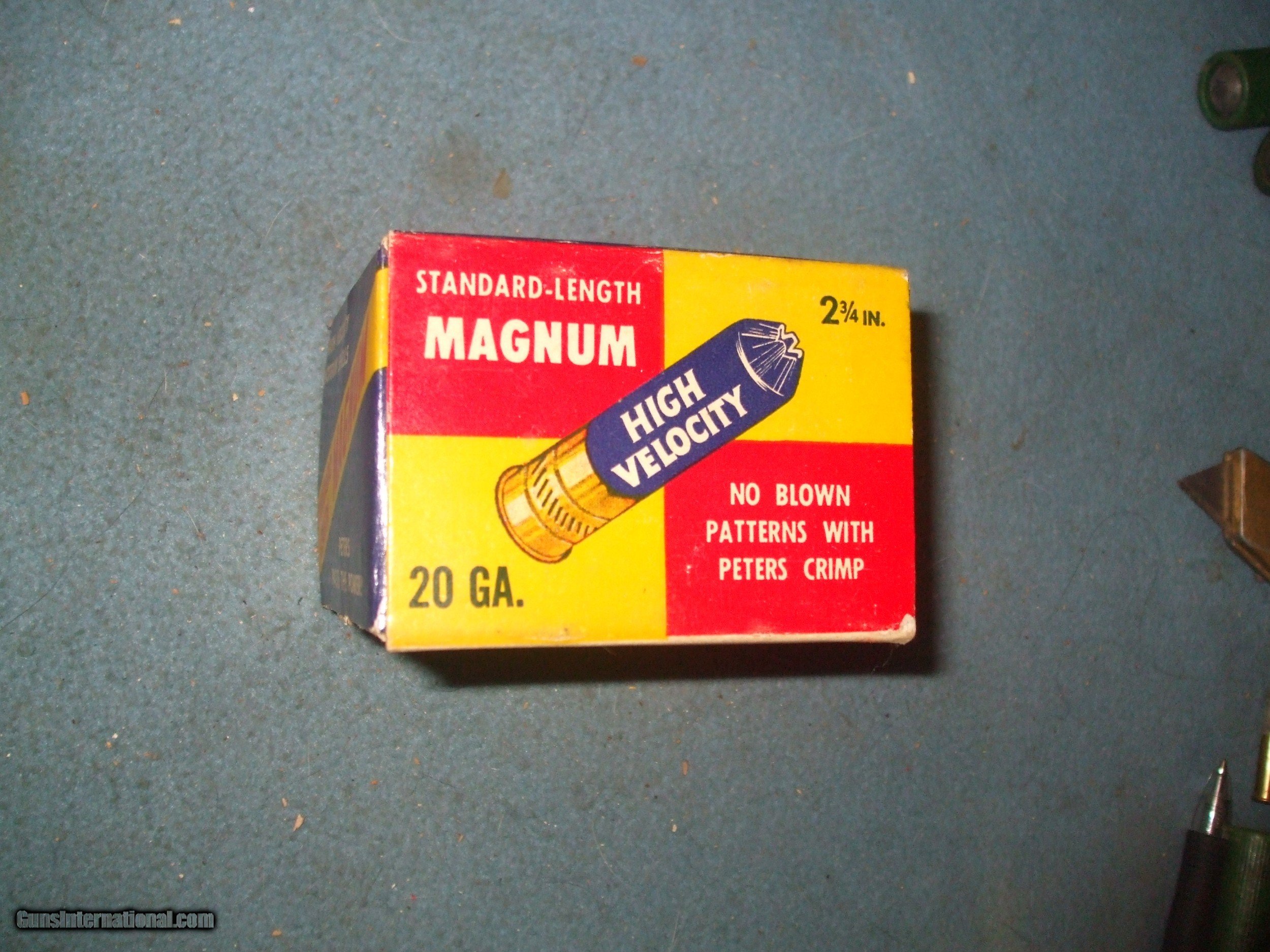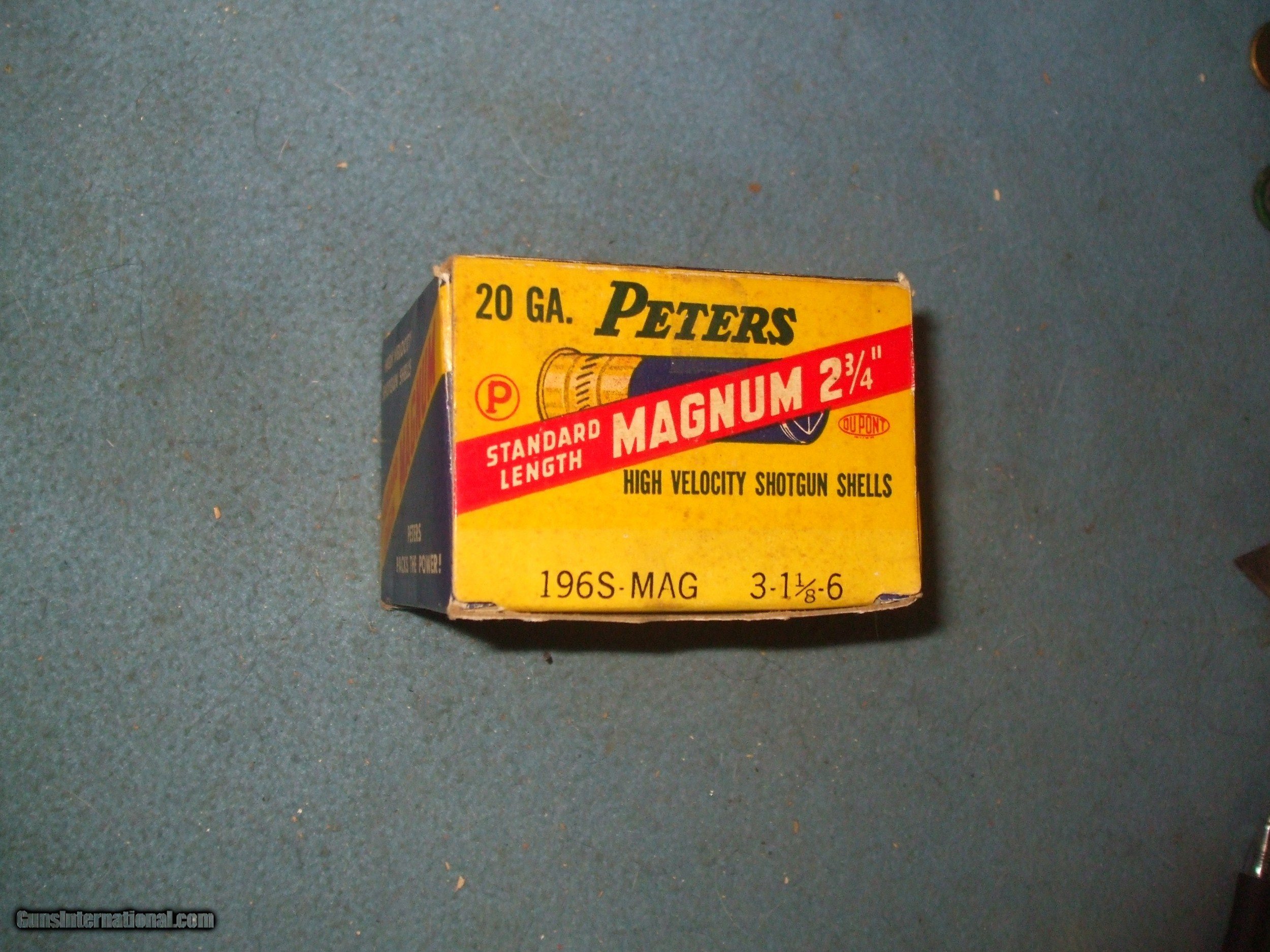 Description: Peters 20ga 23/4" magnum #6 paper shell pie crimp. Full box 25rds. Unusaul magnum load 3-11/8-6. Code 196SMAG. Box very good shells excellent. Please note cannot ship to CA, MA, NJ, IL or any other restricted areas. I am located in Delaware and can deliver locally. SOLD Shotgun Gauge: 20 Gauge |