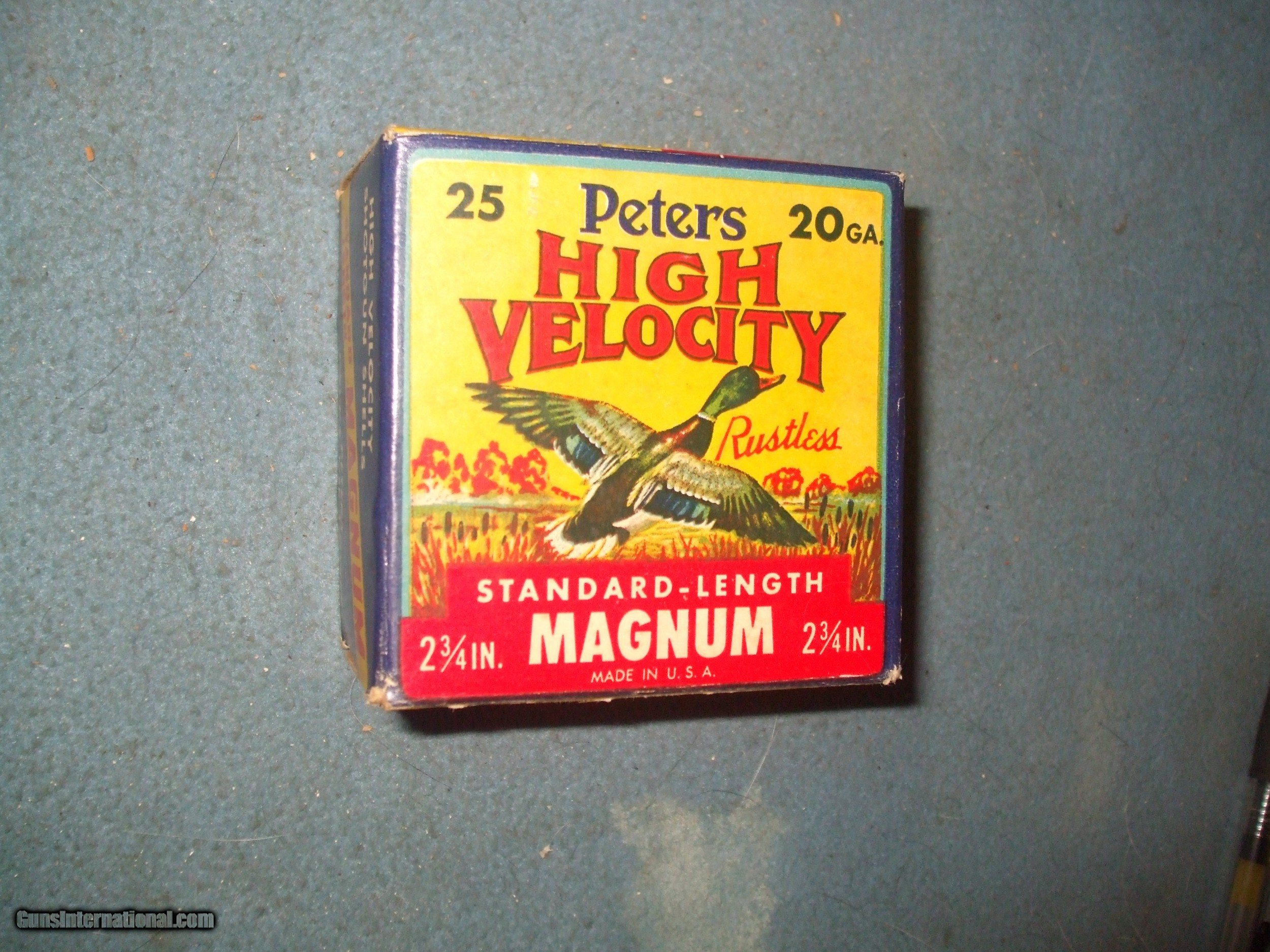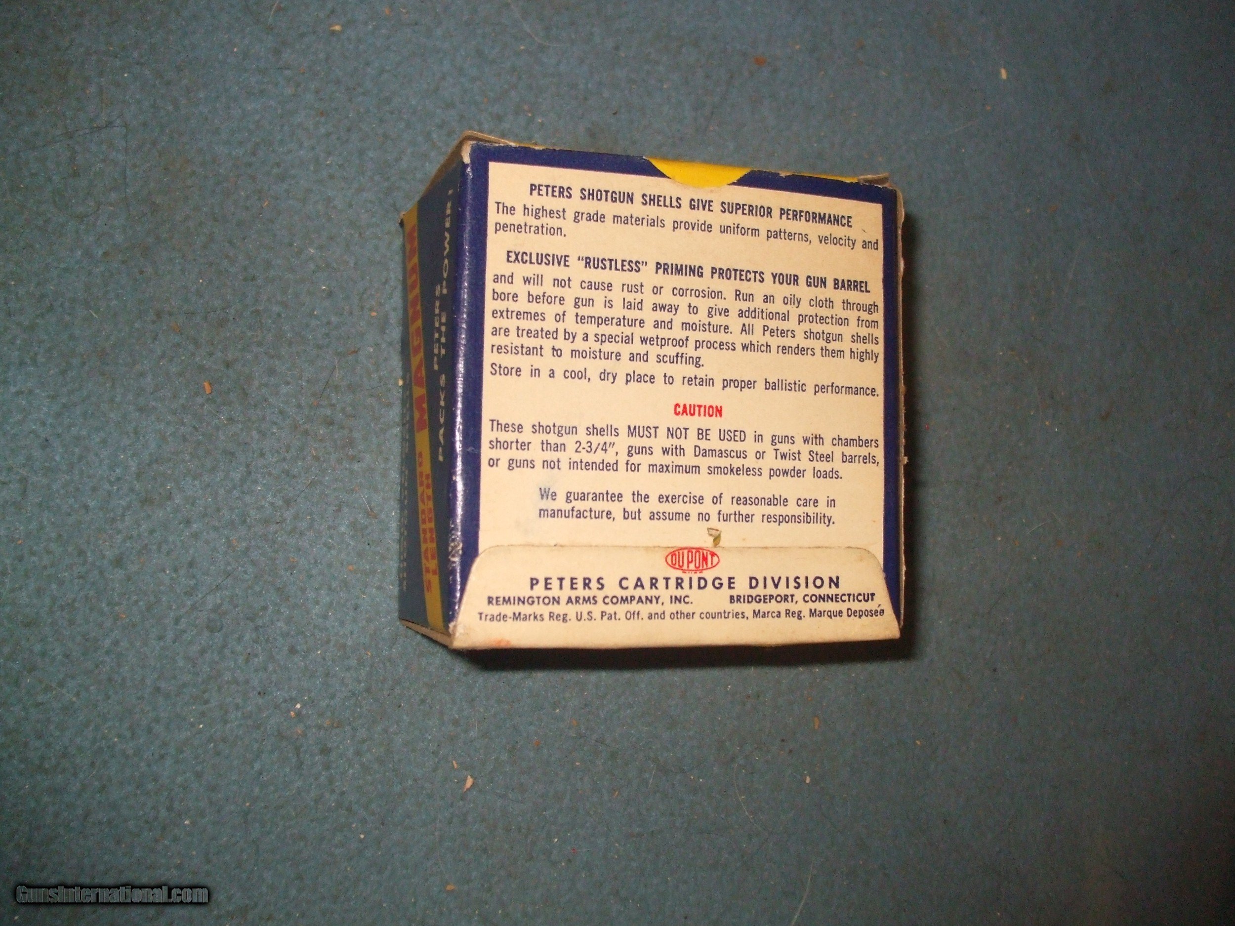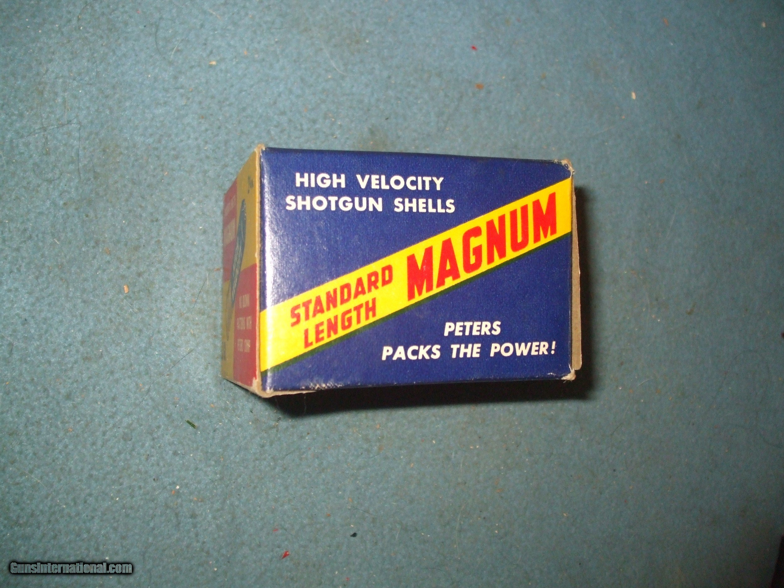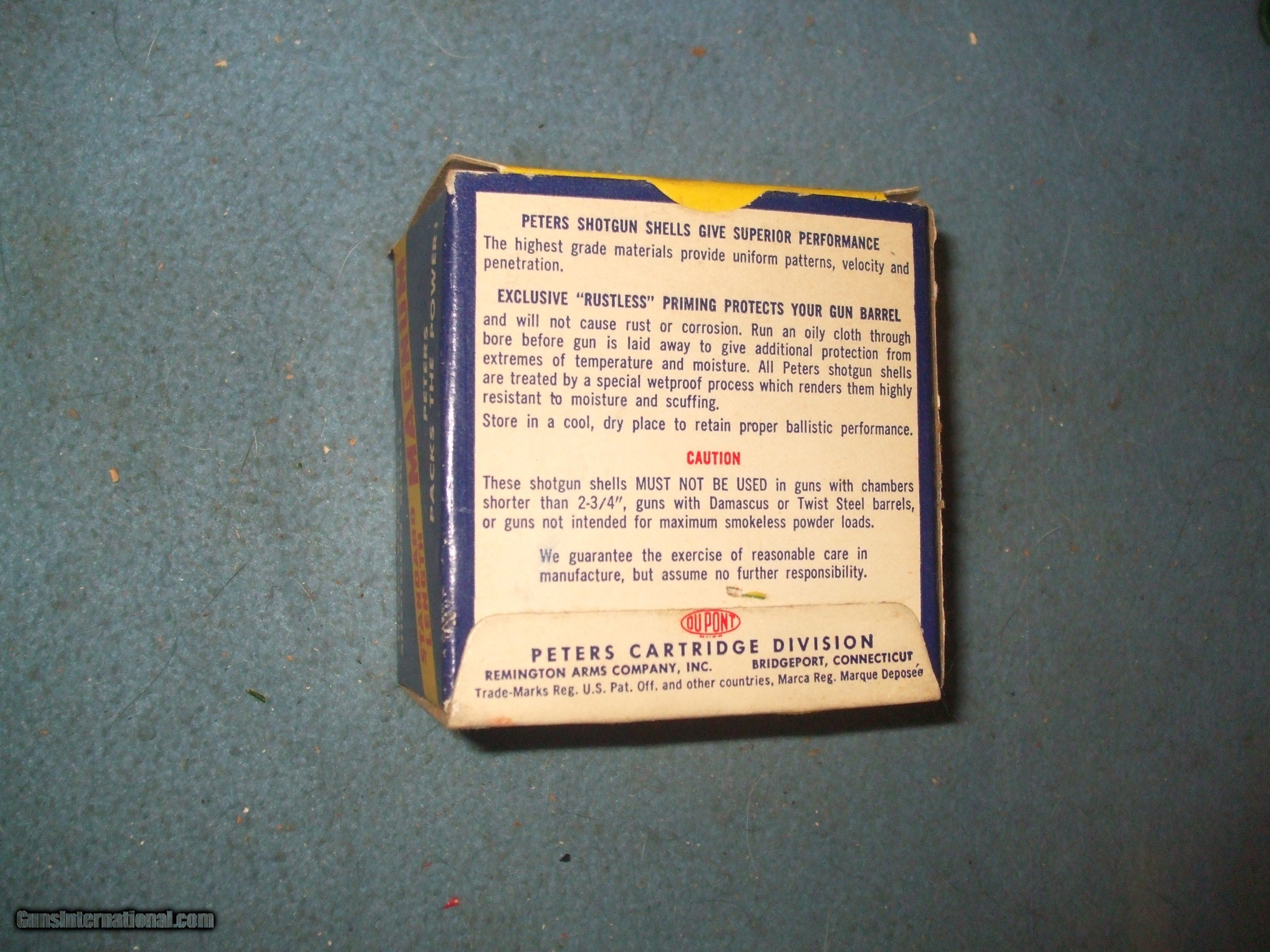 Description: Peters 20ga 23/4" magnum #6 paper shell pie crimp. Full box 25rds. Unusaul magnum load 3-11/8-6. Code 196SMAG. Box very good shells excellent. Please note cannot ship to CA, MA, NJ, IL or any other restricted areas. I am located in Delaware and can deliver locally. SOLD Shotgun Gauge: 20 Gauge |