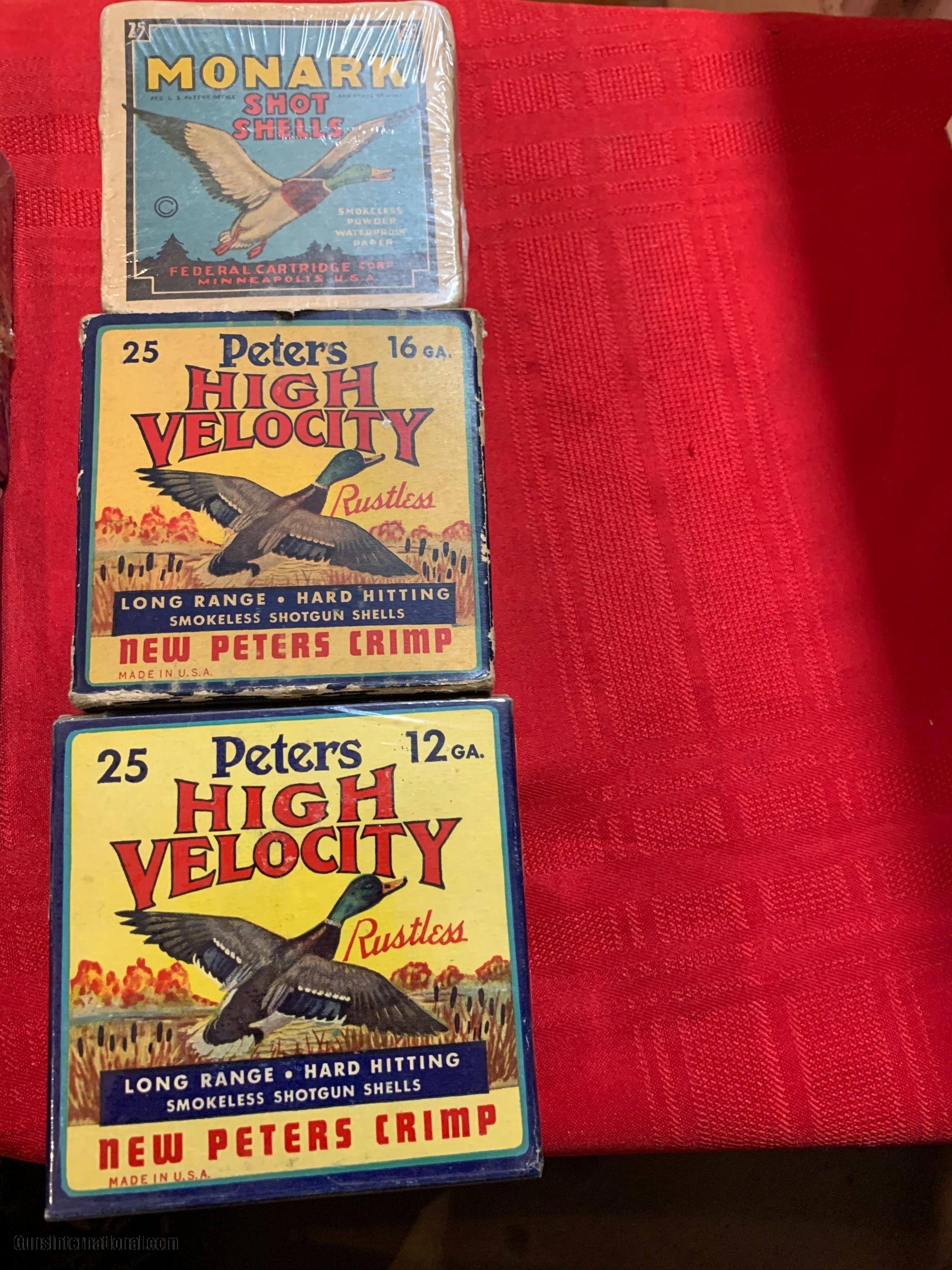 Description: 1 box Peters 12 ga. 1 Box less 1 round Peters16 ga. 1 Box Federal 20 ga. Aii Paper Shells SOLD Shotgun Gauge: 12 Gauge, 16 Gauge, 20 Gauge |