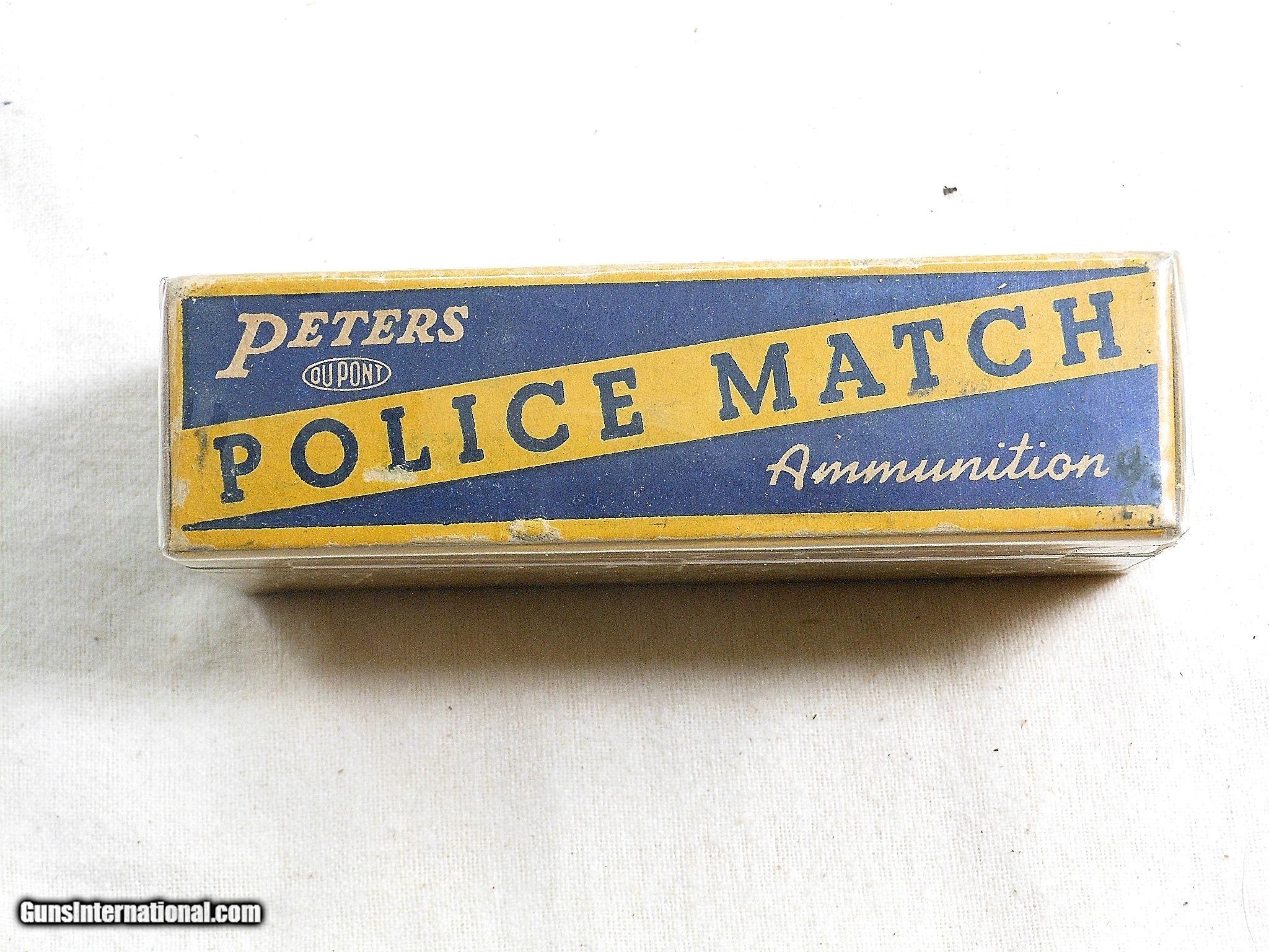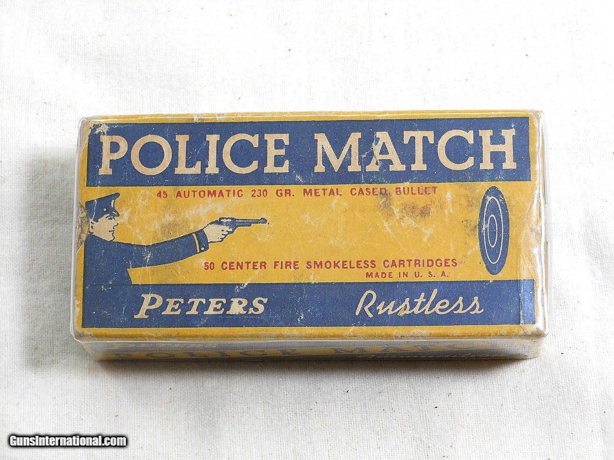 Description: This is a full box of match ammunition. It is loaded with 230 grain full metal cased bullets. The shells are in fine condition. The box shows storage wear. The graphics are clear and strong. The end tabs are intact. This is a great box from Peters Cartridge Co. with the police graphics. The box is sound and is very collectable for display. Search for hlvfineguns on google for more details. CK (10) F. No. 410 -18 SOLD |