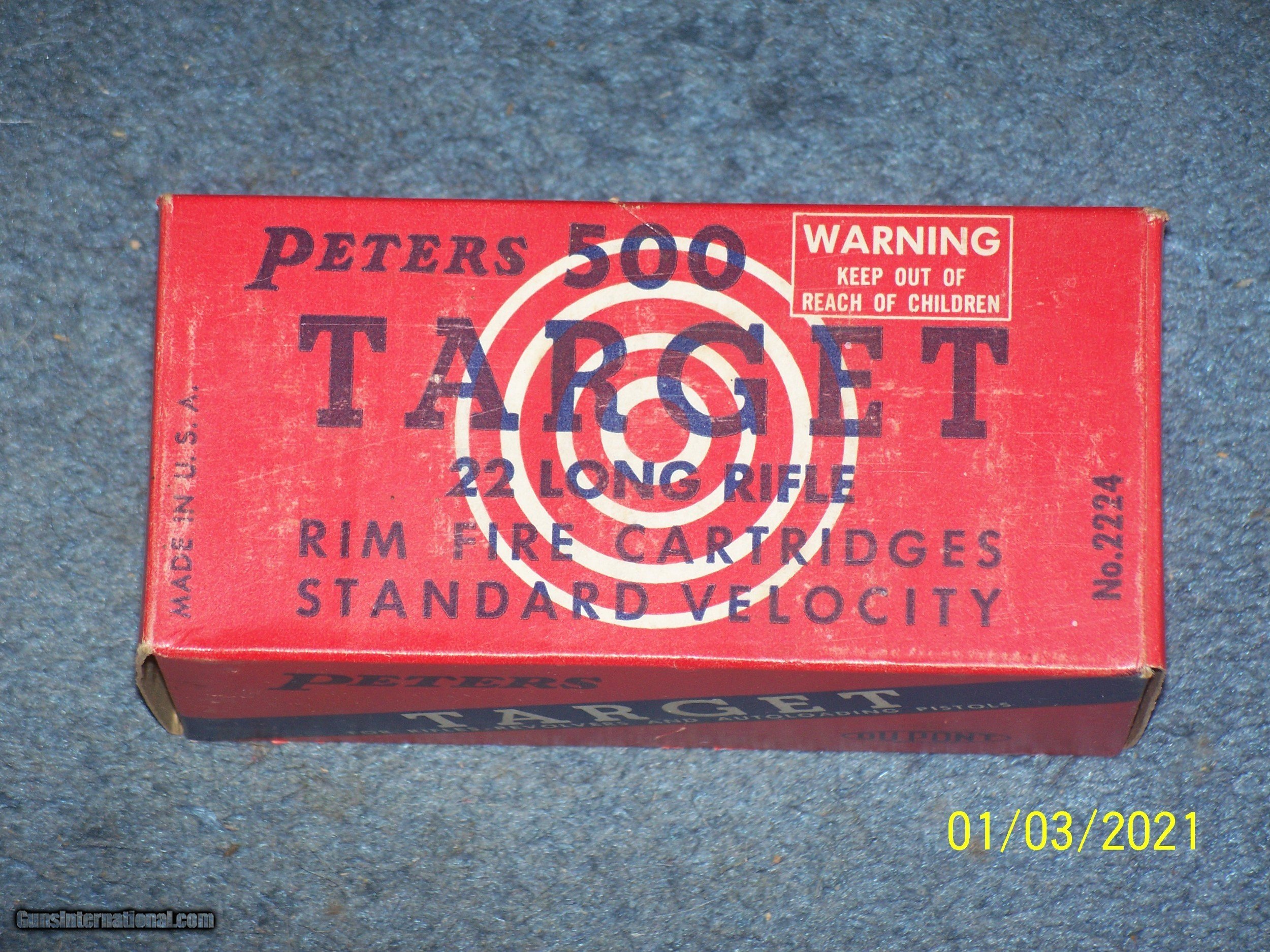 Description: My dad bought this 500 round brick in the early 1960's, it has been stored since, and never opened. Collector quality. Shipping to USA is $20. We will not ship to CA, CT, MA, IL, NY, HI, NJ, MD or any city prohibiting ammo sales. We will need a copy of your ID to process the order. Phone & fax is 860 666 2184. Joe SOLD |