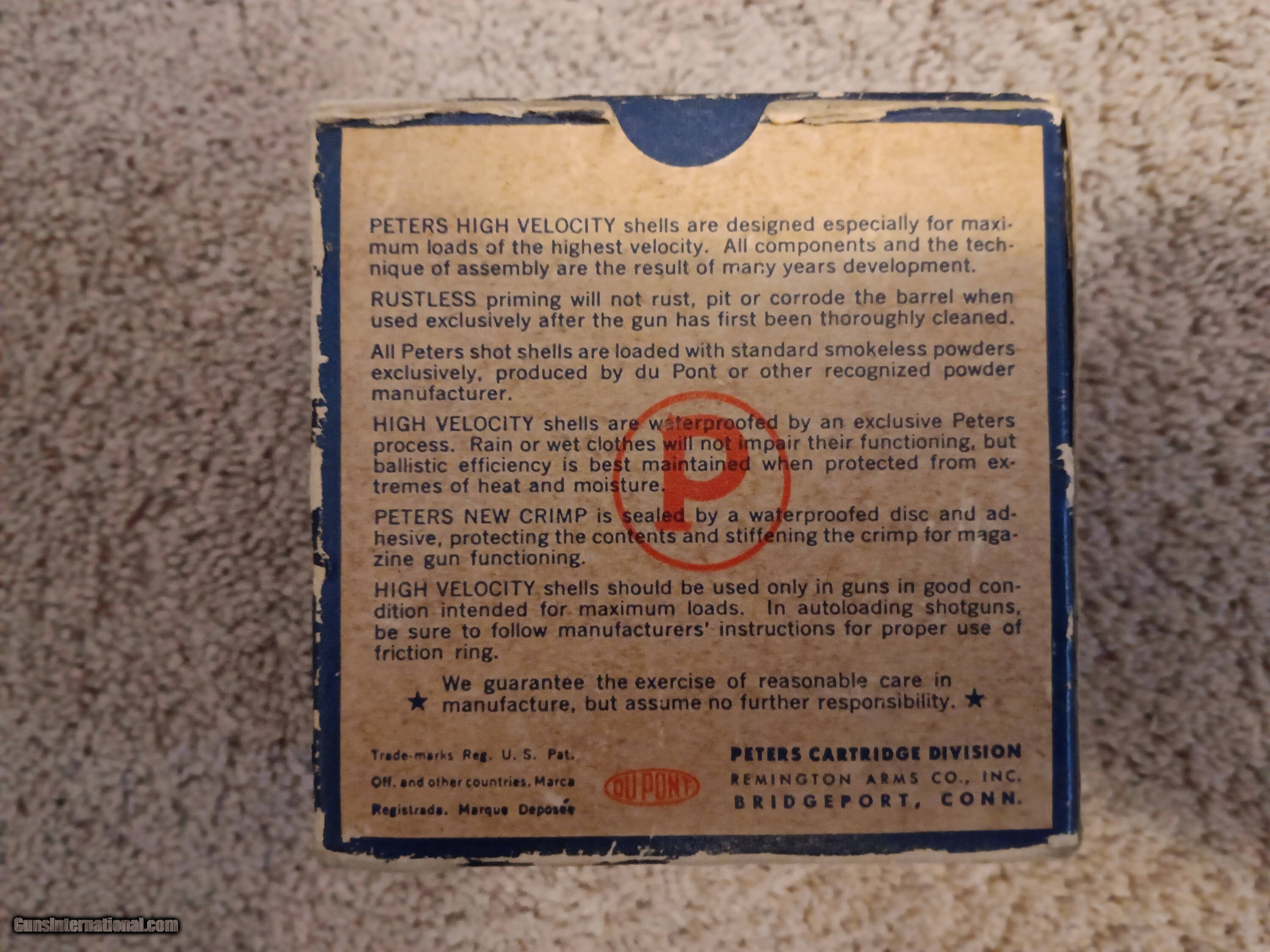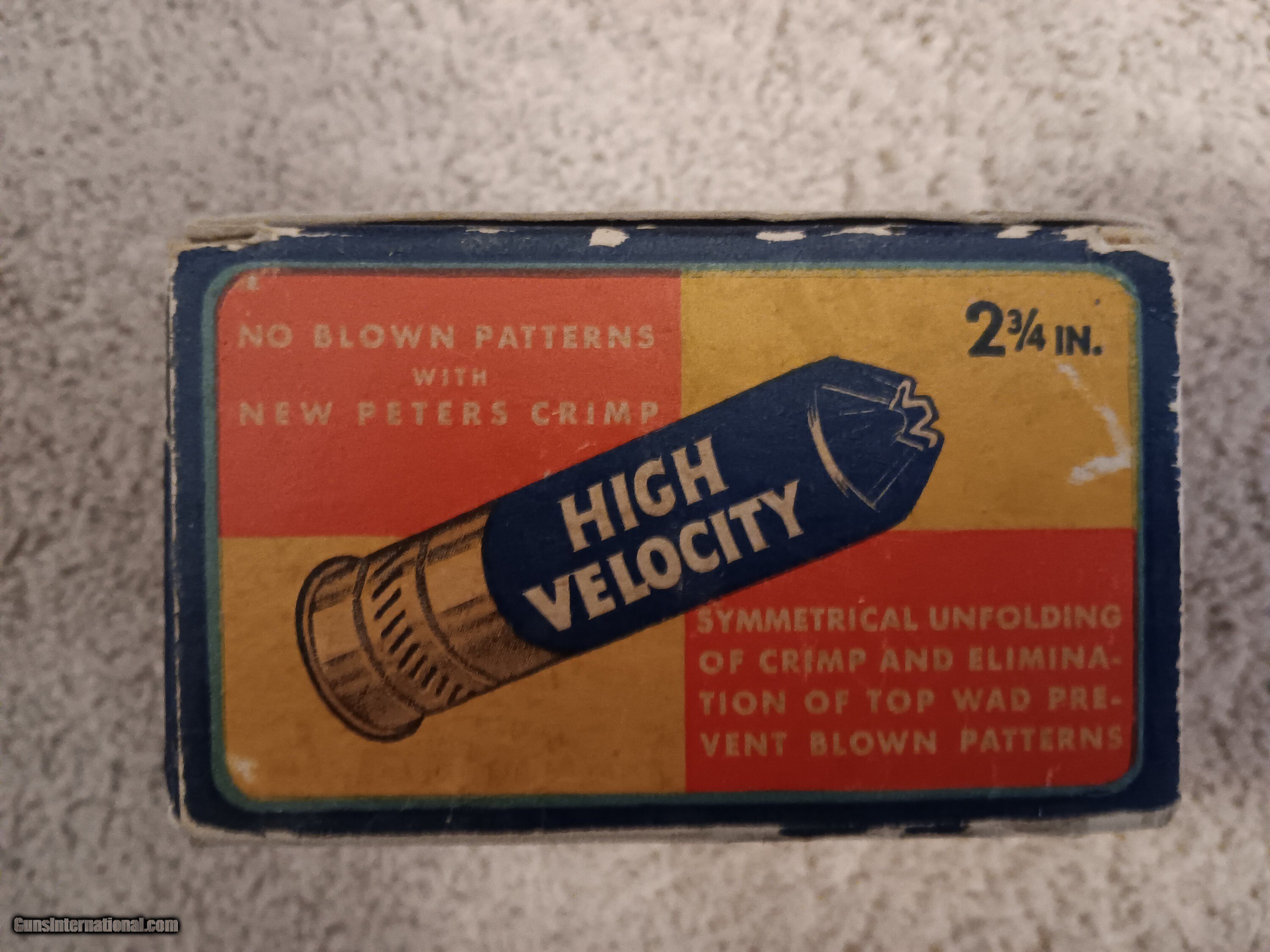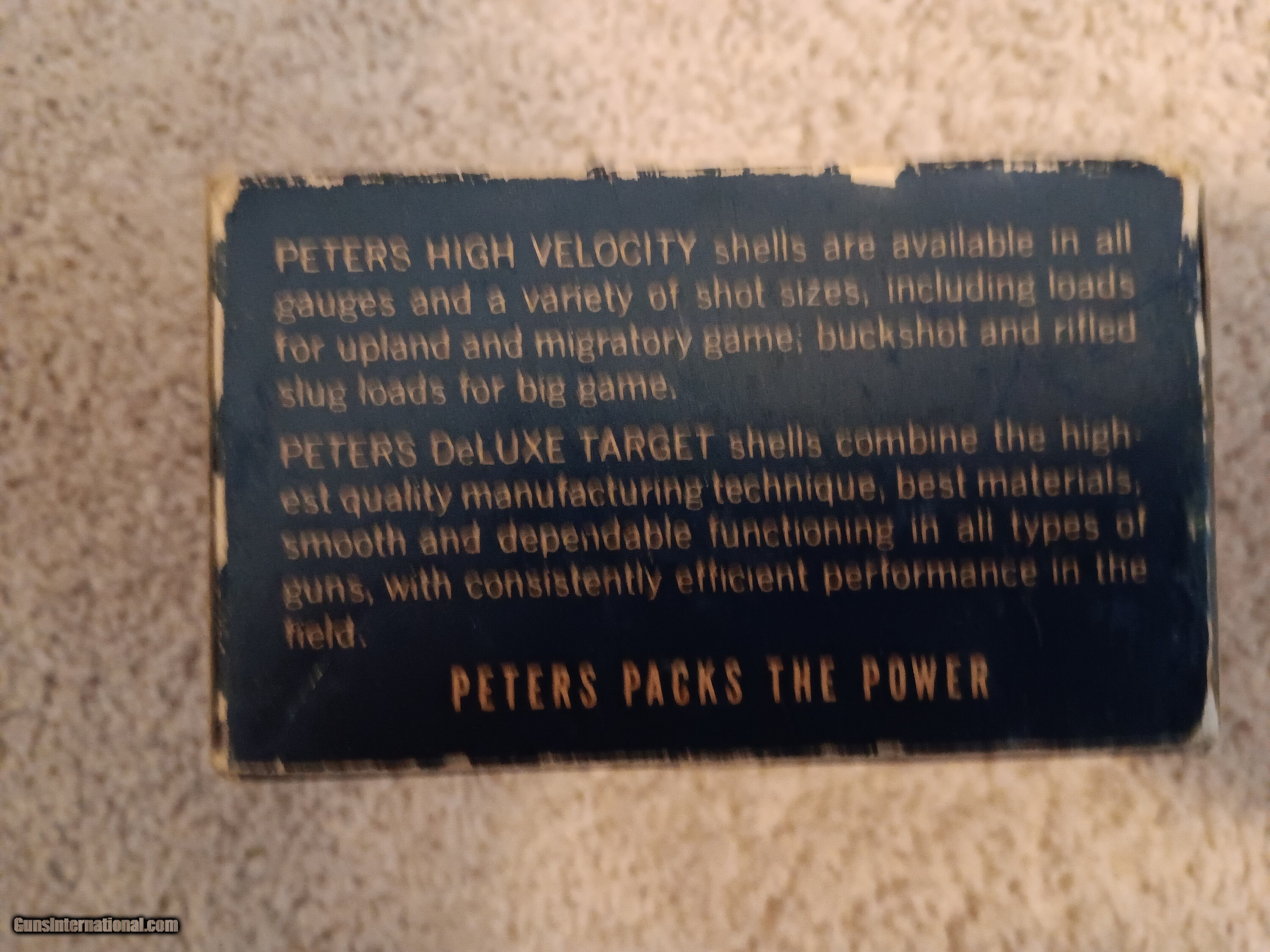 Description: Im selling a nice vintage Peters High Velocity 12 ga box with 25 shells. Nice bright color with some edge ware. $70.00 Shotgun Gauge: 12 Gauge Price: $70.00 Contact Seller |