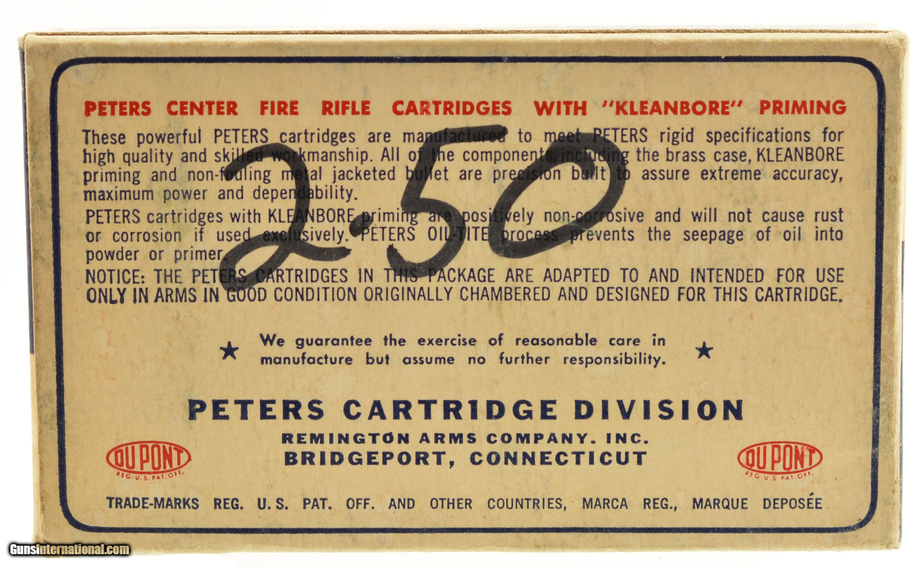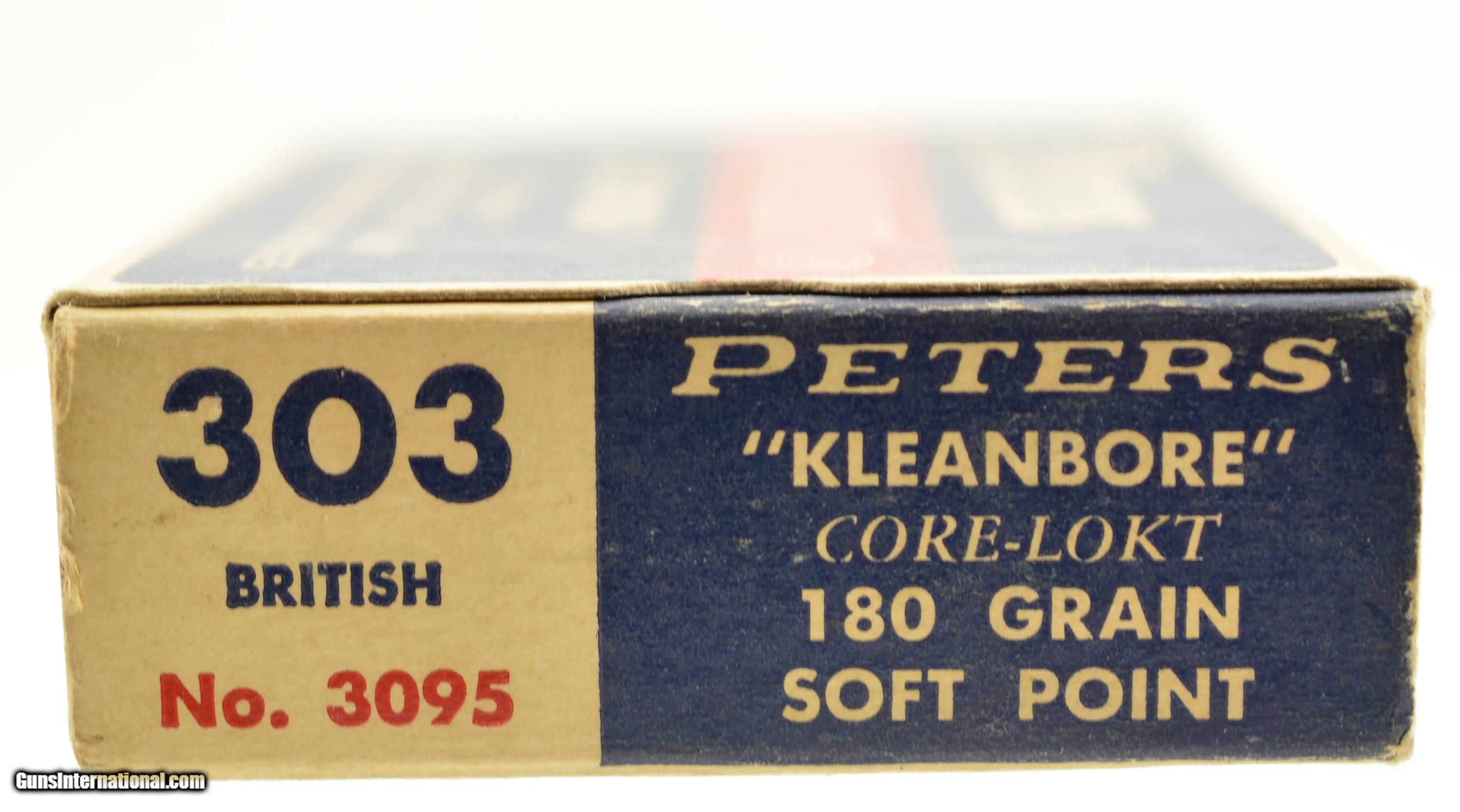 Description: This is a full box, 20 original rounds, of .303 British ammunition manufactured by Peters with 180 grain CORE-LOKT bullets and Kleanbore priming. The 1960's blue and red stripe box is solid with very minor scuffing and writing on the back side. The cartridges are in excellent condition. SOLD Manufacturer: Peters Model: Ammo Caliber Info: .303 Gauge Info: .303 |